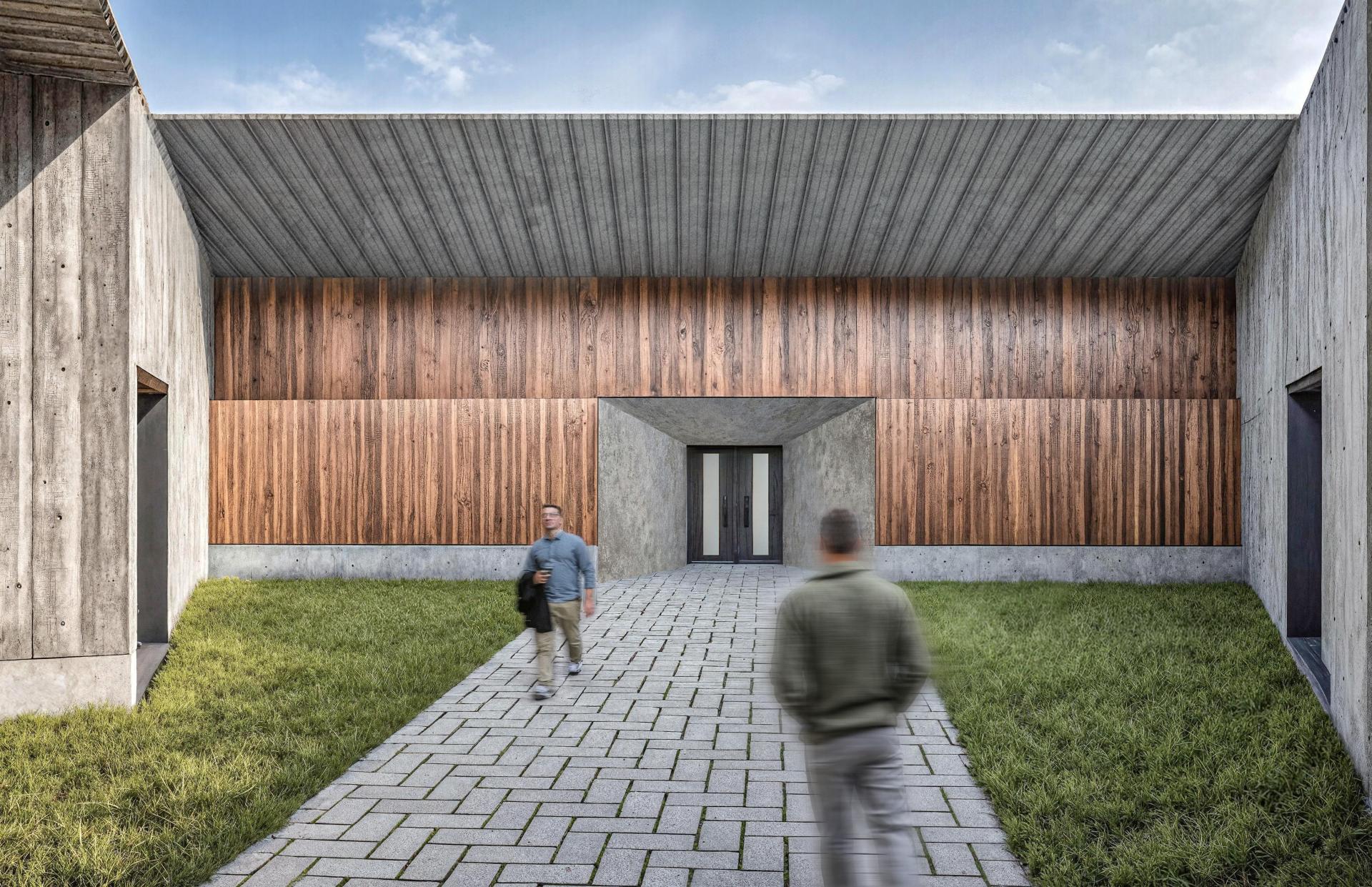 Folded Rowing Hub is a sports and recreational facility located on the edge of a lakeside park in upstate New York, designed to serve a university rowing program. It organizes six pitched-roof volumes in a continuous, corner-to-corner arrangement that frames two internal courtyards—spaces that anchor circulation and foster social gathering.