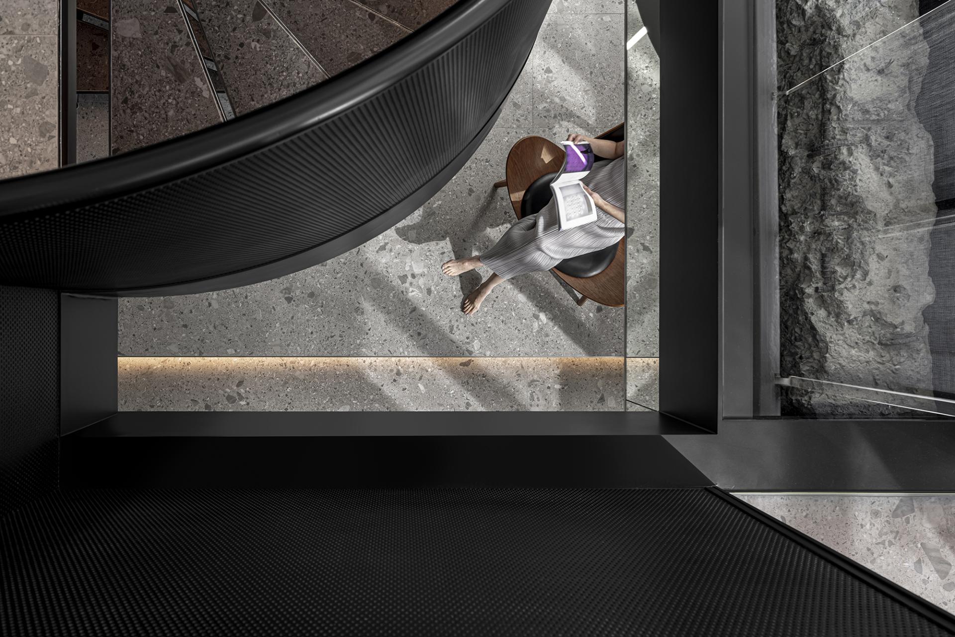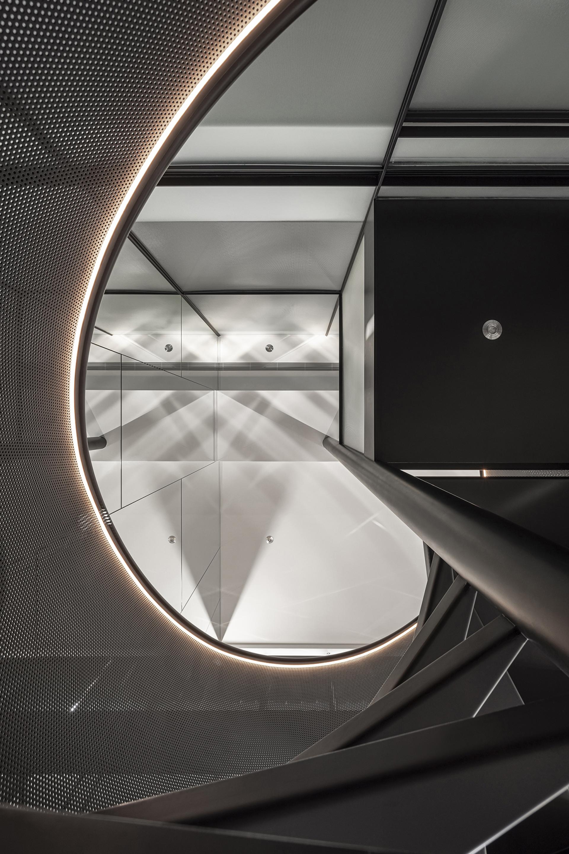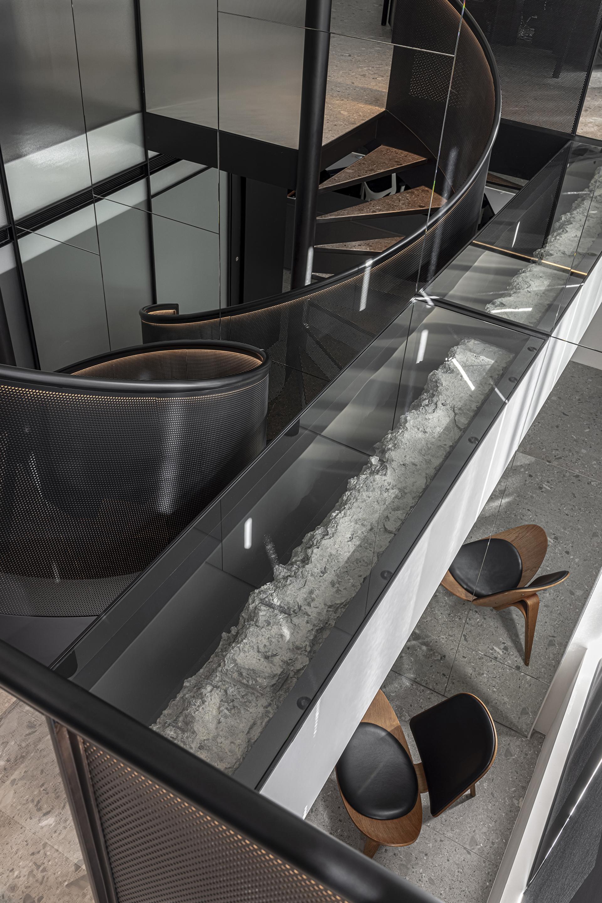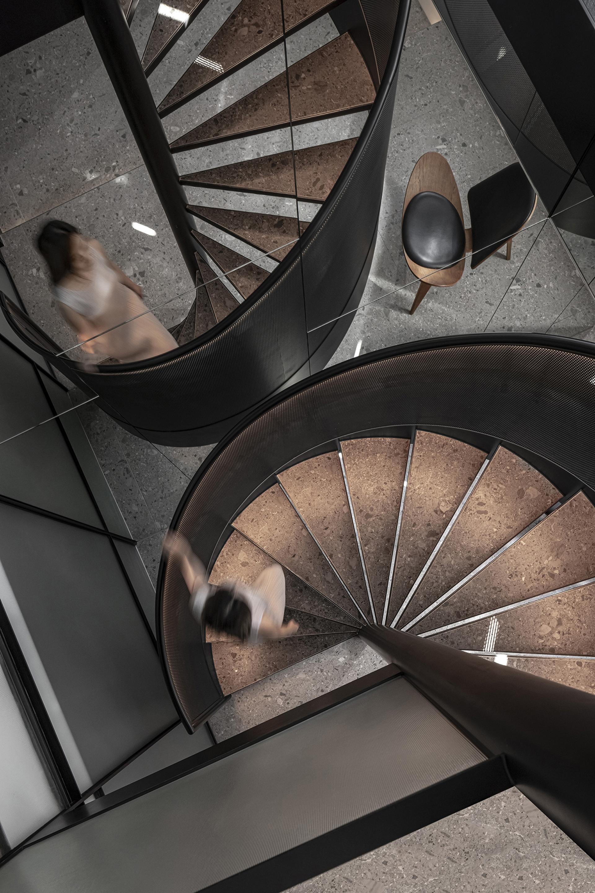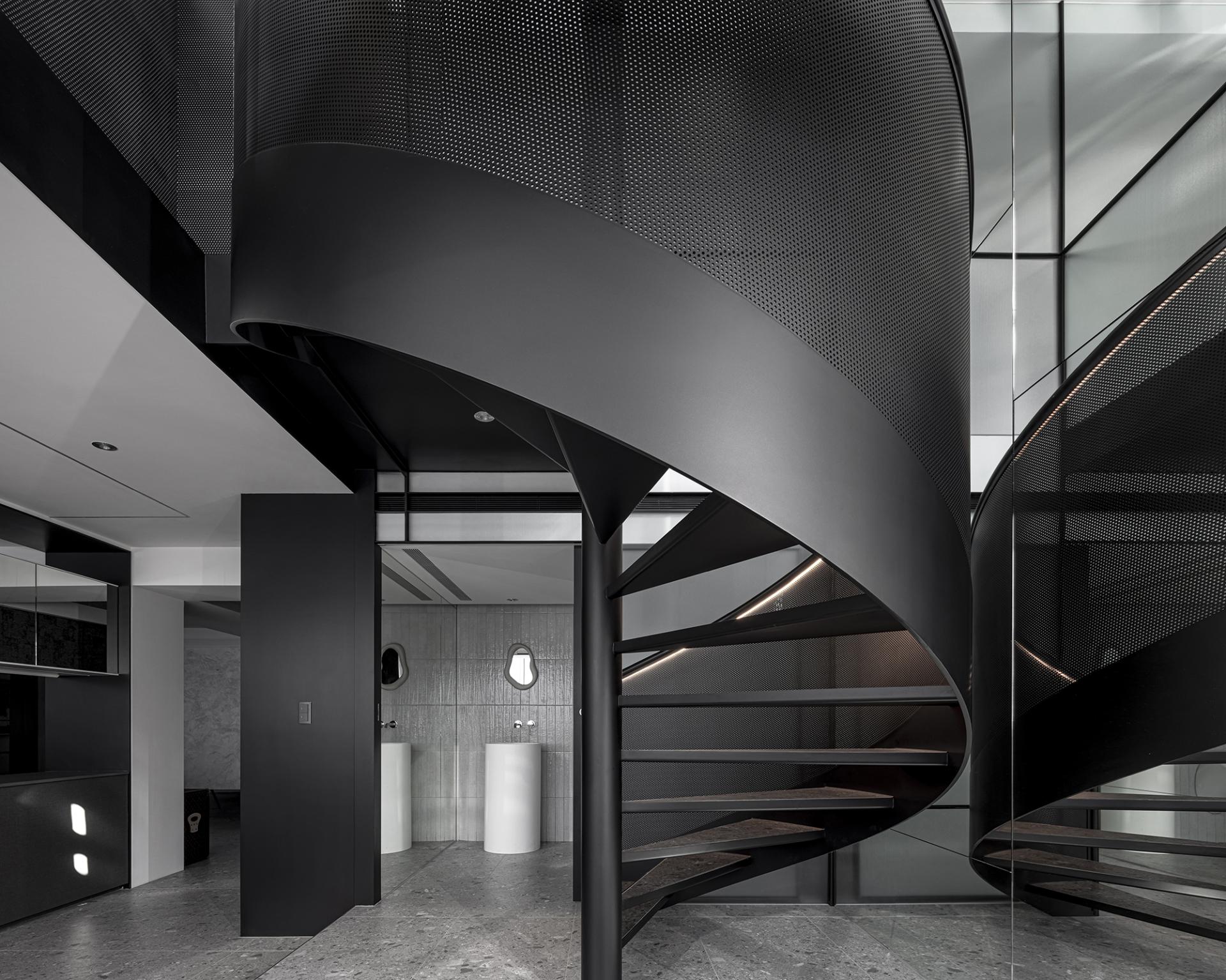 The spiral staircase acts as both a functional and symbolic center, guiding light vertically while linking programs and hinting at the continuity and transformation of the enterprise. The office avoids rigid walls in favor of curved screens, material shifts, and hidden storage to allow flexibility between working, hosting, and living functions. A black-gray-white color scheme combined with matte metal and mineral textures creates a calm, orderly rhythm. The design incorporates eco-friendly materials, LED lighting, and natural ventilation strategies to fulfill a modern vision of an energy-efficient, sustainable workspace.