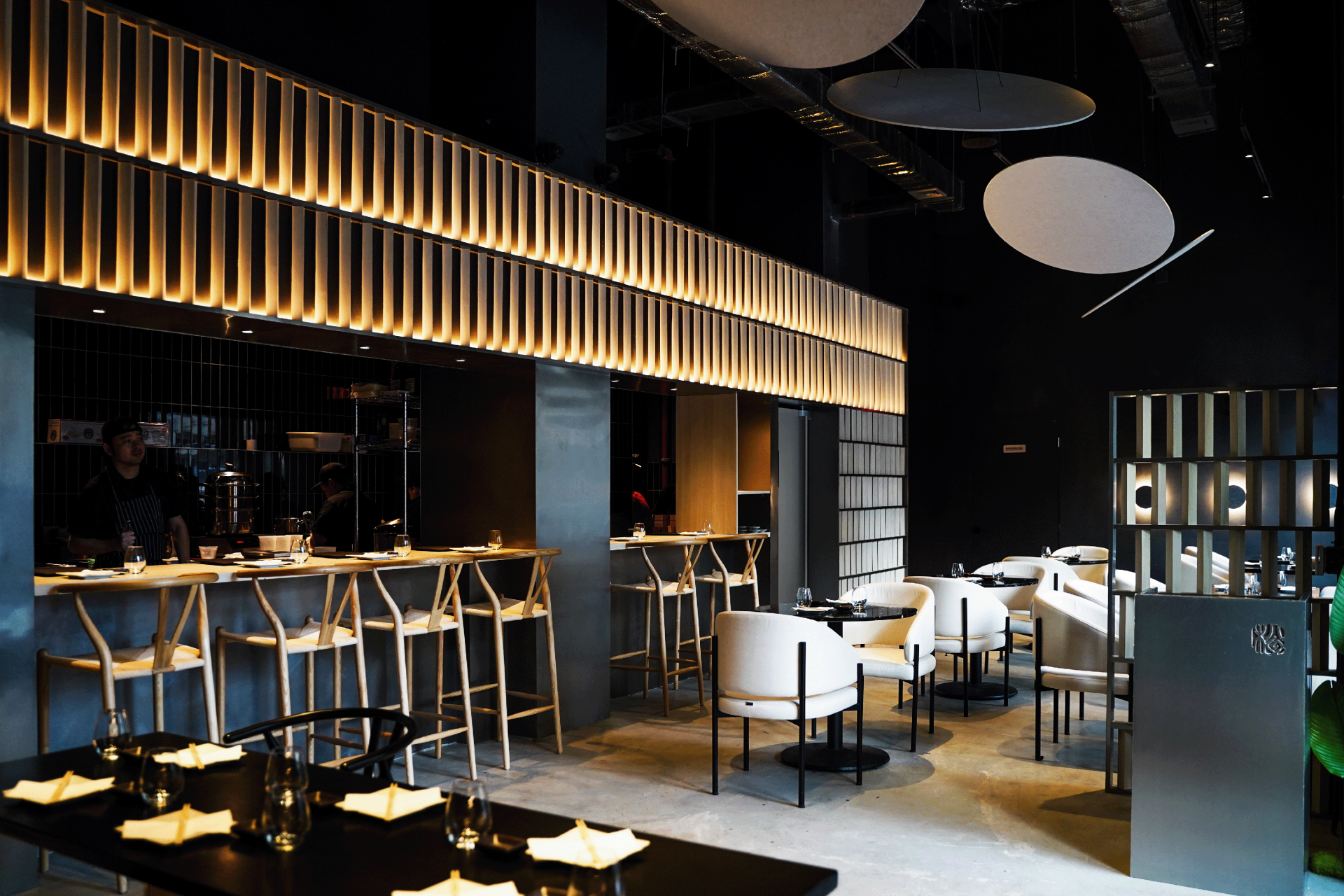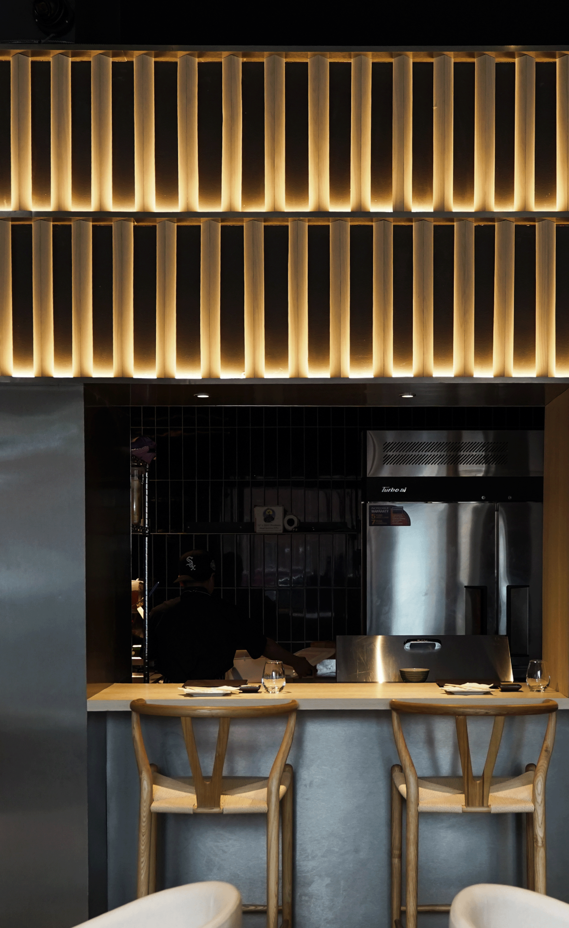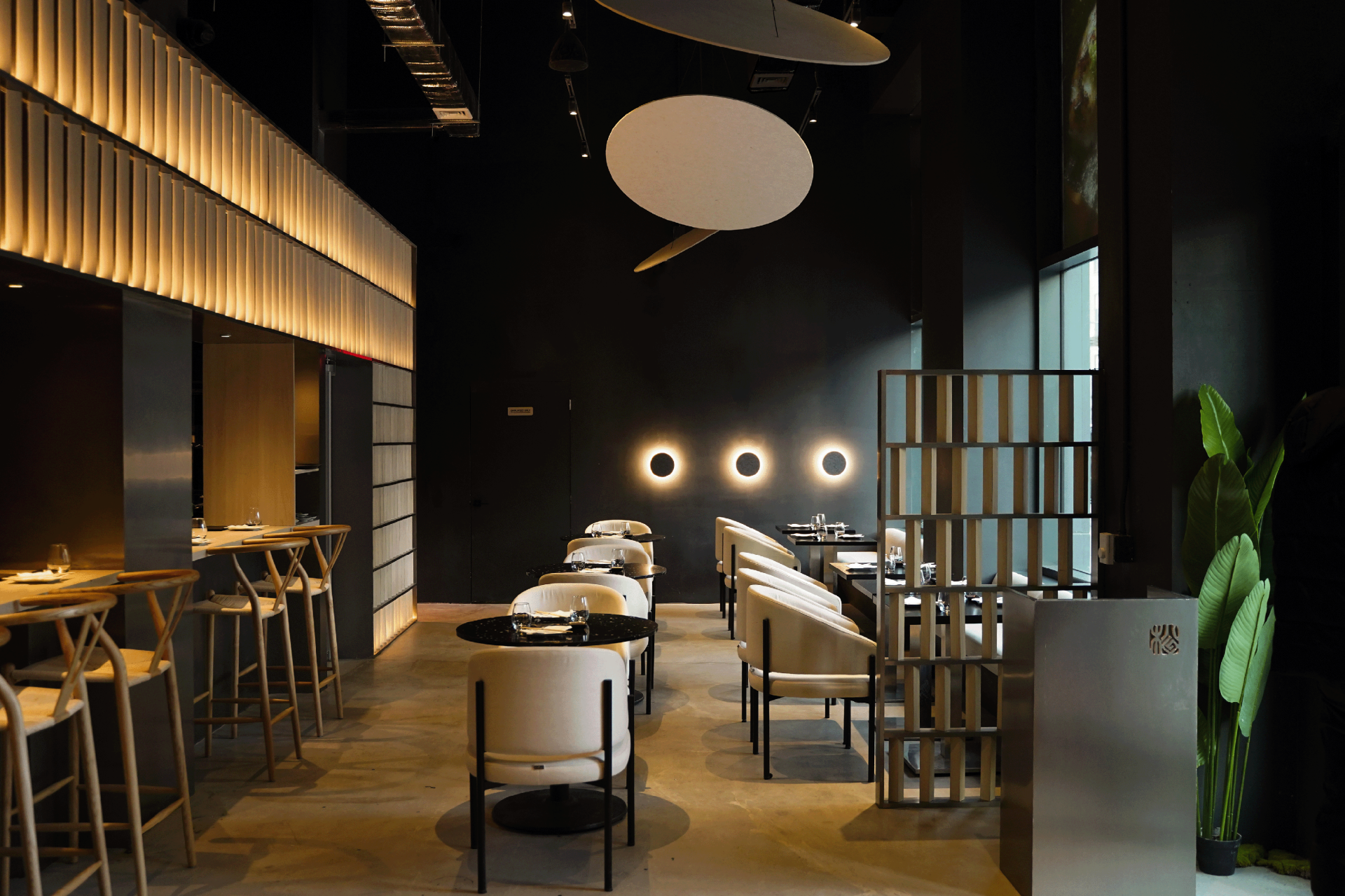 The interior design of Matsunori embodies a sophisticated yet sleek interpretation of modern Japanese aesthetics, guided by a rhythmic layout that gracefully transitions guests through an intimate, moody dining experience. Dark, luxurious design such as rich patterned element and subtle metallic accents create a refined atmosphere, while clean lines and minimalist furnishings convey elegance and contemporary simplicity. Carefully layered lighting enhances the ambiance, crafting pools of intimacy and dramatic shadows that emphasize architectural details. Cultural inspirations, including contemporary interpretations of traditional screens and subtle nods to natural light, illustrate the restaurant’s dedication to authenticity and craftsmanship, resulting in a truly immersive and memorable sensory experience. Together, these thoughtfully curated sensory elements transcend traditional restaurant aesthetics, creating a holistic and memorable dining experience. The sophisticated interplay of lighting, tactile materials, subtle fragrances, interactive visual access to culinary artistry, and carefully managed acoustics work seamlessly together, providing diners with an emotionally resonant journey that engages all the senses.