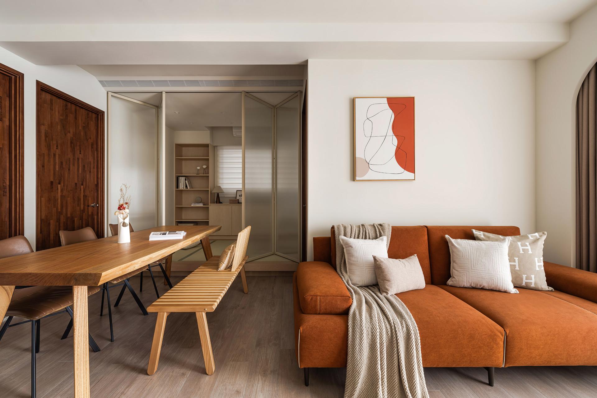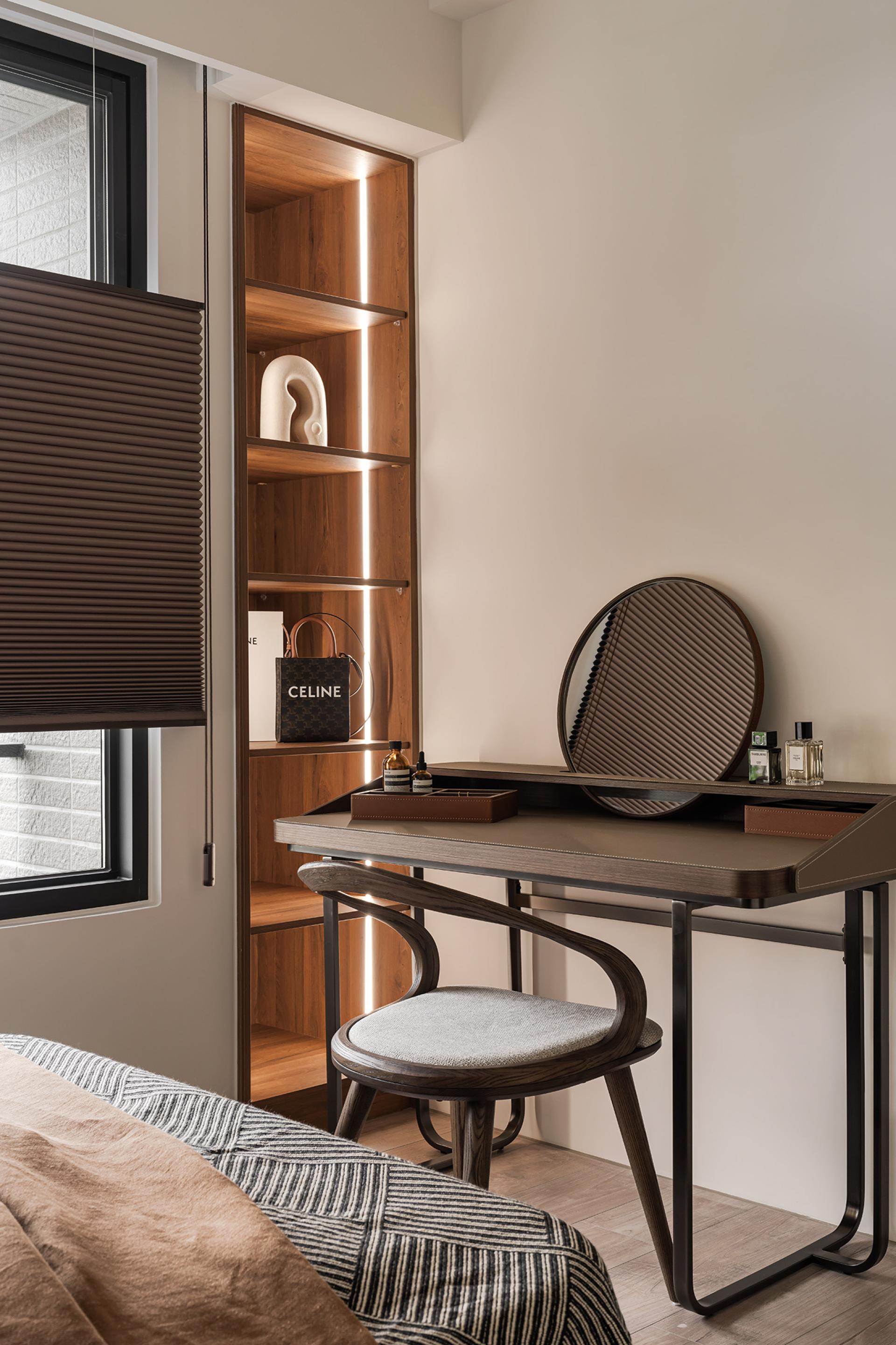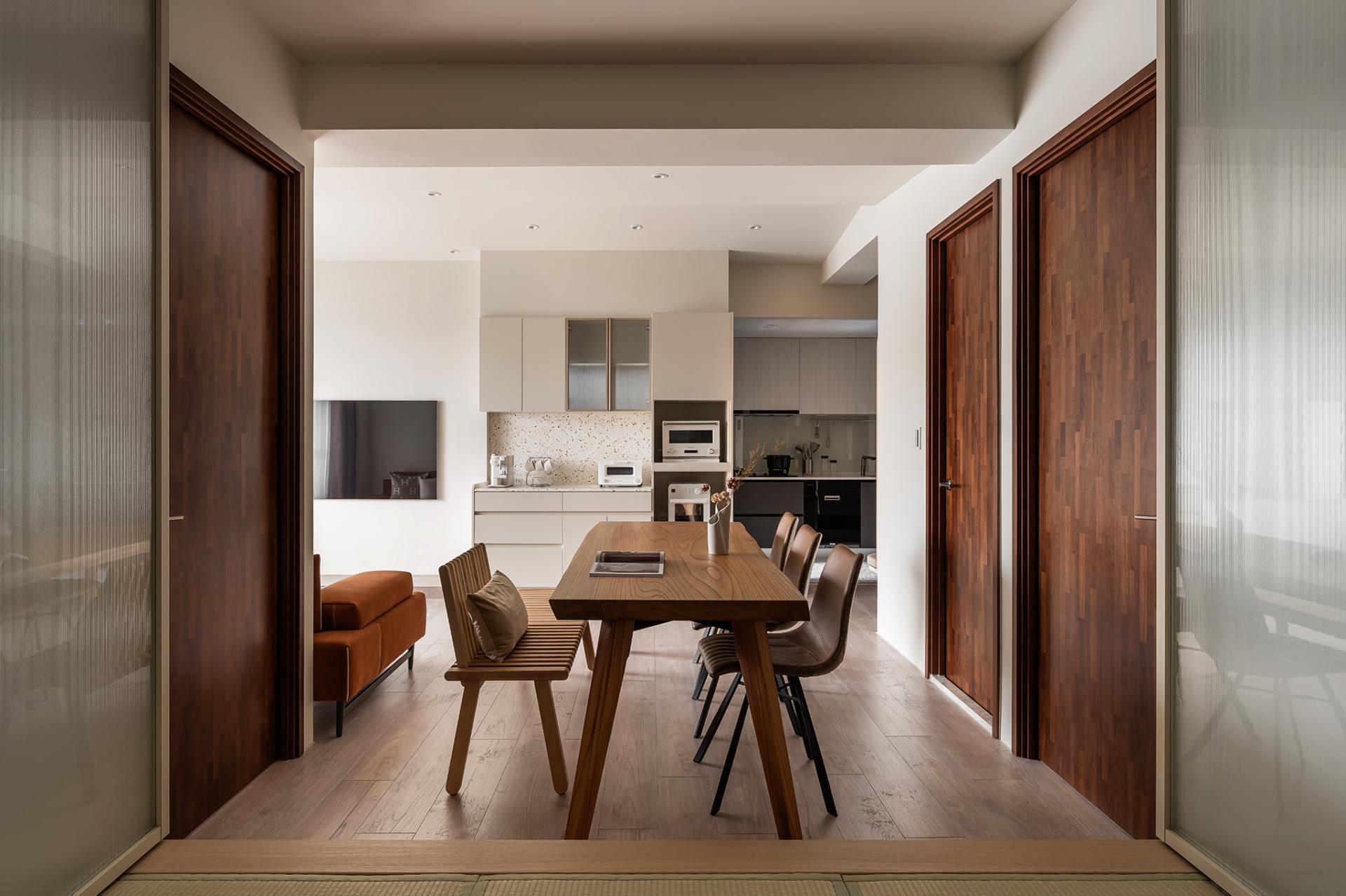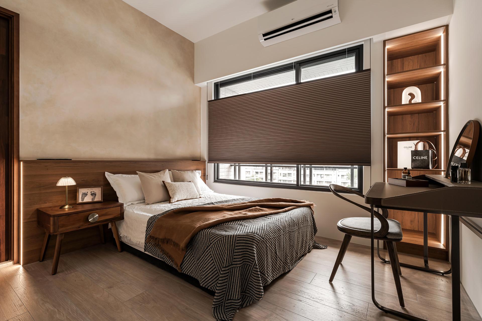 Transitioning into the tatami room, onew will find that a raised design accented with rounded corners and suspended folding doors. This intentional design choice not only minimizes dust accumulation but also fosters a clean, crisp visual rhythm that enhances the tranquility of the space.Finally, the master bedroom continues the theme of warmth with its rich wooden textures. Here, linear light strips are elegantly embedded in the headboard wall, providing a gentle glow at night.