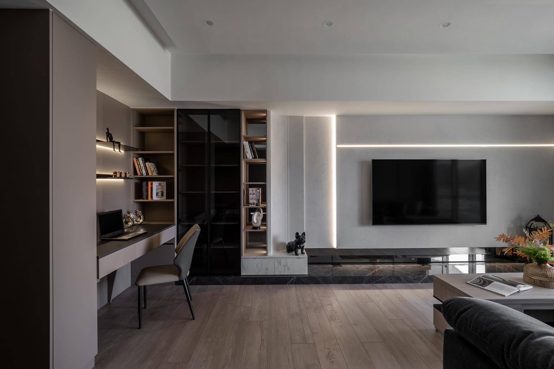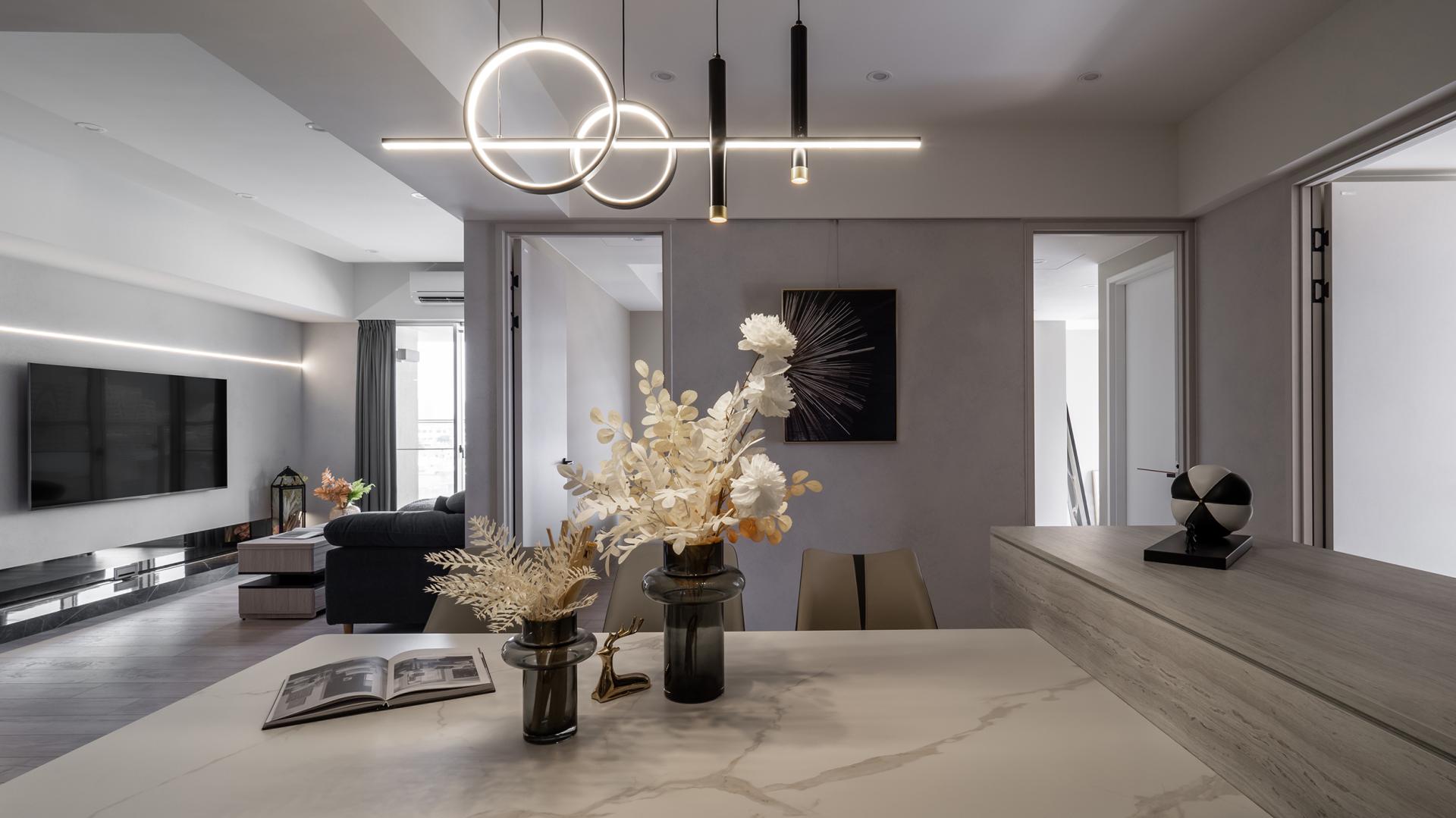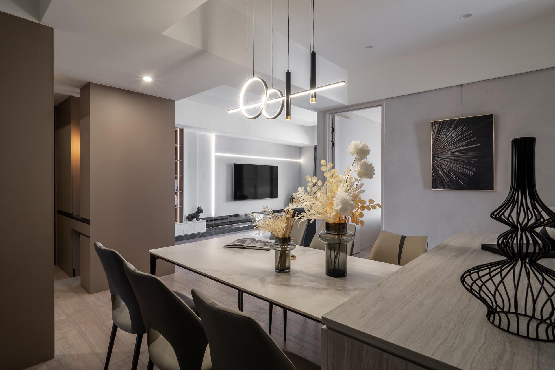 "Veiled Light, Flowing Years" is a holiday home for a family of four, located on a high floor in Taichung’s Beitun District. Rooted in modernist principles, the design layers low-saturation colors with artistic finishes, glass, and metal, to craft a refined and tranquil atmosphere. The TV wall integrates lighting and structure for a clear focal point, while a dual-sided cabinet connects the entry and workspace, forming a fluid, open layout.