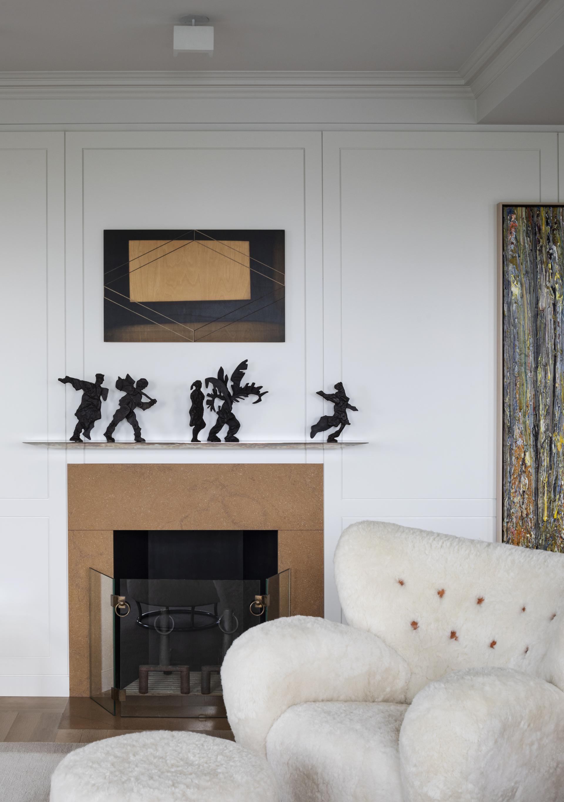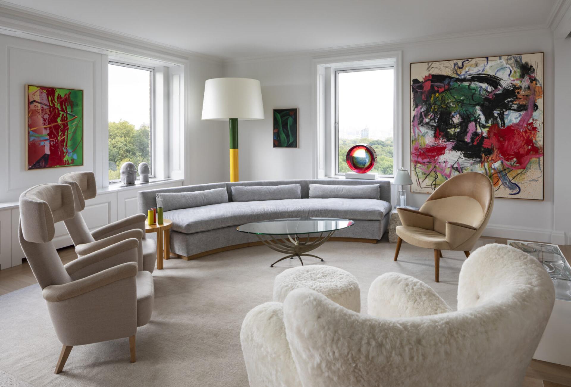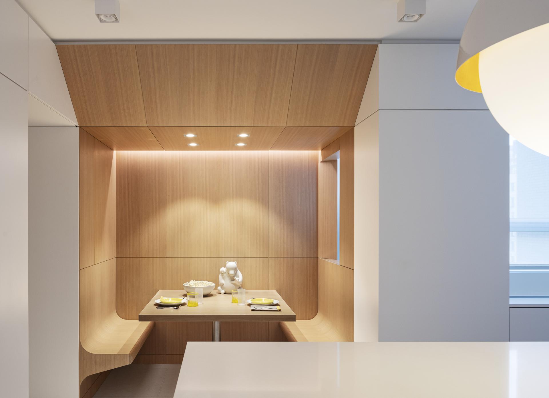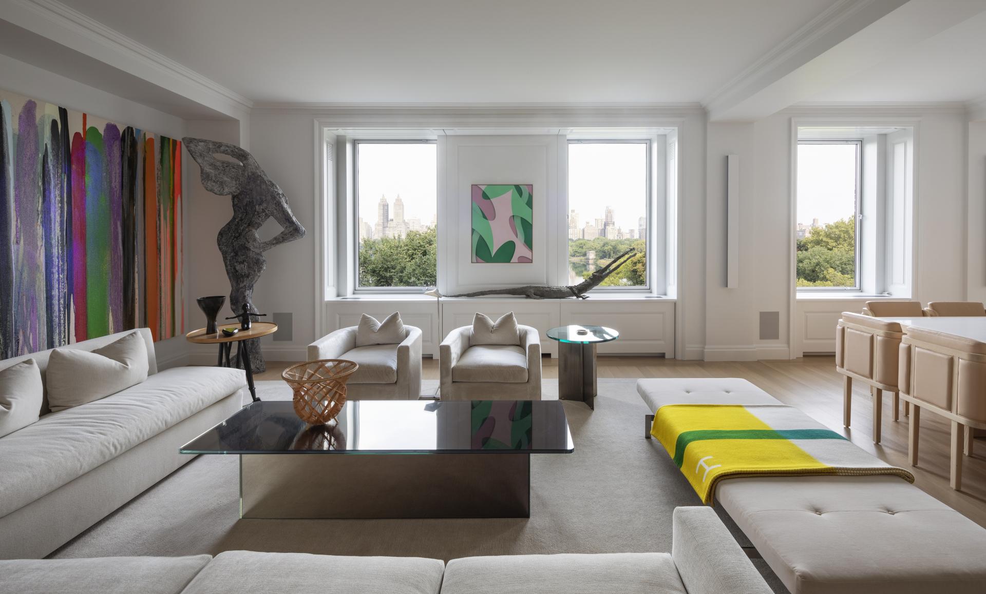 A continuous window wall expressed as a bay system integrates heating, ventilating, storage and a motorized window treatment unifies the living room, family room and dining room. Partitions between these public areas remain freestanding, and the wall itself becomes a clearly articulated element, which emphasizes and frames the views of the Reservoir, Central Park, and the George Washington Bridge. The space appears open and light is allowed to flow freely between the rooms.