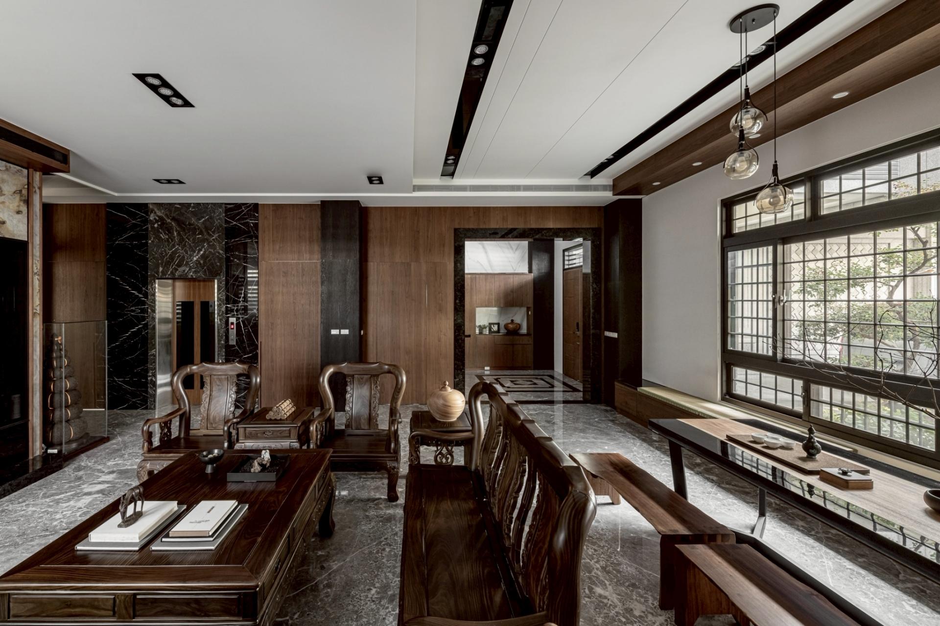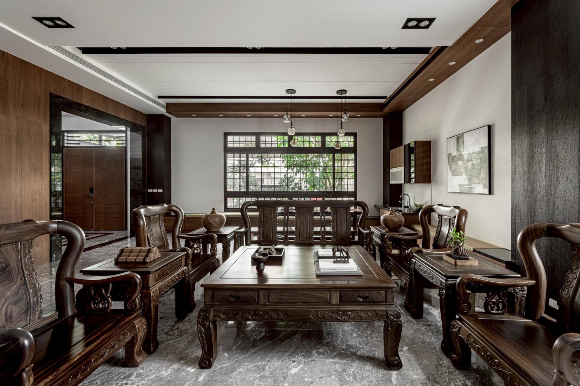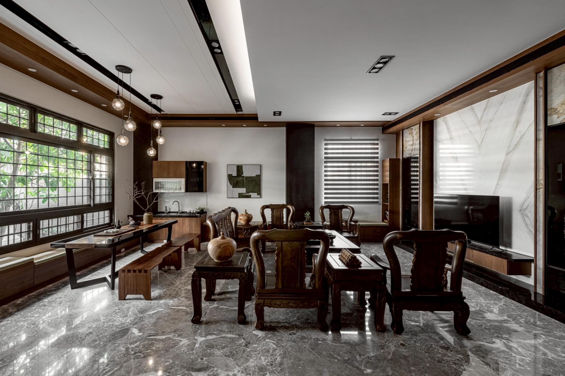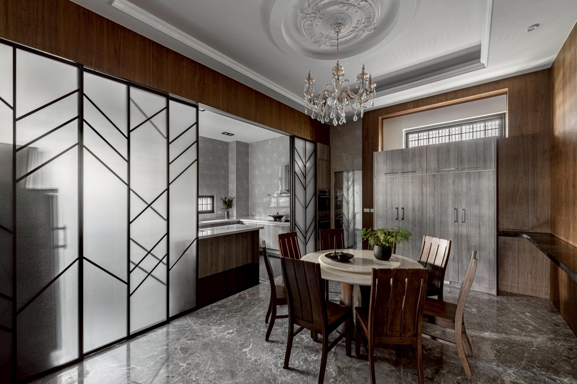 In the communal areas, traditional solid-wood Chinese style furniture sets the tone. The hand-carved textures embody the passage of time and cultural heritage. The spatial framework, however, unfolds through clean lines. With rhythmic blocks, linear detailing, transparent glass, and the dance of light and shadow, the gravity of traditional Chinese style transforms into a contemporary visual order. The elegance of Chinese aesthetics is no longer bound to intricate ornamental carving, but distilled into a quiet spirit that resides in the harmony of proportion and material. Framed by the windows, outdoor greenery reaches into the interior, extending the line of sight. Sunlit tree branches and leaves resonate with the stone and wood within, creating a balanced symbiotic relationship between interior design and environment. In the dining and kitchen areas, sliding doors define the boundaries. The use of transparent yet continuous glass allows light to flow seamlessly, while maintaining the independence of each function.