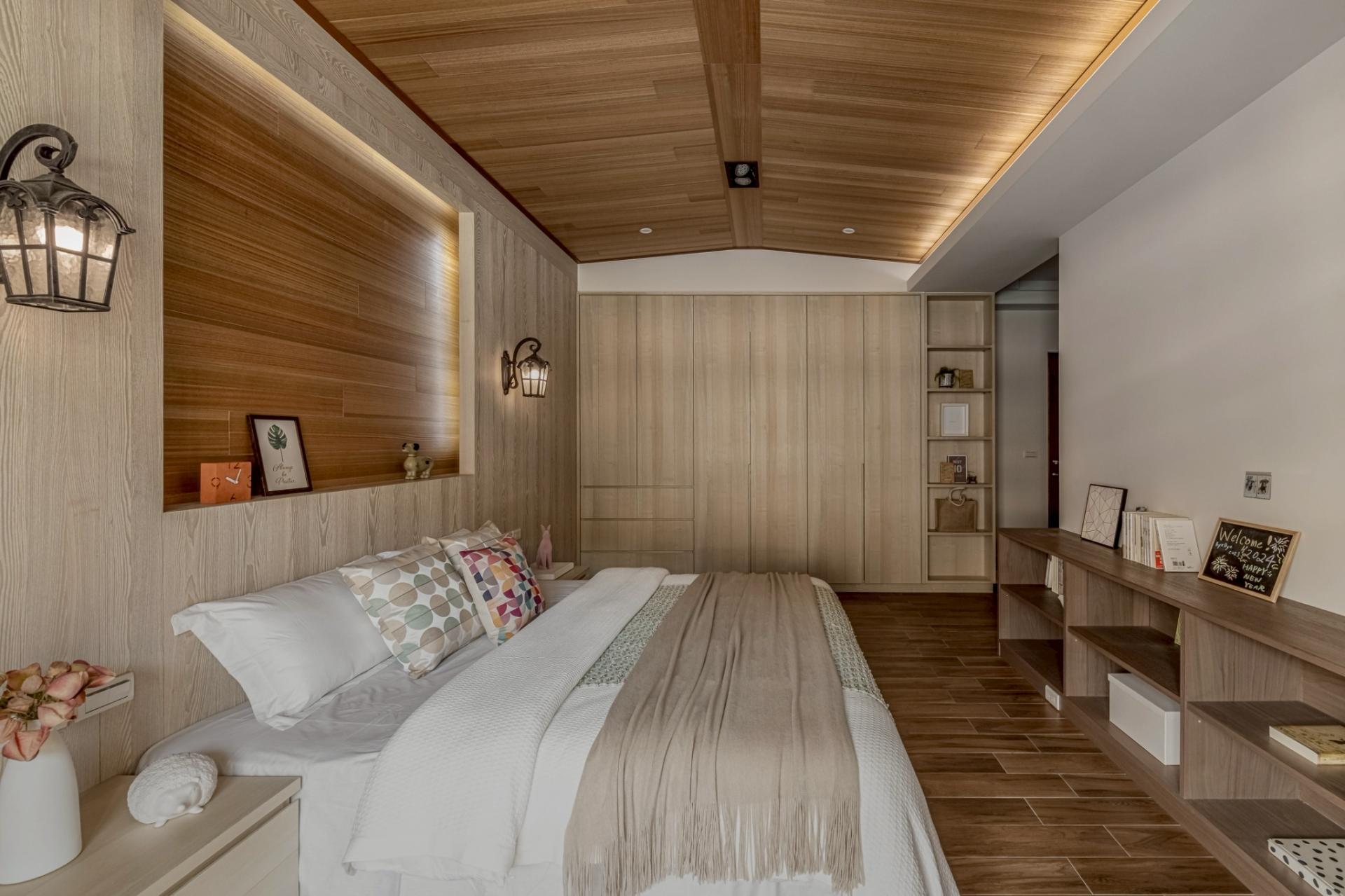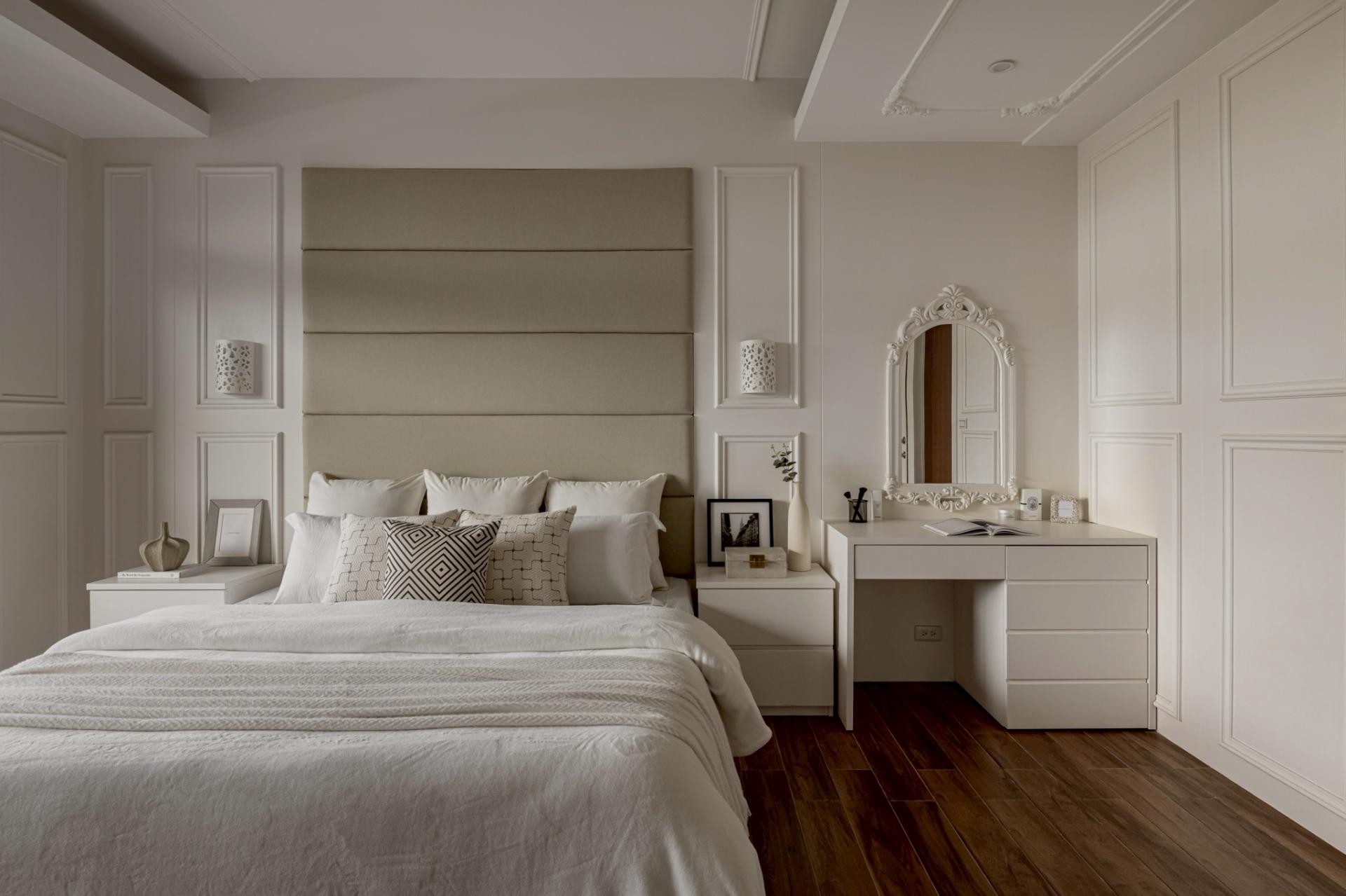 Both bedrooms are tailored to reflect the residents’ preferences. The master bedroom continues the warm wood hues, with ceiling and walls clad in timber. Softly diffused indirect lighting creates a peaceful and relaxing atmosphere for sleep. The secondary bedroom embraces an American style. Detailed wall moldings and carved mirror frames convey elegance and refinement, imbuing the space with a tranquil, graceful atmosphere.