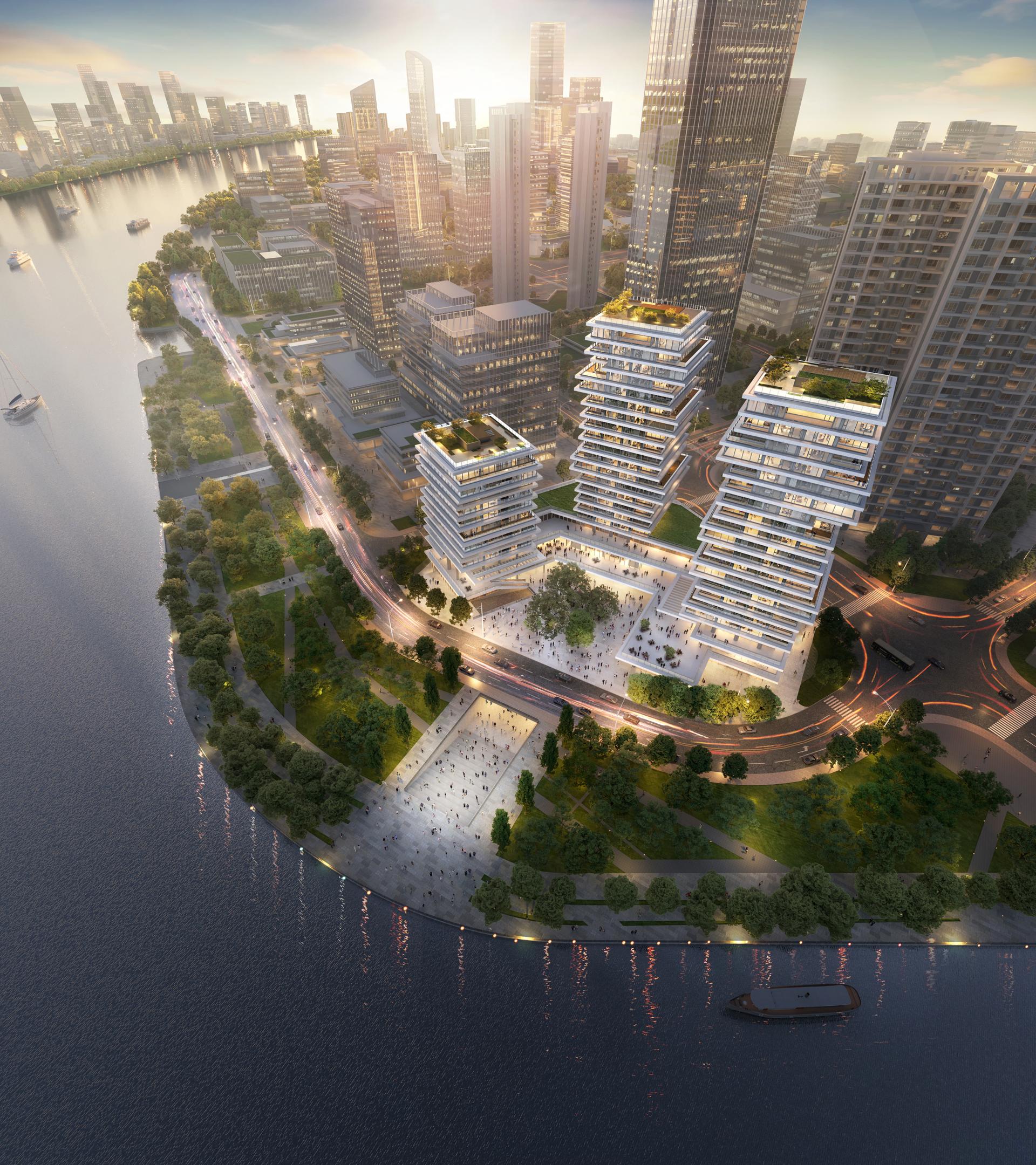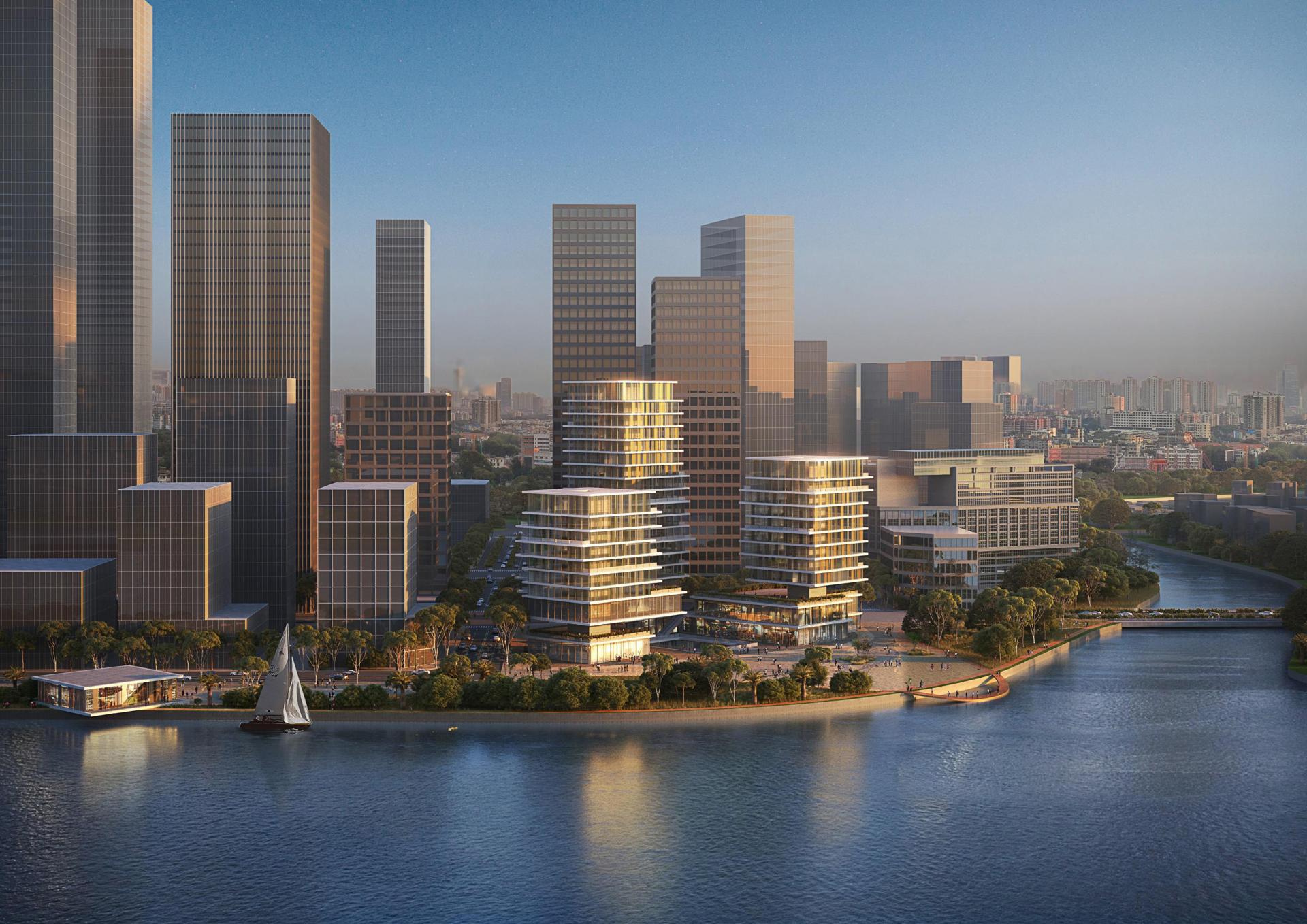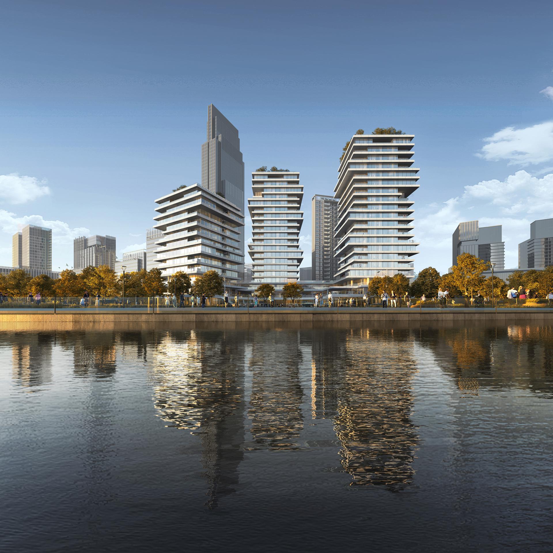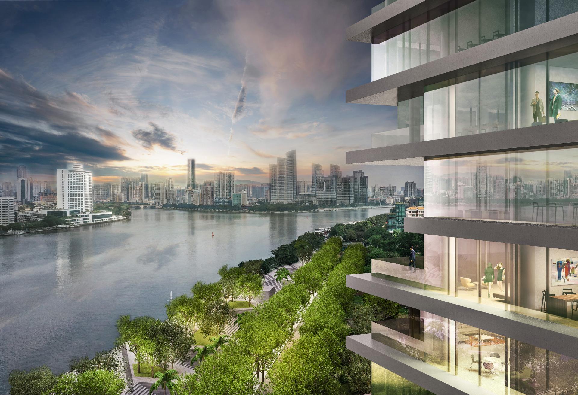 ONE SWAN BAY, Camel’s first real estate project in Guangzhou, stands proudly at the heart of Baietan CBD—the core of one of Guangzhou’s five world-class landmark business districts. Surrounded by premier river views, the convergence of three major rivers, and the Bay Area’s headquarters economic hub, this rare location commands city-wide prestige. Upholding the brand values of freedom, resilience, and innovation, ONE SWAN BAY combines international design expertise with beautiful architecture and exceptional craftsmanship to create a new standard of high-quality living for Greater Bay Area elites. Located on a peninsula-like site, ONE SWAN BAY enjoys distinctive waterfront views. The building arrangement makes full use of the city’s riverside greenbelt, creating a harmonious layering between the urban fabric, architecture, and river scenery—where the unique river views become the architectural anchor. The design centers on human experience, with three towers configured to optimize views: two 80-meter towers set back on the site, and a 50-meter tower positioned along the riverfront. Each tower features a floor plate of about 600m2, resulting in slender building forms with comfortable spacing between them. This arrangement not only offers pleasing aesthetics but also promotes a diverse urban lifestyle by providing public spaces with optimal views, sunlight, and natural airflow. Leveraging the corner location, all towers are rotated 45 degrees to face the waterfront. This positioning avoids direct alignment with other towers and adjacent structures, enhancing privacy for residents. Additionally, the rotation improves views and encourages the natural circulation of wind and light inside the buildings.