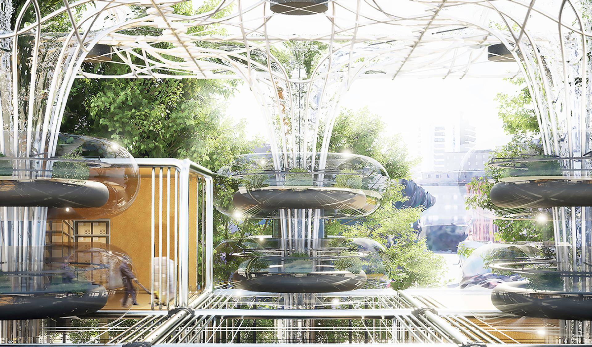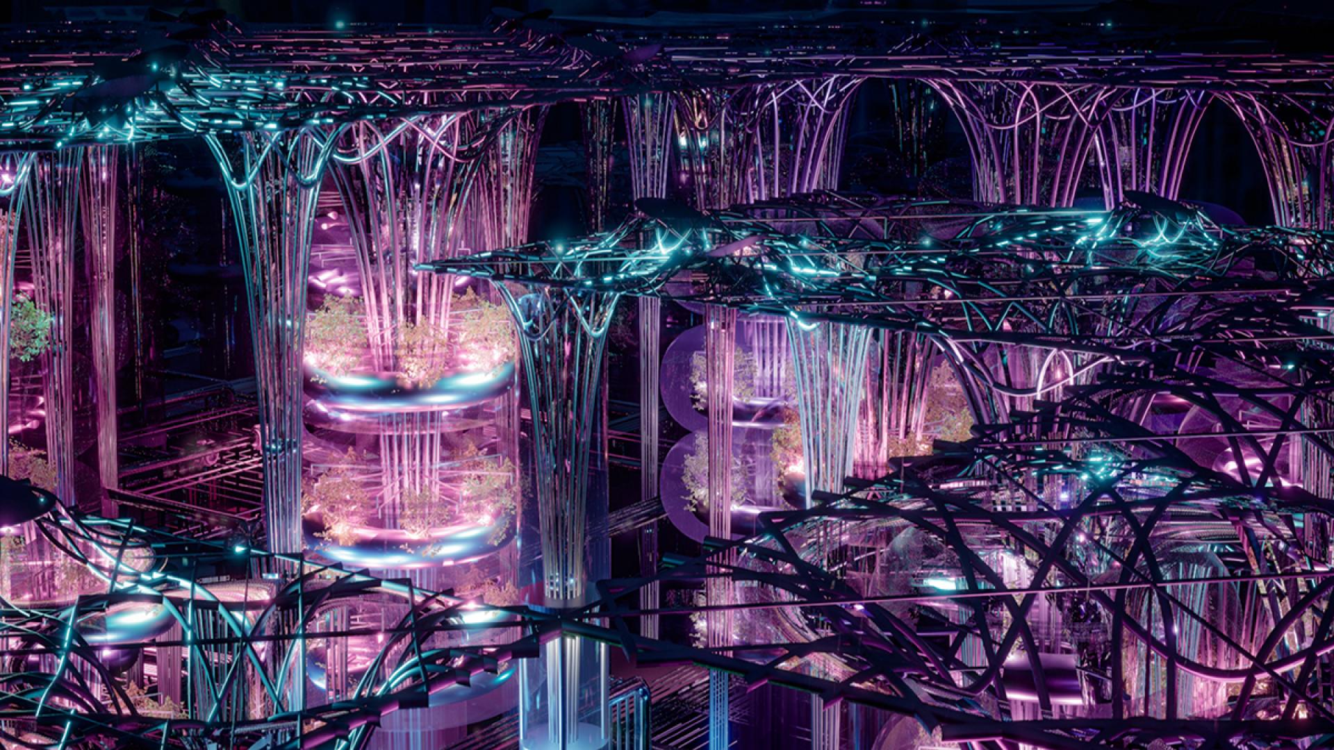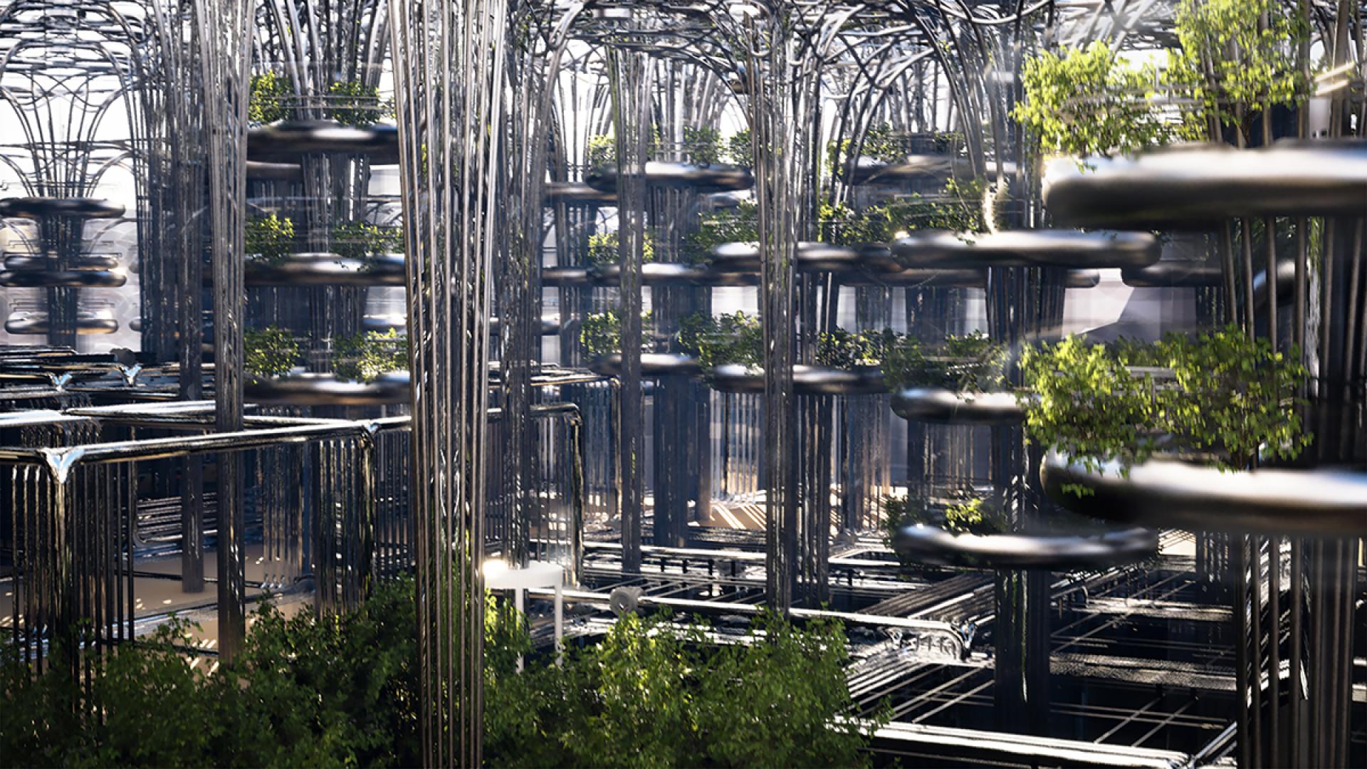 Hydroponic cotton is grown with the aid of supplemental LED lighting and robotic harvesting arms. Once matured, cotton is transferred through vertical pipes into processing areas within the factory below. This closed-loop system models a circular economy, reconnecting agriculture and industry while proposing a new paradigm for sustainable urban manufacturing.