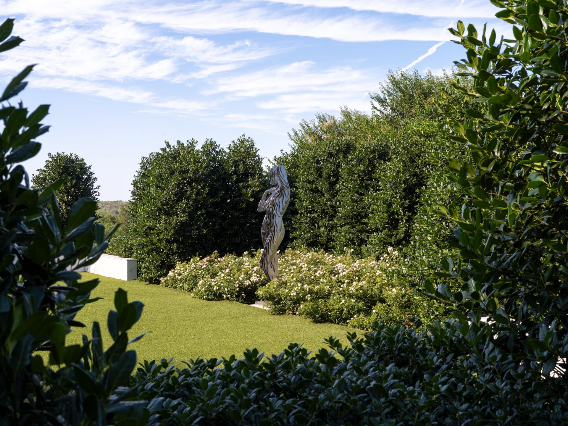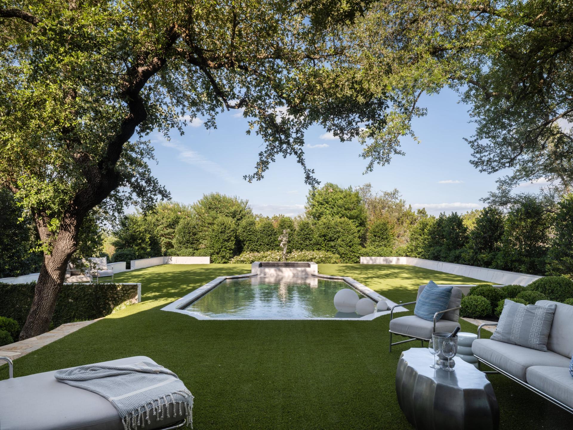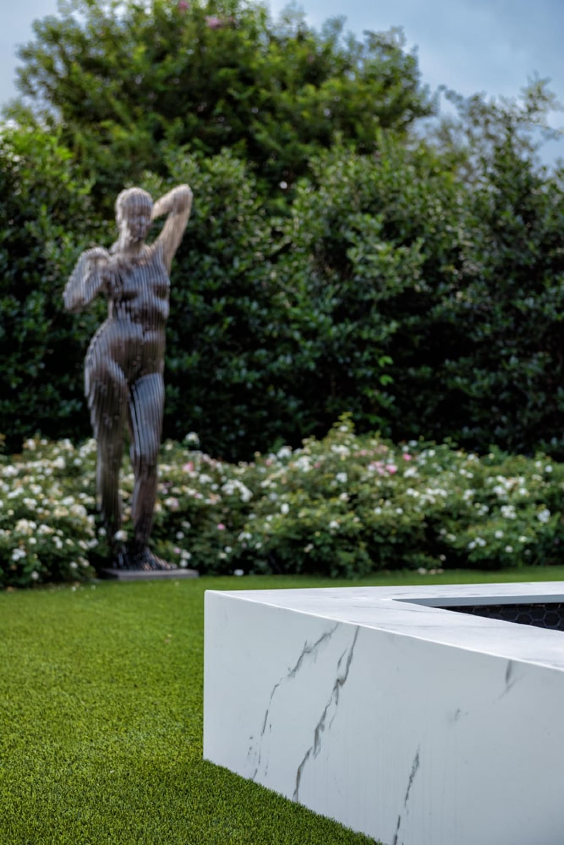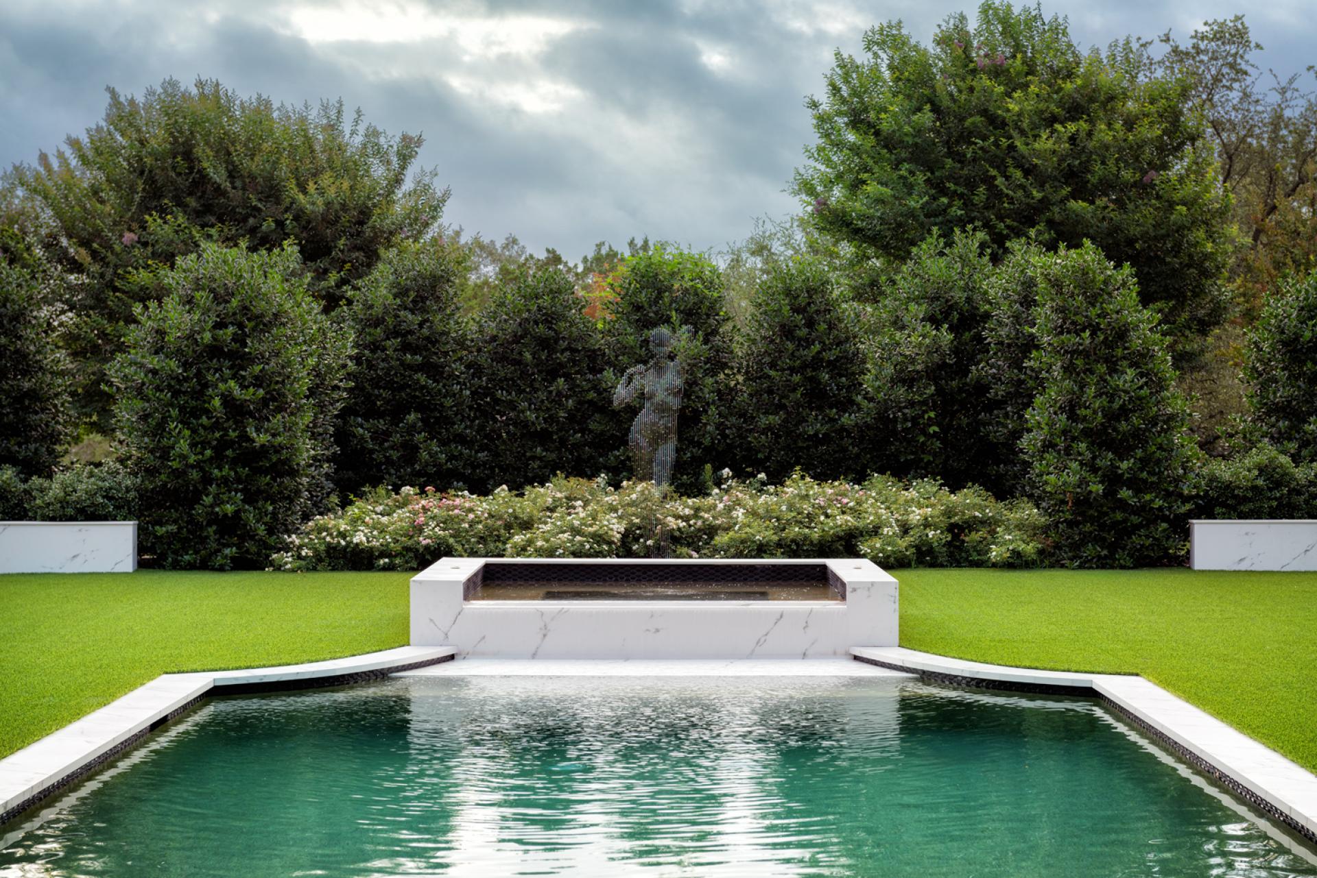The design takes cues from the home’s more traditional architecture but introduces a fresh, modern edge through its formality and materials. A custom kinetic sculpture sits at the far end of the pool, catching the light and shifting in appearance throughout the day—adding movement, artistry, and personality to the space.
