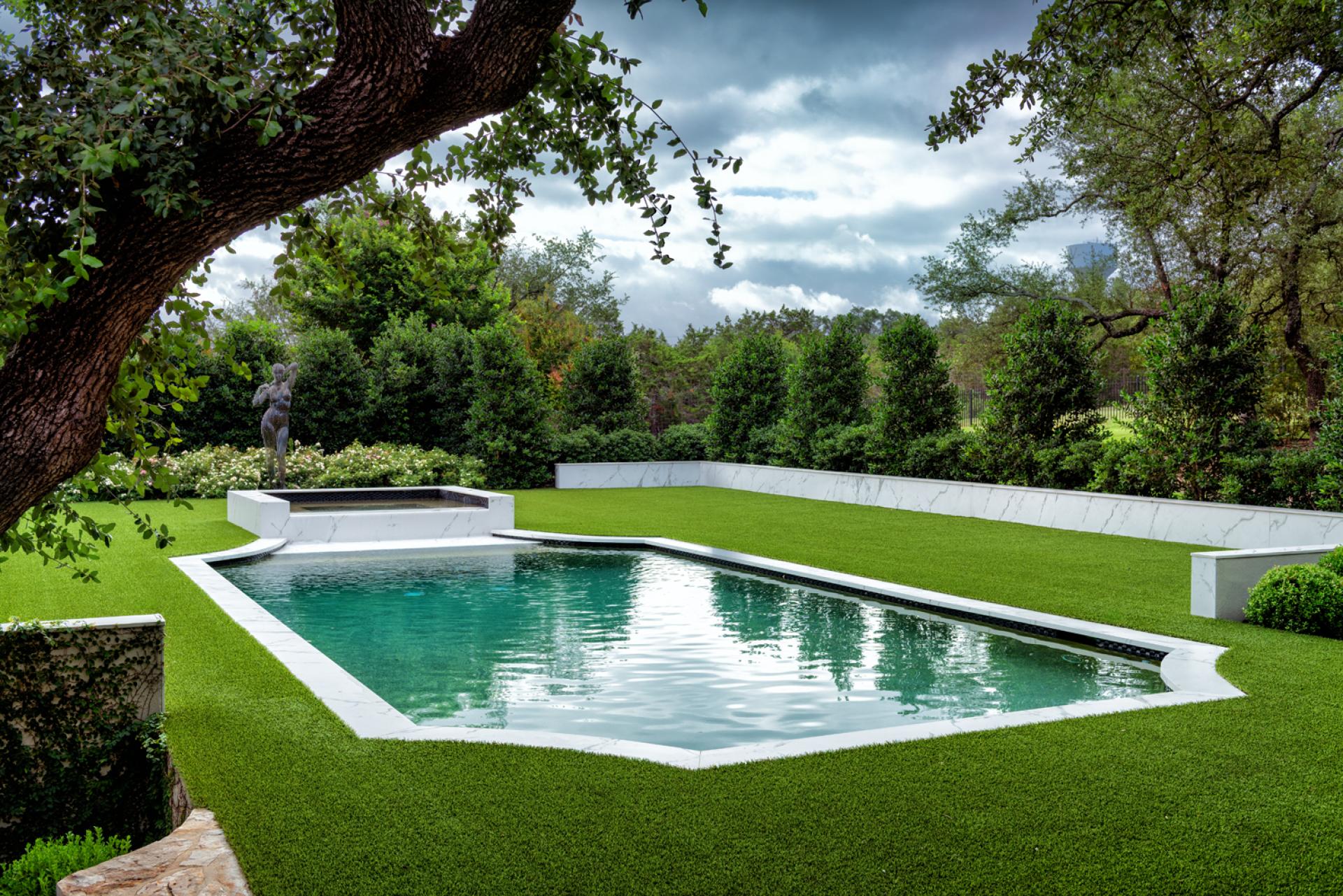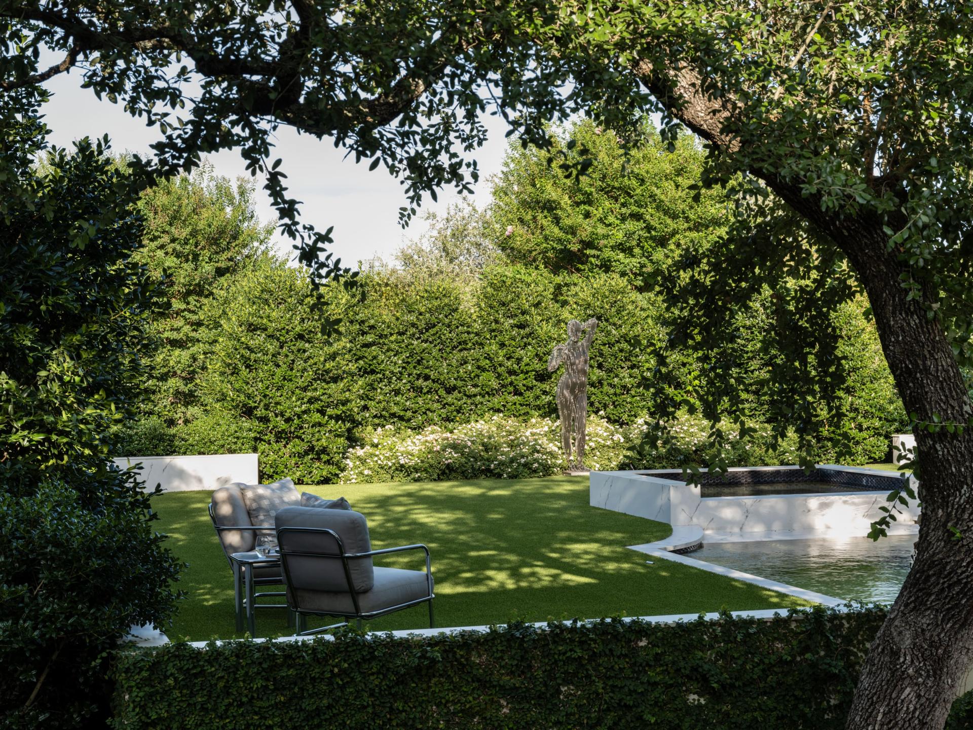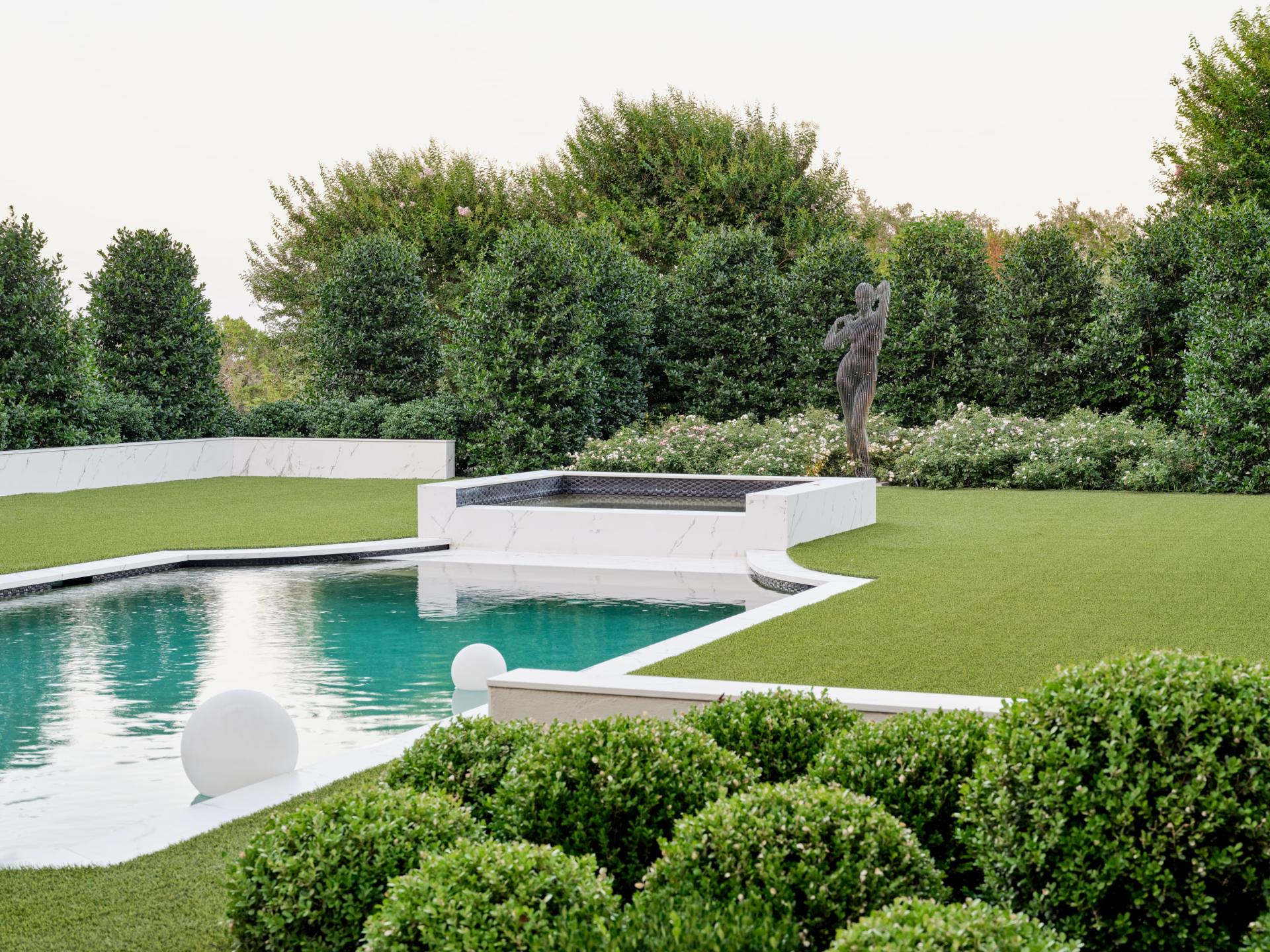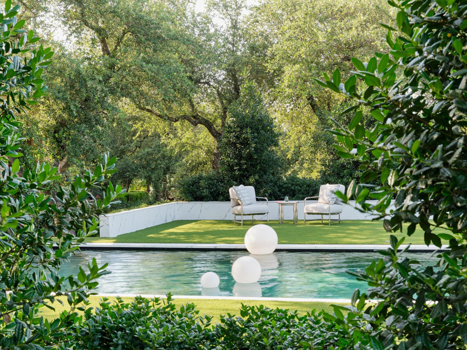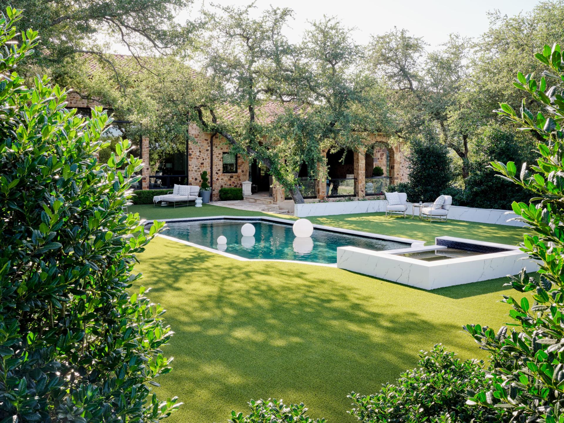 Surrounding the pool, soft synthetic turf creates a barefoot-friendly lawn that’s green year-round without the need for irrigation—a smart, water-conscious solution that still feels lush and luxurious. The garden features evergreen hedges and structured plantings that frame the space with elegance and privacy, creating a peaceful backdrop that feels both refined and alive.