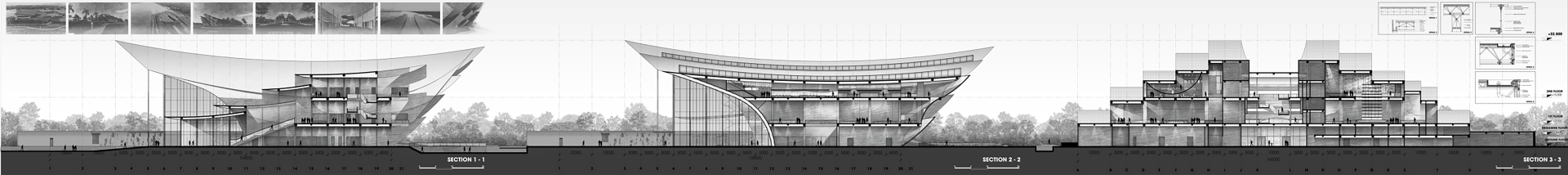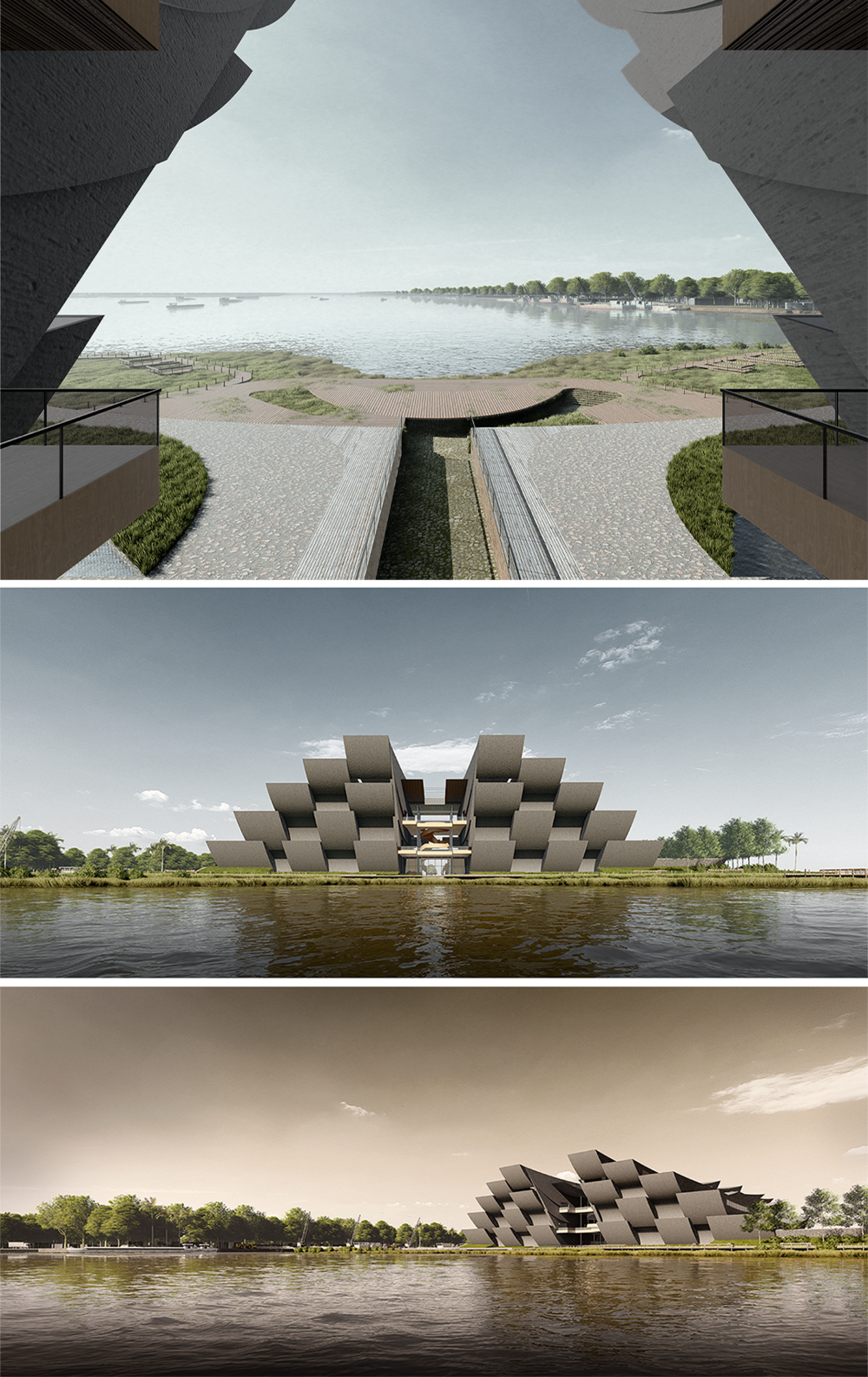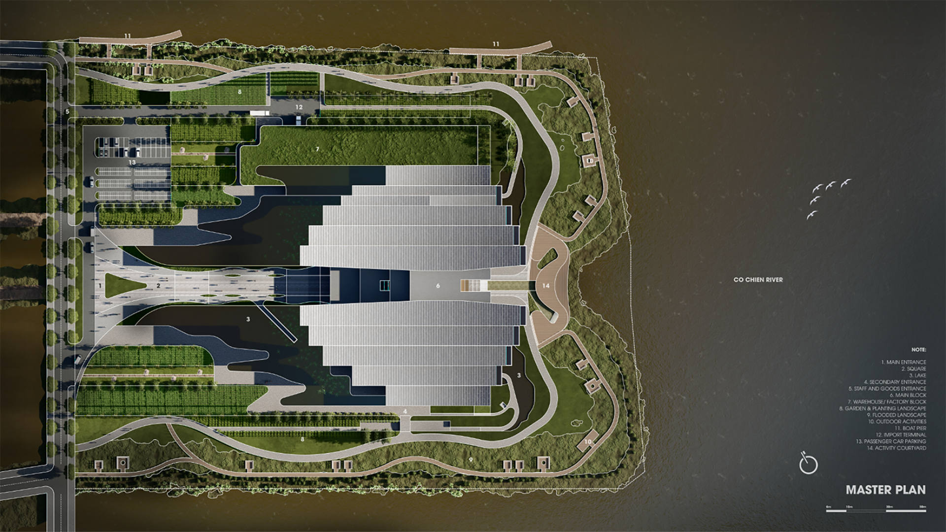 On the overall plan, the main block is located at position 1/3 to emphasize the forward sliding. The front square and the back yard are connected through a radial axis and a large lake in front of the building. The warehouse/factory block is ordered to one side with the least interaction with the remaining river bank, the walkways are arranged around on different elevations to increase interaction for users.