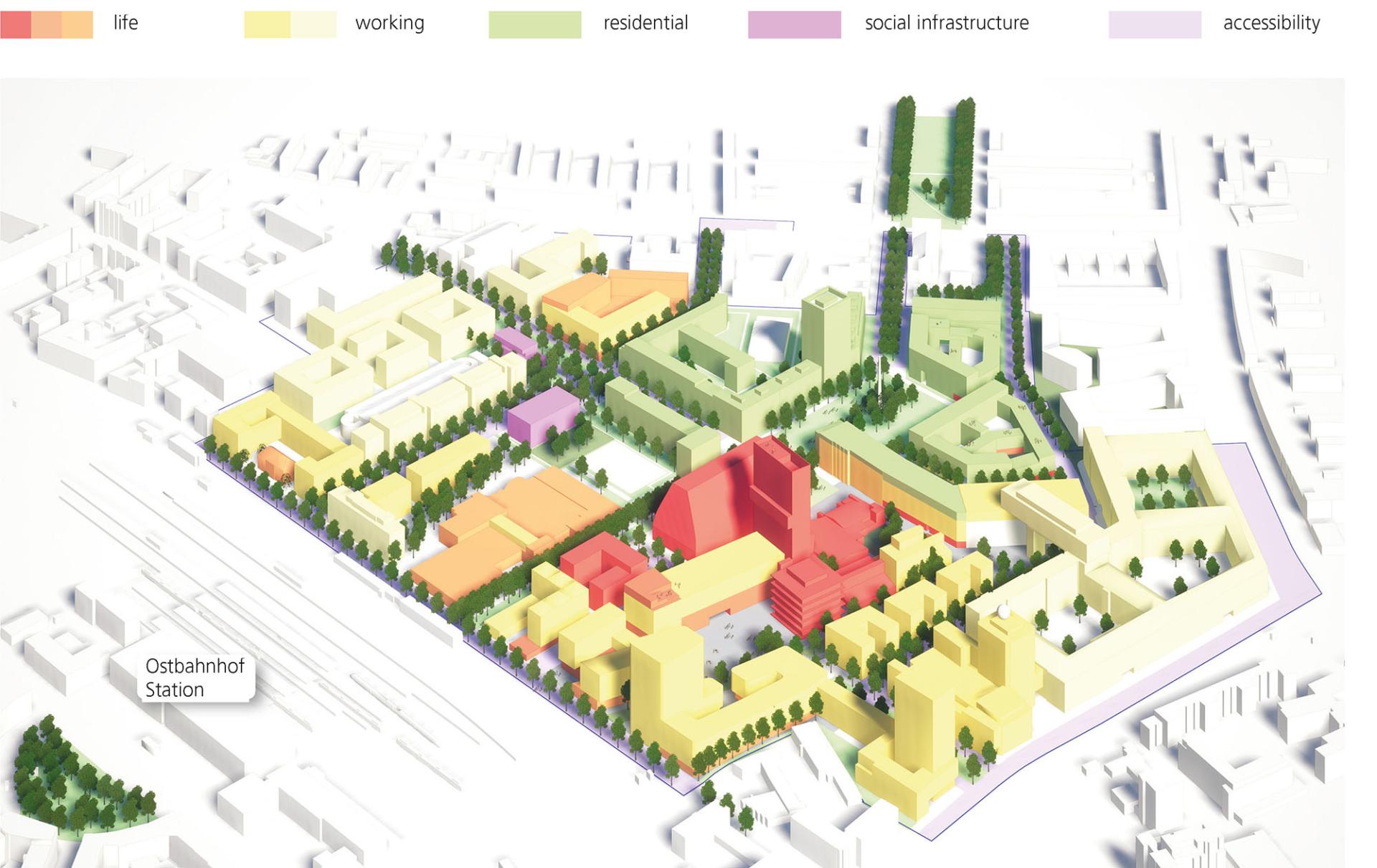 Social sustainability is similarly supported. The update and further integration of uses and users into the new district prevents unnecessary movements.