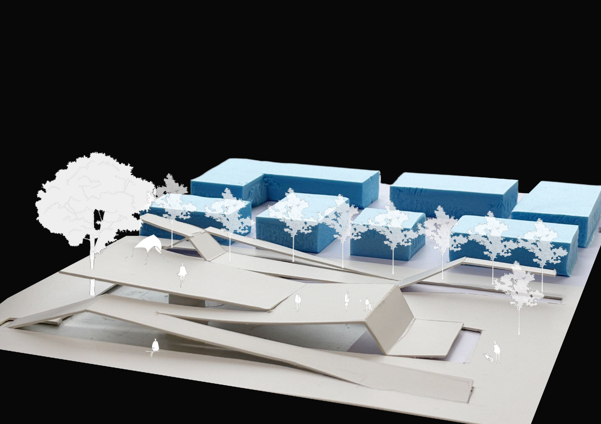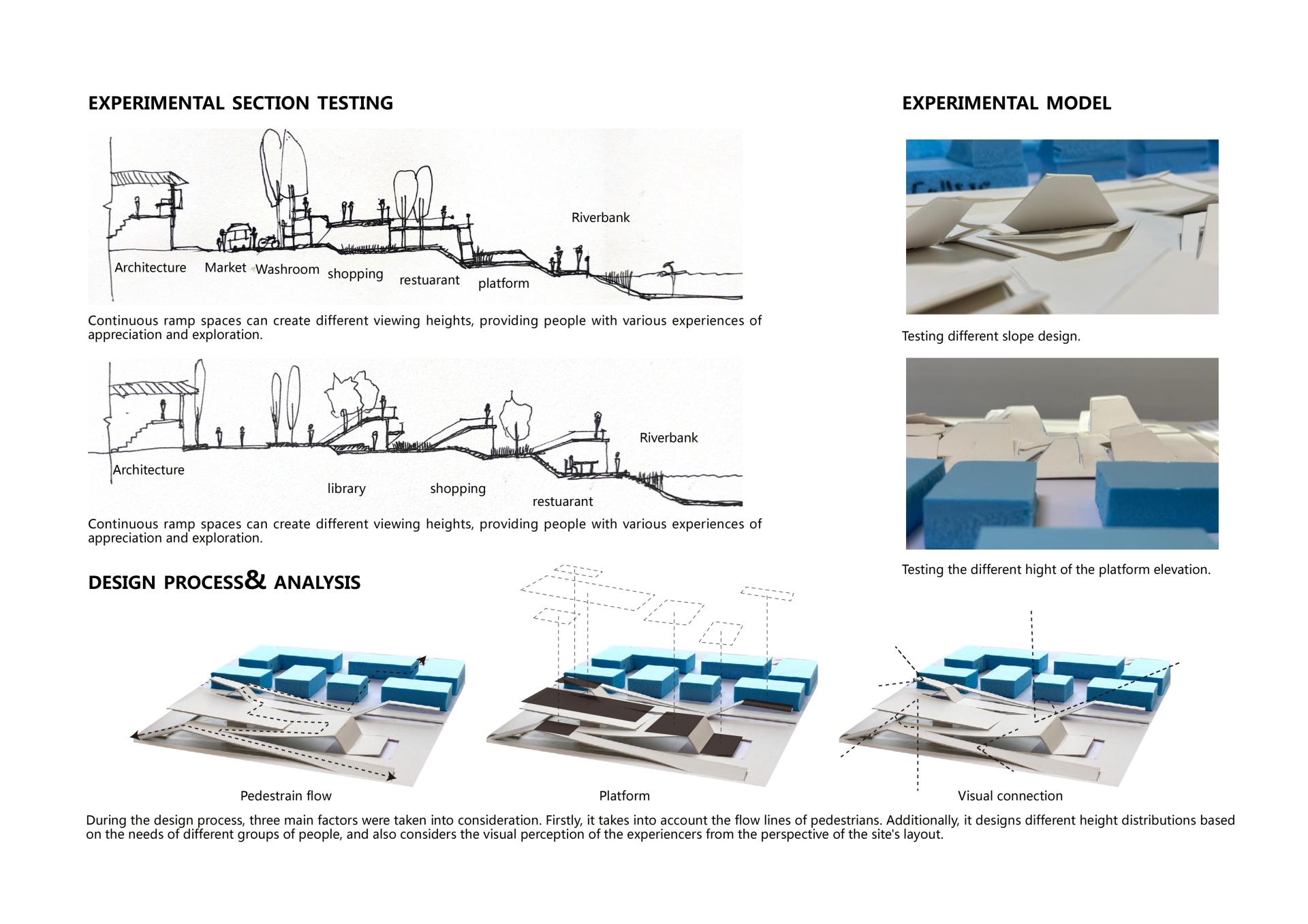 1. Spatial & Visual Integration: The folded-plate structures create fluid transitions between the elevated pedestrian street and the waterfront, resolving abrupt elevation changes and enhancing visual permeability toward the Canal. This reconnects the district's commercial spine with the riverfront promenades.