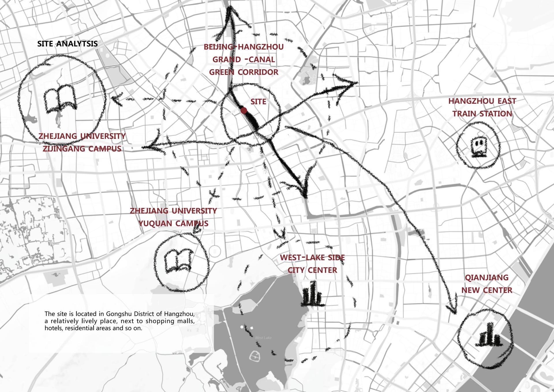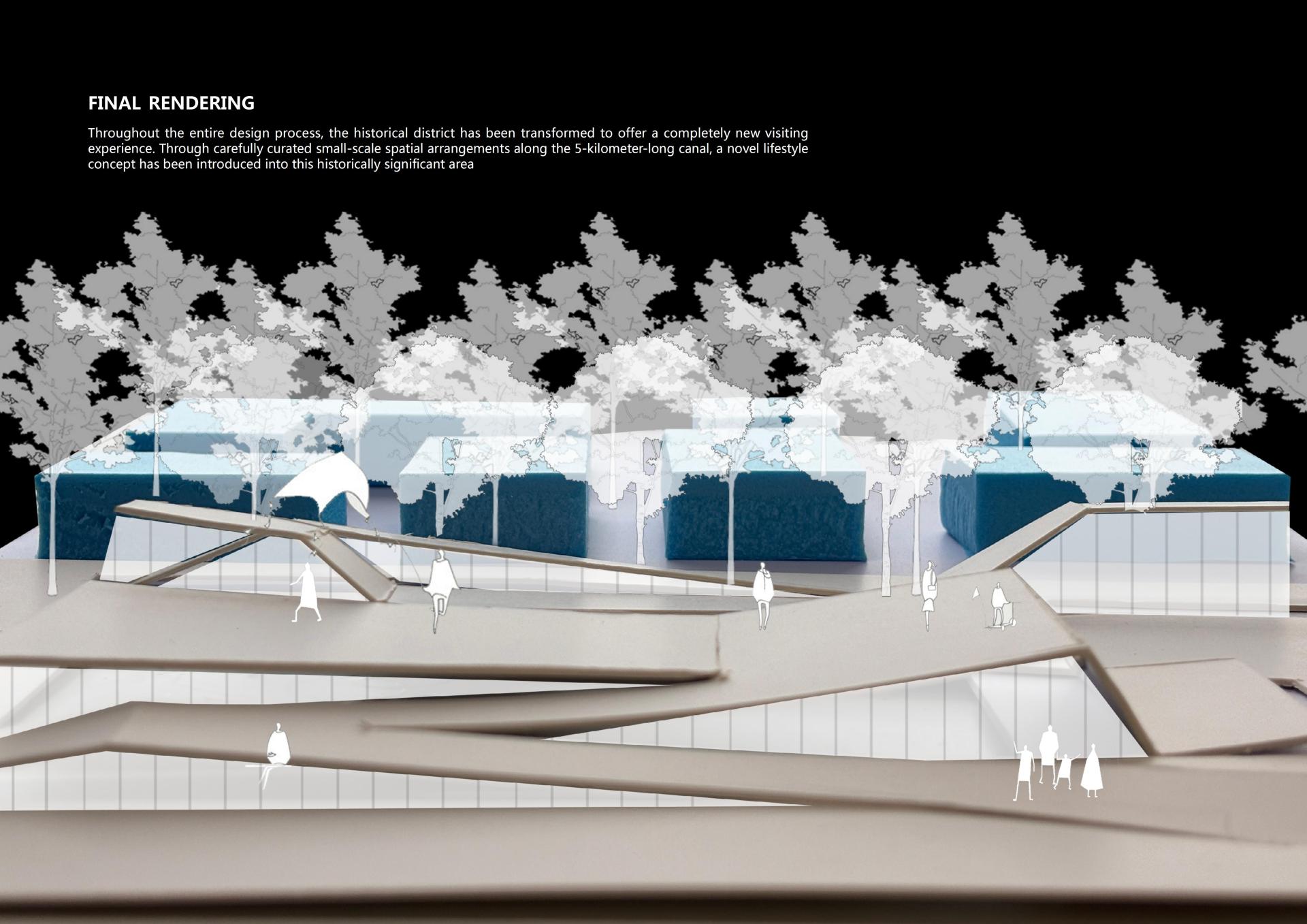 This project addresses critical challenges in Hangzhou's Dadou Road Historical District—specifically, the rigid commercial design, low visitor engagement, and the physical/visual disconnection between the pedestrian street and the historic Grand Canal. To resolve these issues, the design proposes a "folded plate" structural system as a spatial and experiential connector, aligning with Landscape Urbanism principles to integrate modern urban life with the Canal's aquatic environment.