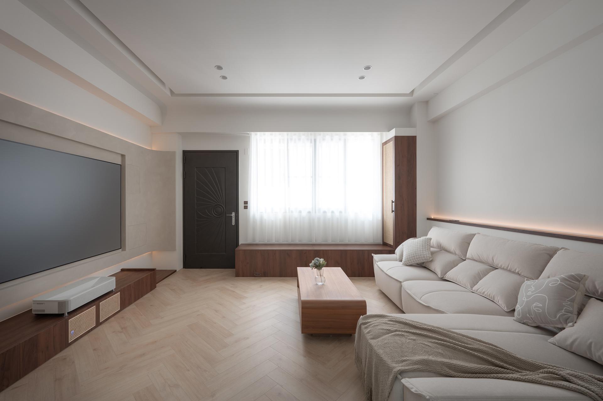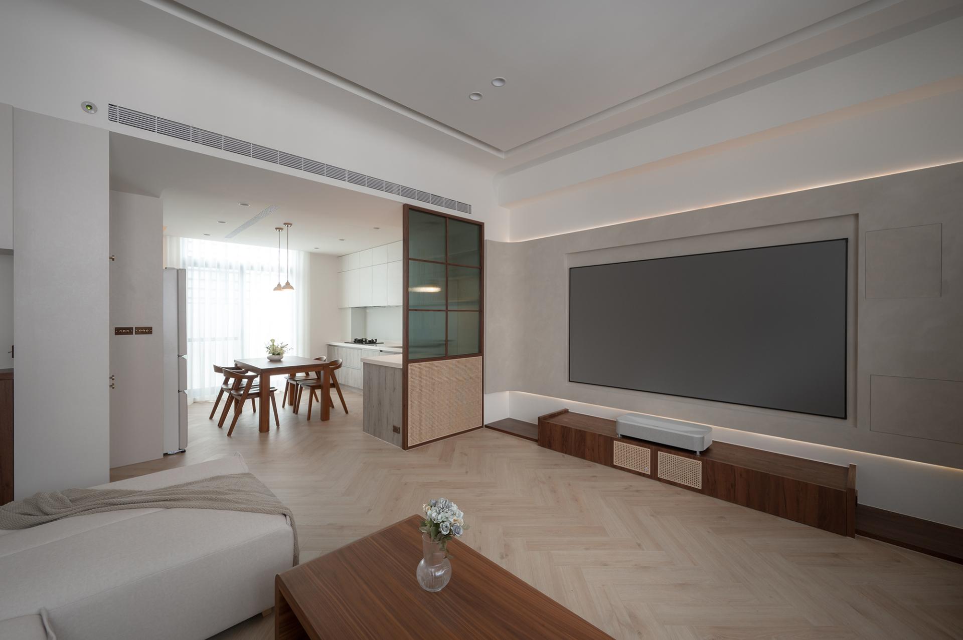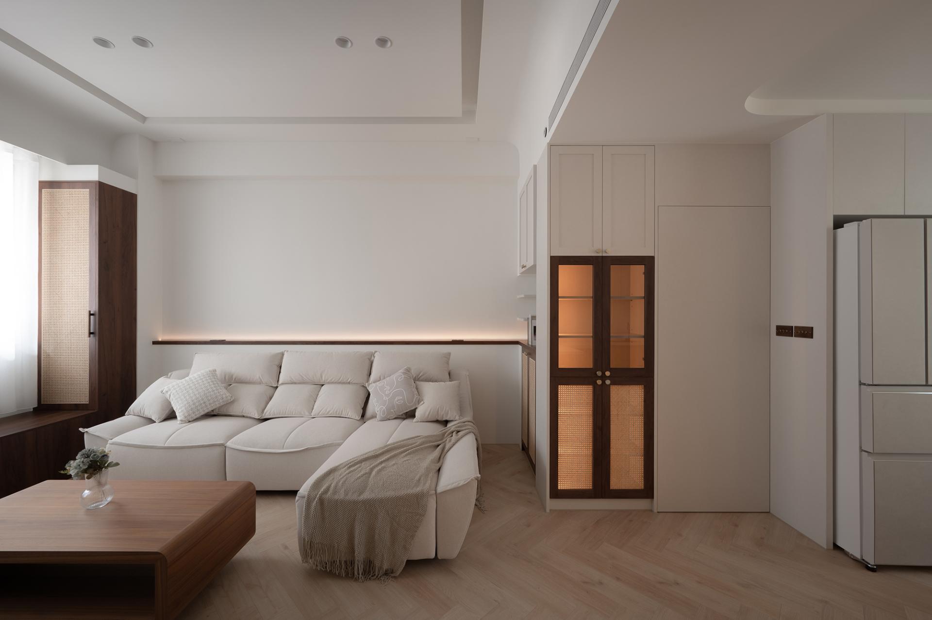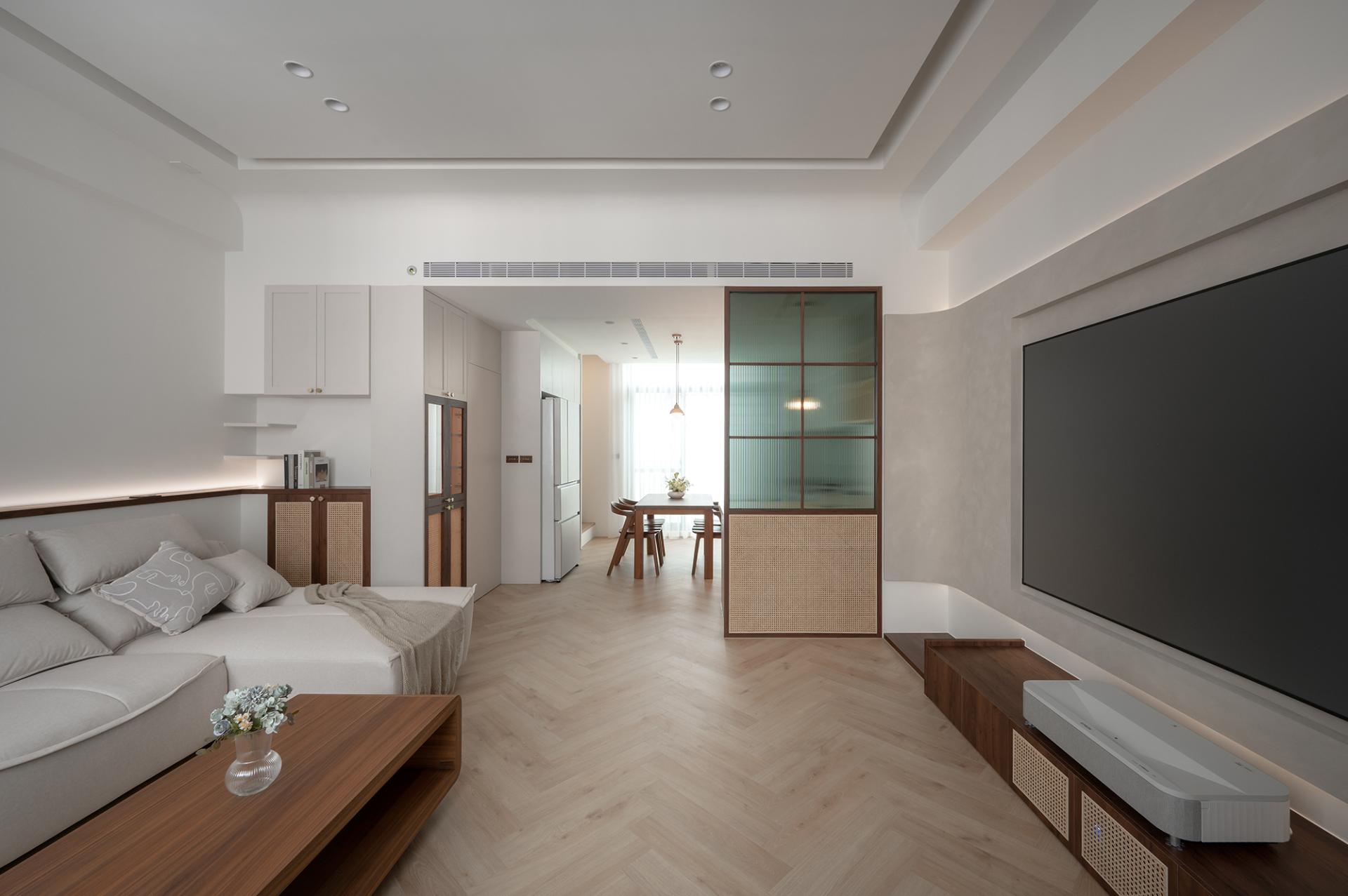 The layout masterfully emphasizes rhythm and integration, resulting in a harmonious living environment. The dining and living areas are seamlessly designed as a unified space, where the ceiling and floor gracefully merge to delineate each area while ensuring an uninterrupted flow. Eye-catching woven cabinets and inviting wooden walls draw attention, while the carefully placed indirect and accent lighting come together to enhance the overall sophistication of the space. In the master bedroom, it is elegantly adorned with a soft milk tea-colored suede paint finish that envelops the room in warmth, creating an intimate atmosphere that exudes calm and sophistication. The bed's headboard, featuring exquisite rattan weaving and gentle curves, adds a touch of artistry and subtle detail to the design. Furthermore, in the private area, a thoughtfully designed system-based storage wall showcases clean lines and efficient functionality, offering both practicality and aesthetic appeal. This innovative design also incorporates versatile lighting configurations, allowing the space to cater to diverse needs, whether it be for display, reading, or relaxation. Overall, this cohesive design approach not only elevates the aesthetic experience but also enhances the functionality of each space.