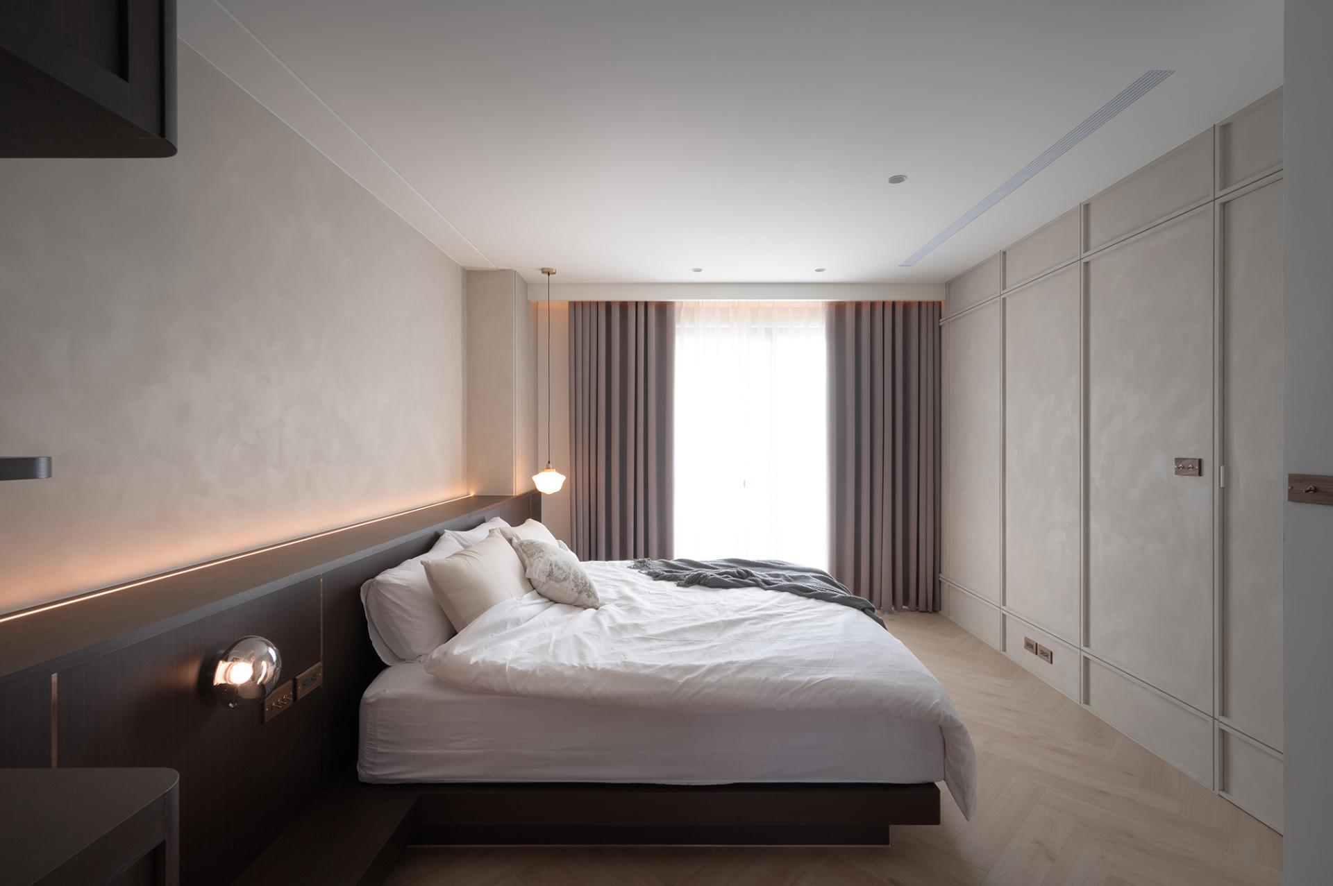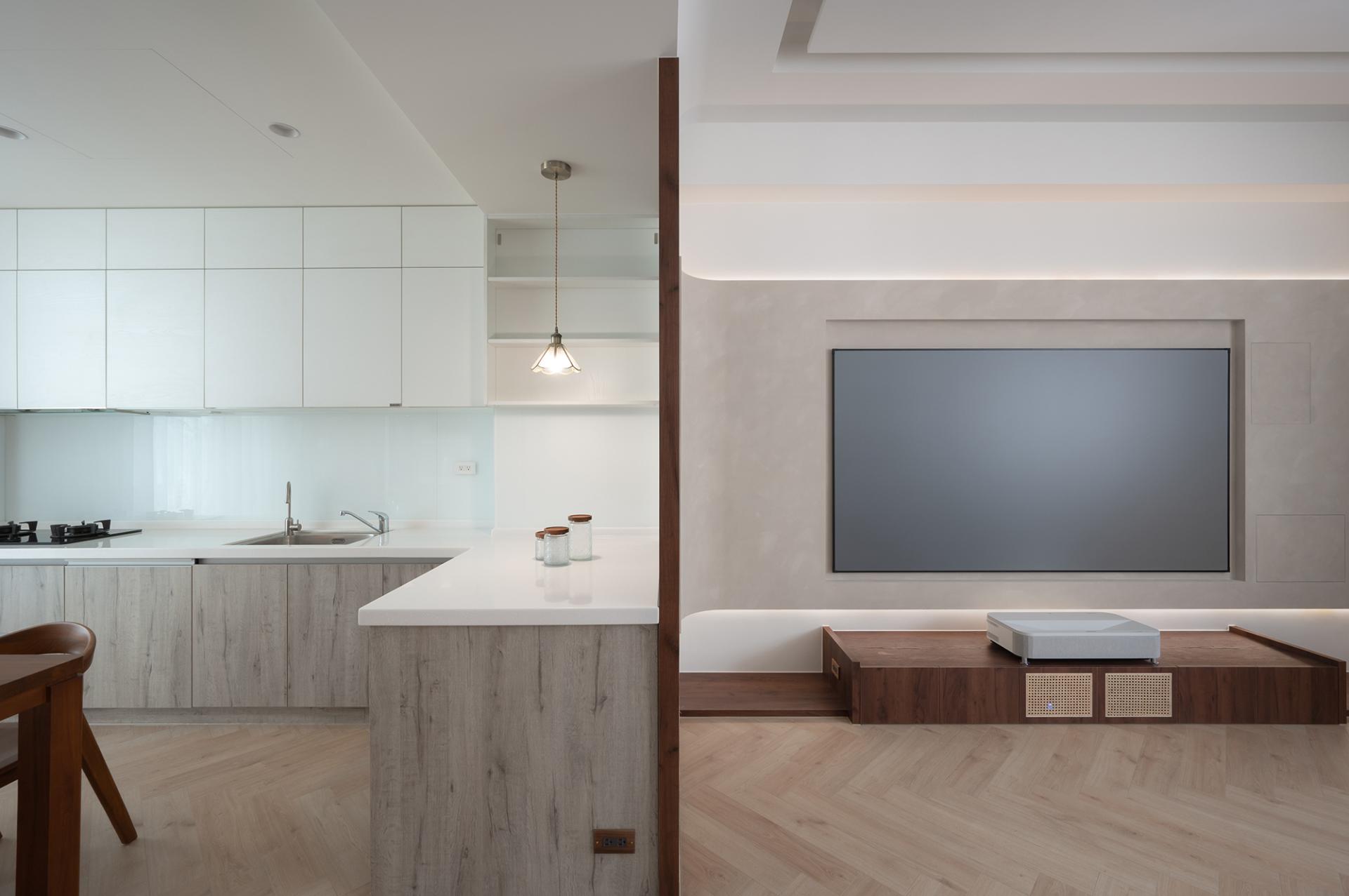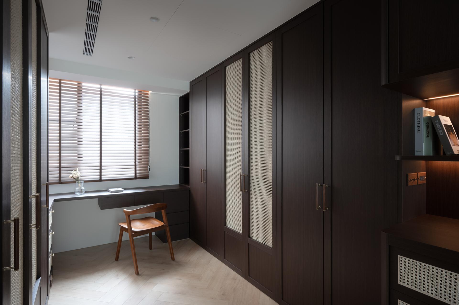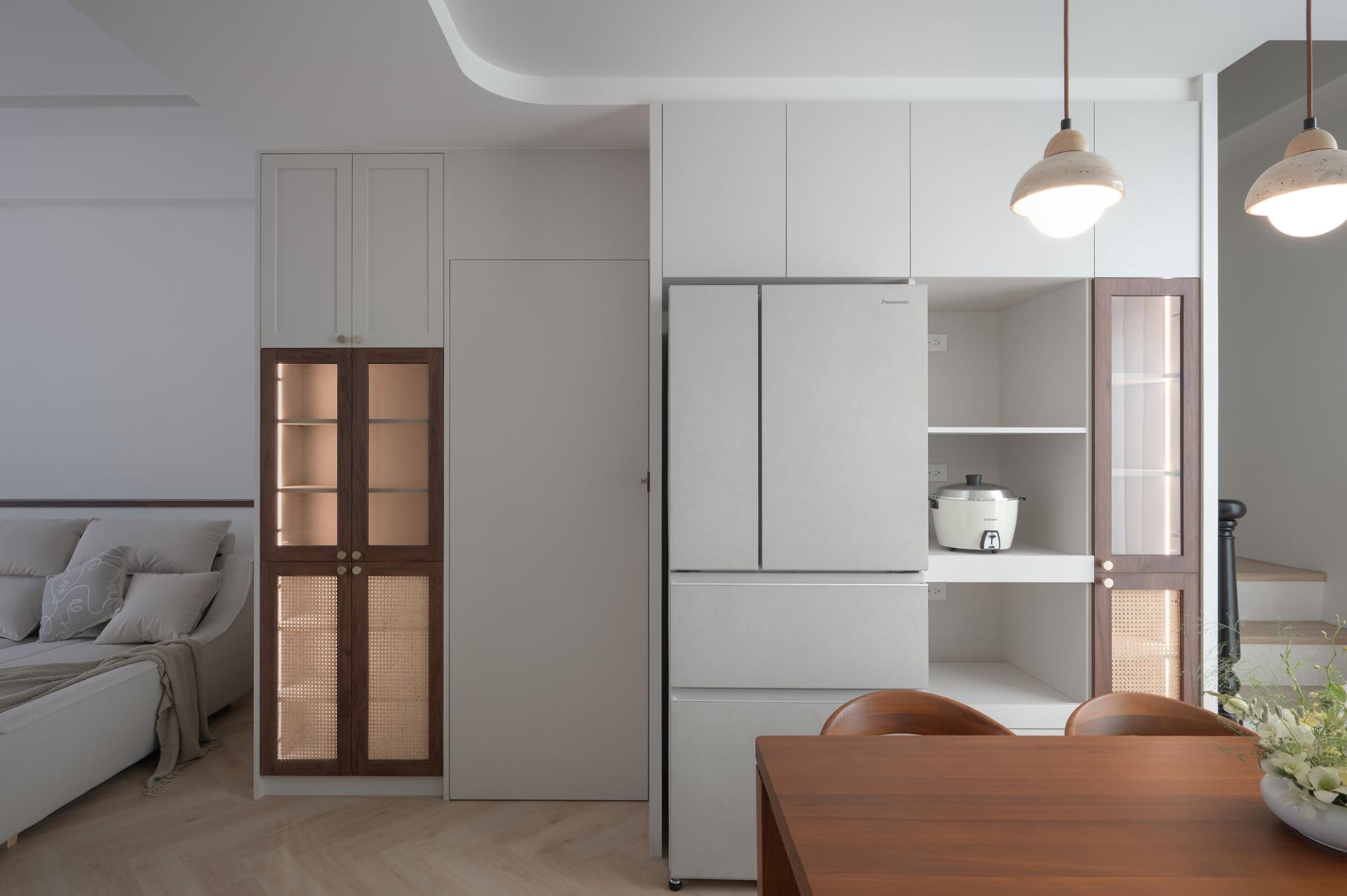 The layout masterfully emphasizes rhythm and integration, resulting in a harmonious living environment. The dining and living areas are seamlessly designed as a unified space, where the ceiling and floor gracefully merge to delineate each area while ensuring an uninterrupted flow. Eye-catching woven cabinets and inviting wooden walls draw attention, while the carefully placed indirect and accent lighting come together to enhance the overall sophistication of the space. In the master bedroom, it is elegantly adorned with a soft milk tea-colored suede paint finish that envelops the room in warmth, creating an intimate atmosphere that exudes calm and sophistication. The bed's headboard, featuring exquisite rattan weaving and gentle curves, adds a touch of artistry and subtle detail to the design. Furthermore, in the private area, a thoughtfully designed system-based storage wall showcases clean lines and efficient functionality, offering both practicality and aesthetic appeal. This innovative design also incorporates versatile lighting configurations, allowing the space to cater to diverse needs, whether it be for display, reading, or relaxation. Overall, this cohesive design approach not only elevates the aesthetic experience but also enhances the functionality of each space.