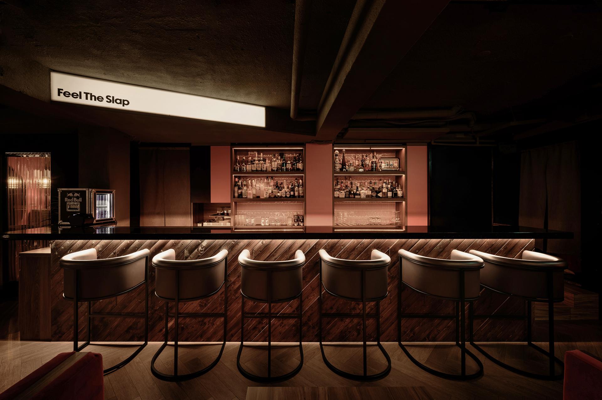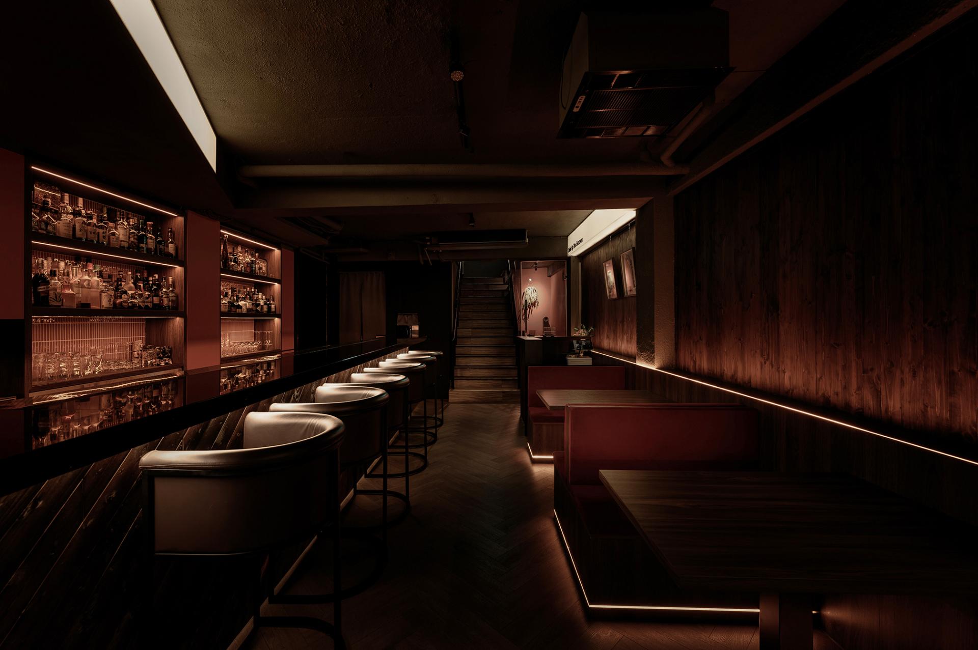 To meet the owners’ varied needs, the space includes a DJ booth and performance area for live shows with musicians and dancers on weekends. At the opposite end, a smoking area is equipped with a dedicated exhaust system, allowing guests to mingle comfortably. Lighting design favors indirect illumination, blending LED strips, backlit counters, and under-seat lighting to avoid overhead glare. The result is a warm, hazy atmosphere that enhances both the bar’s emotional layers and its theatrical quality.