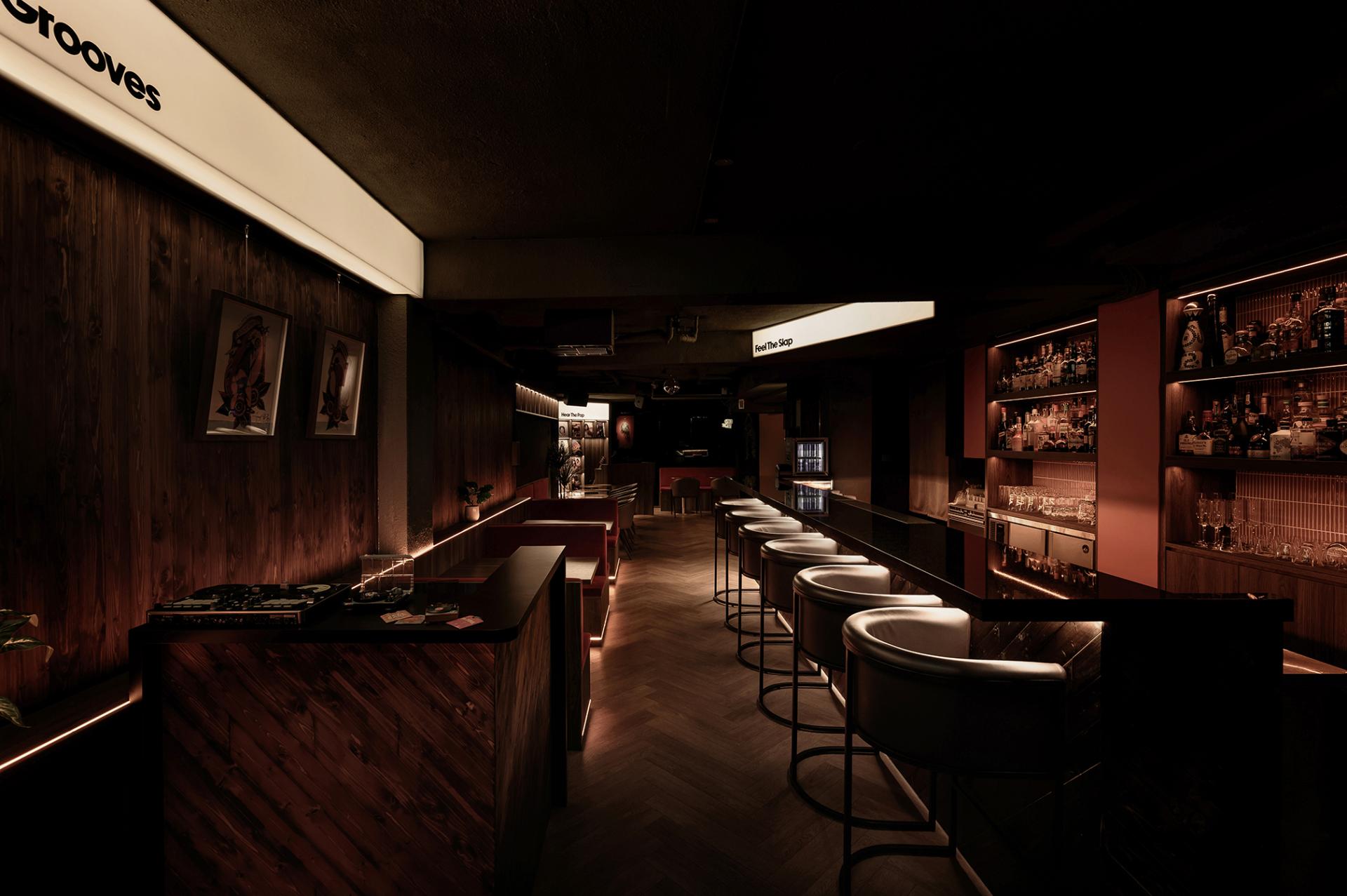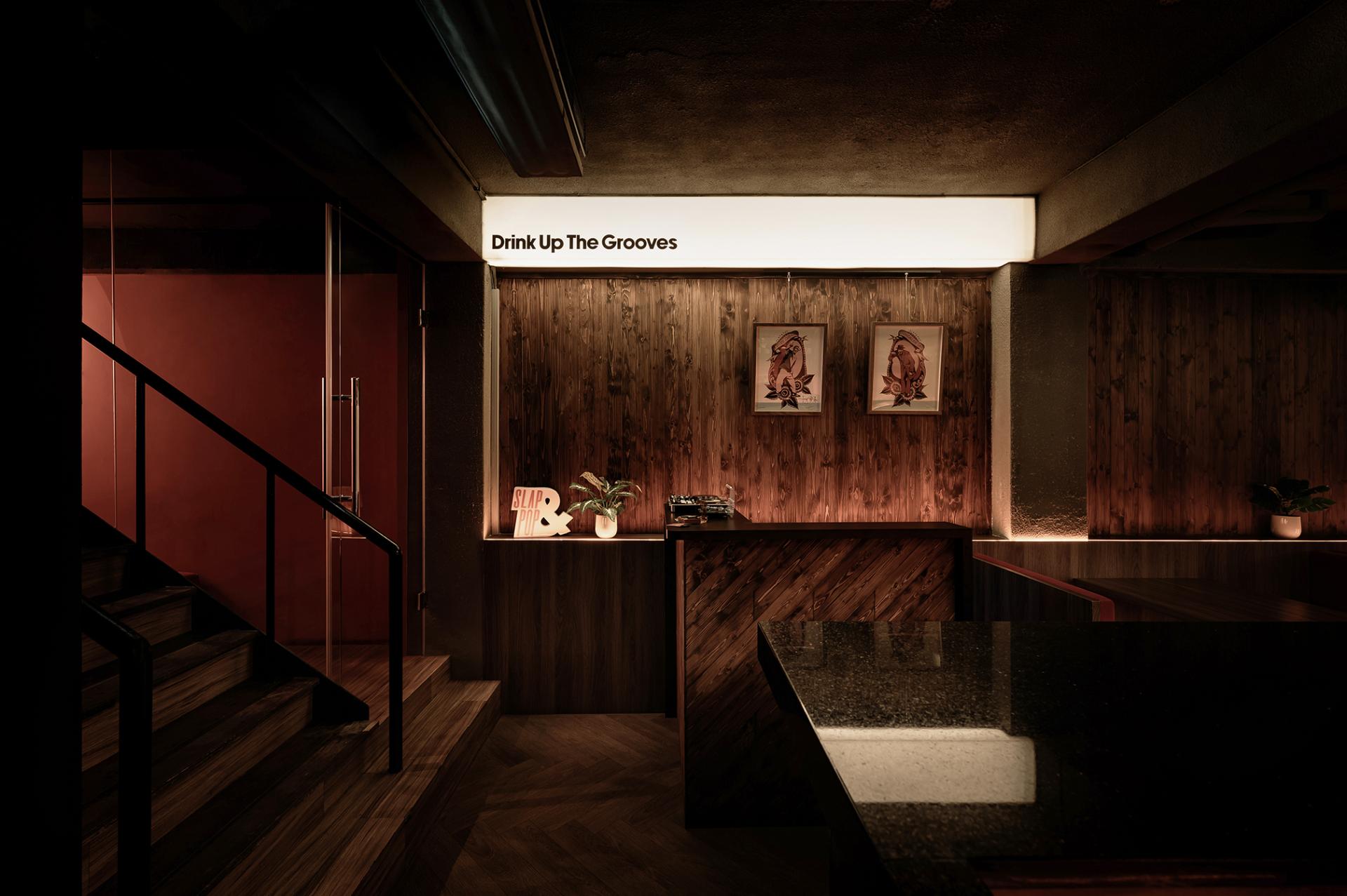 The most iconic feature of the space is the “infinite reflection record wall” at the entrance. Constructed with mirrored surfaces, it stretches like a tunnel of music—expanding memories and imagination while setting the stage for arrival. It serves as both a popular photo backdrop and a visual prologue for the bar experience. Inside, diagonal motifs run through the ceiling lightboxes, bar counter trim, and herringbone flooring, breaking the monotony of the basement’s rectangular footprint and injecting rhythm and movement into the design.