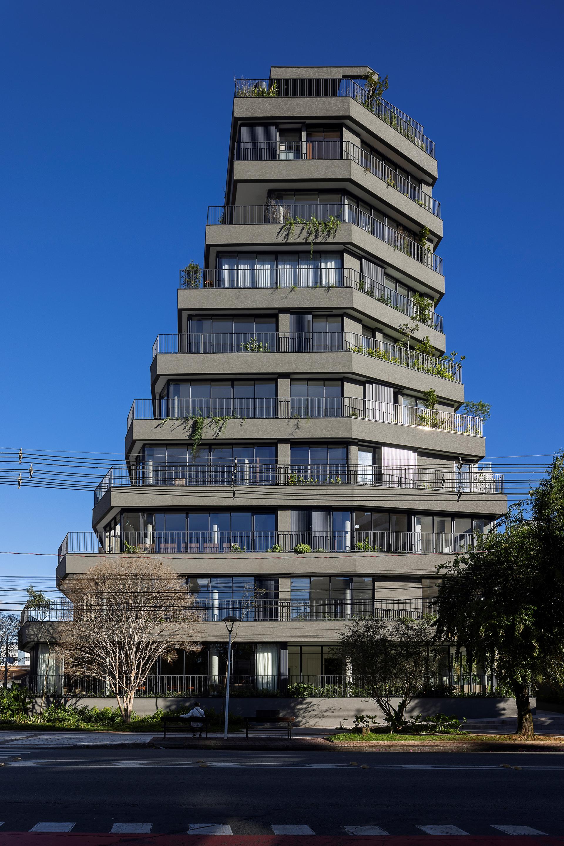 Although the architects were given creative freedom, the design had to comply with strict planning regulations, including a setback requirement proportional to the building’s height. These constraints led to a form that compresses as it rises, generating generous setbacks, terraces, and unique floorplans. This allowed each apartment to feel more like an individual house, with floor-to-ceiling glazing on all façades. Each apartment occupies a full floor with terraces, private pools, and integrated planters that allow mature trees to grow from the slabs, turning the façade into a living vertical garden, enhancing biodiversity and the street’s microclimate.