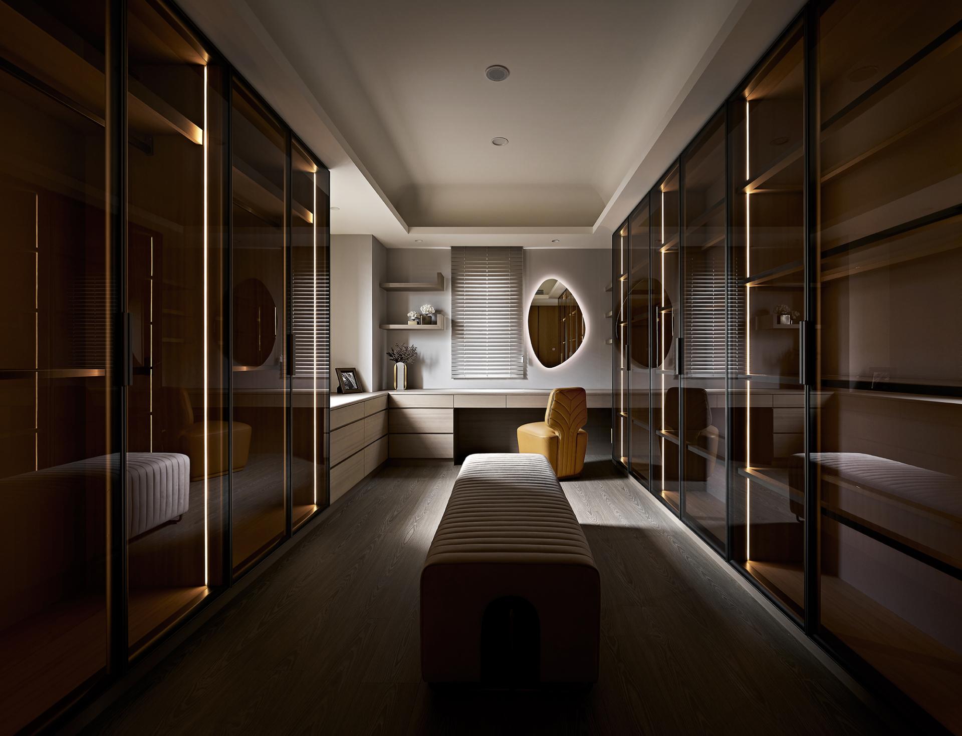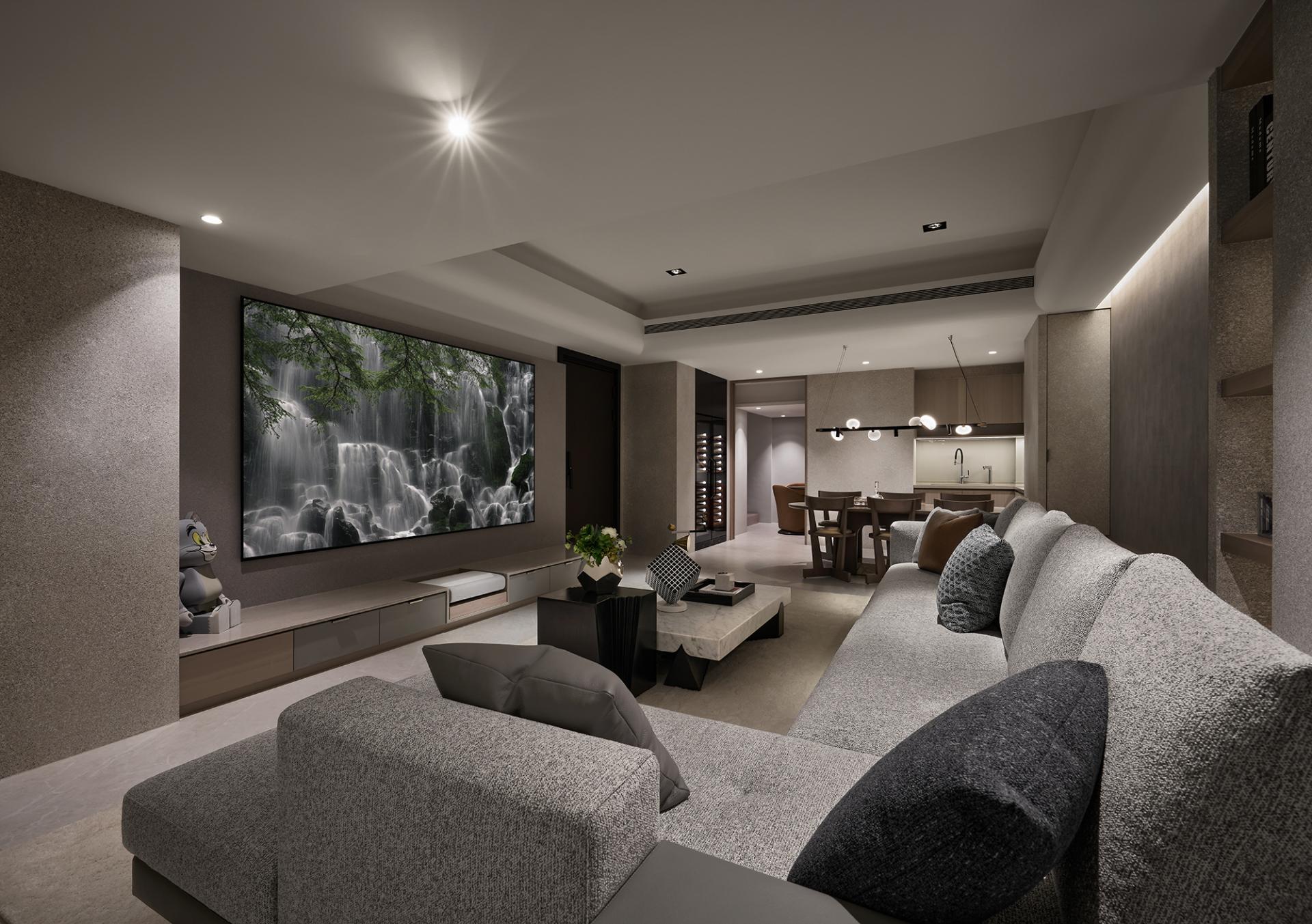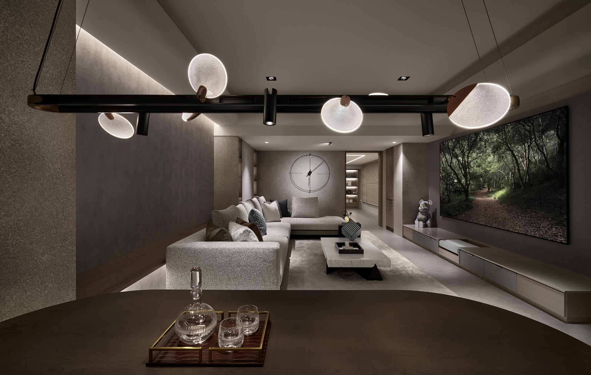 Spatial functionality is achieved through layout reconfiguration, wiring and plumbing upgrades, and climate control planning for seamless operation and easy maintenance. The open-concept dining area and kitchen are designed to feature a long wooden table, enhanced by minimalist pendant lighting. An island is included to improve cooking efficiency, while the overall light color palette fosters a bright and clean atmosphere. The studio is equipped with wooden modular cabinets and a substantial wooden desk. Vertical-grain wood paneling on the walls adds depth and seamlessly combines practicality with a warm aesthetic. The master bedroom incorporates light tones and distinctive wallpaper. A balcony situated adjacent to the floor-to-ceiling windows provides a tranquil retreat. The master bathroom is distinguished by gray-white textured stone walls that create an elegant and layered visual effect. The boy's bathroom utilizes solid gray stone in conjunction with warm wooden ceilings, which evoke the calming ambiance of a traditional Japanese bathhouse. Both bathrooms feature wet/dry separation to significantly enhance usability. The media room functions as a multifunctional entertainment area, serving as both a home theater and a board game space to facilitate family bonding. It is also equipped with a dining table and a wine cabinet to accommodate light meals and the appreciation of wine. The dressing room showcases wooden elements, featuring a vanity and a long sofa bench. Open-sided wardrobes on both sides allow natural light to illuminate the clothing, offering convenient storage while maintaining visual openness. Additionally, the basement serves as a versatile entertainment area. Each space thoughtfully integrates practical habits with comfort, striking a balance between functionality and aesthetics to foster an ideal lifestyle.