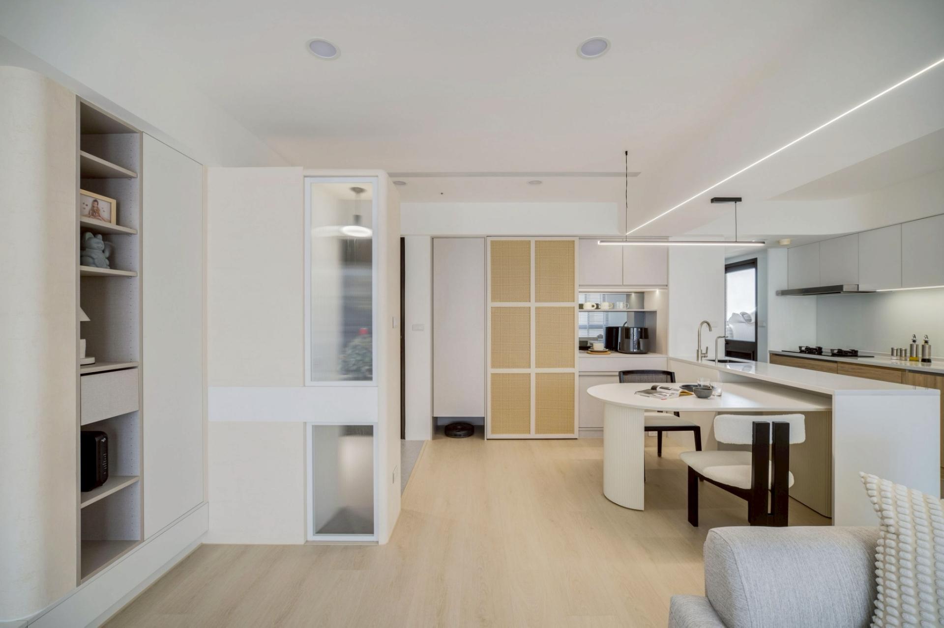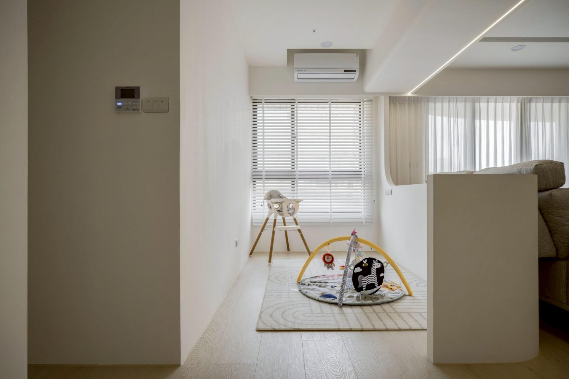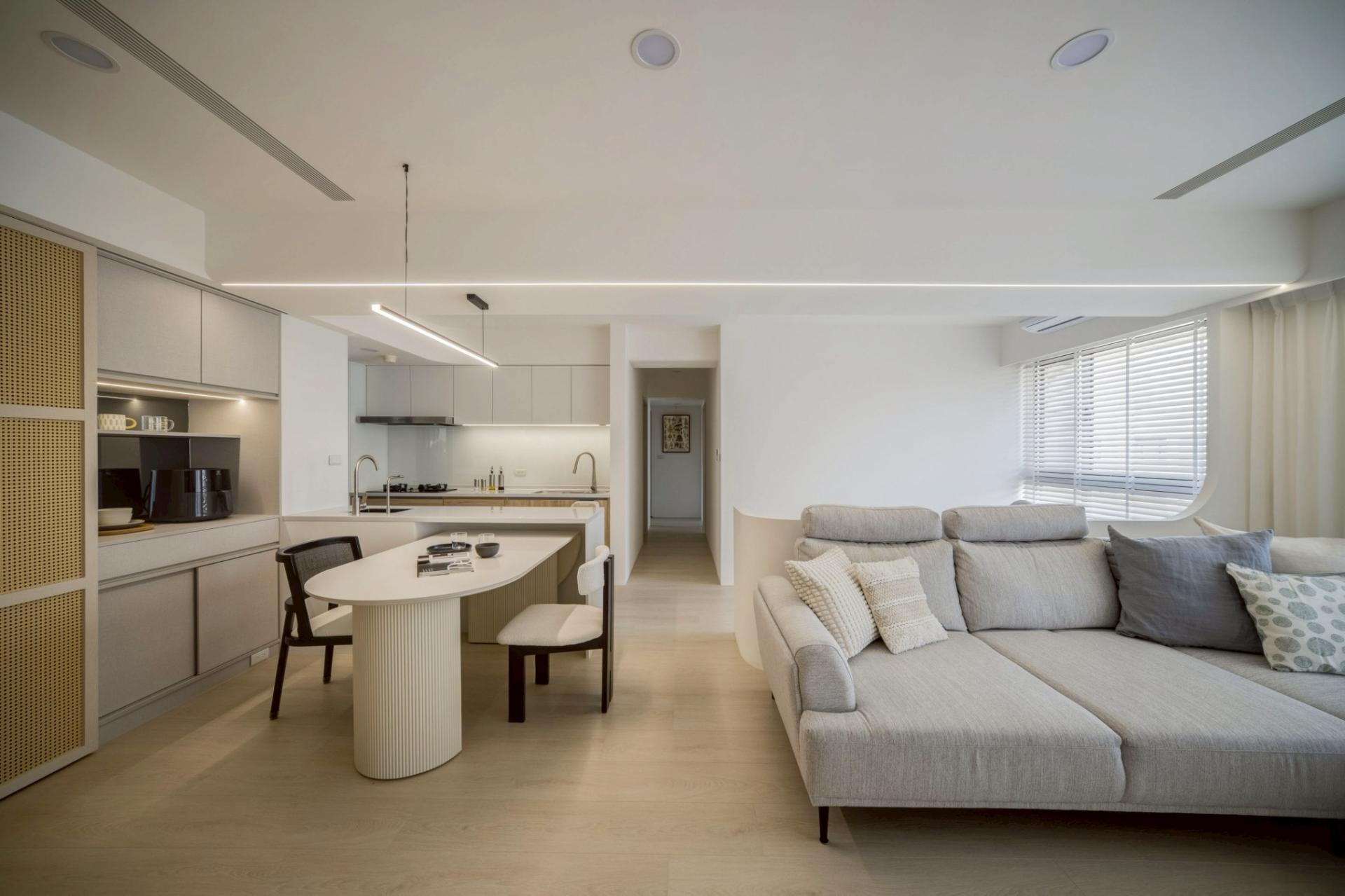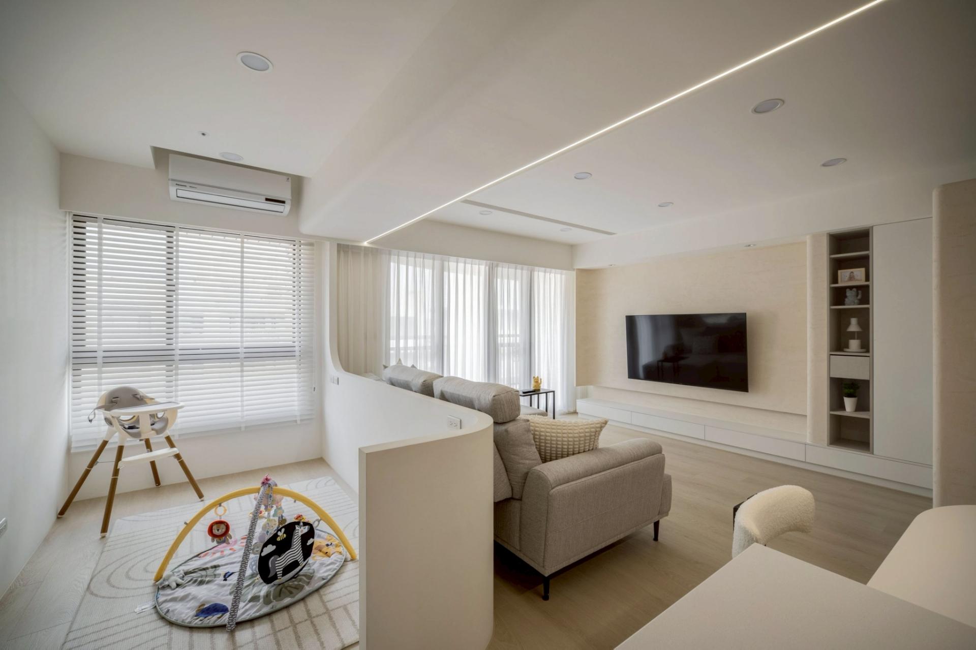 The project, located in Guishan District, Taoyuan City, marks the homeowner’s second collaboration with the designer. Unlike their previous residence, which emphasized a sharp and cool aesthetic, the arrival of a child shifted the tone toward a warm, creamy palette. The design, therefore, centers on safety and comfort, achieved through rounded corners, softened edges, and a play zone that allows the child to move freely within the social area. An open layout ensures family members remain visually connected, enriching the meaning of home.