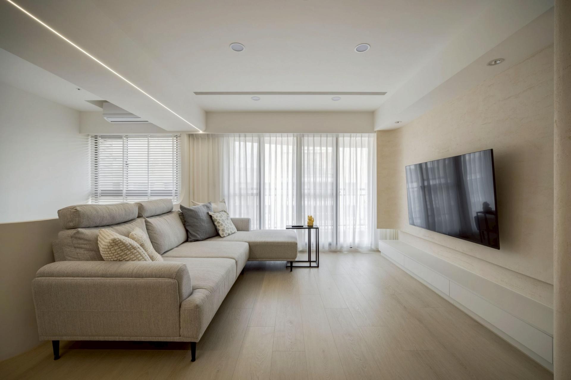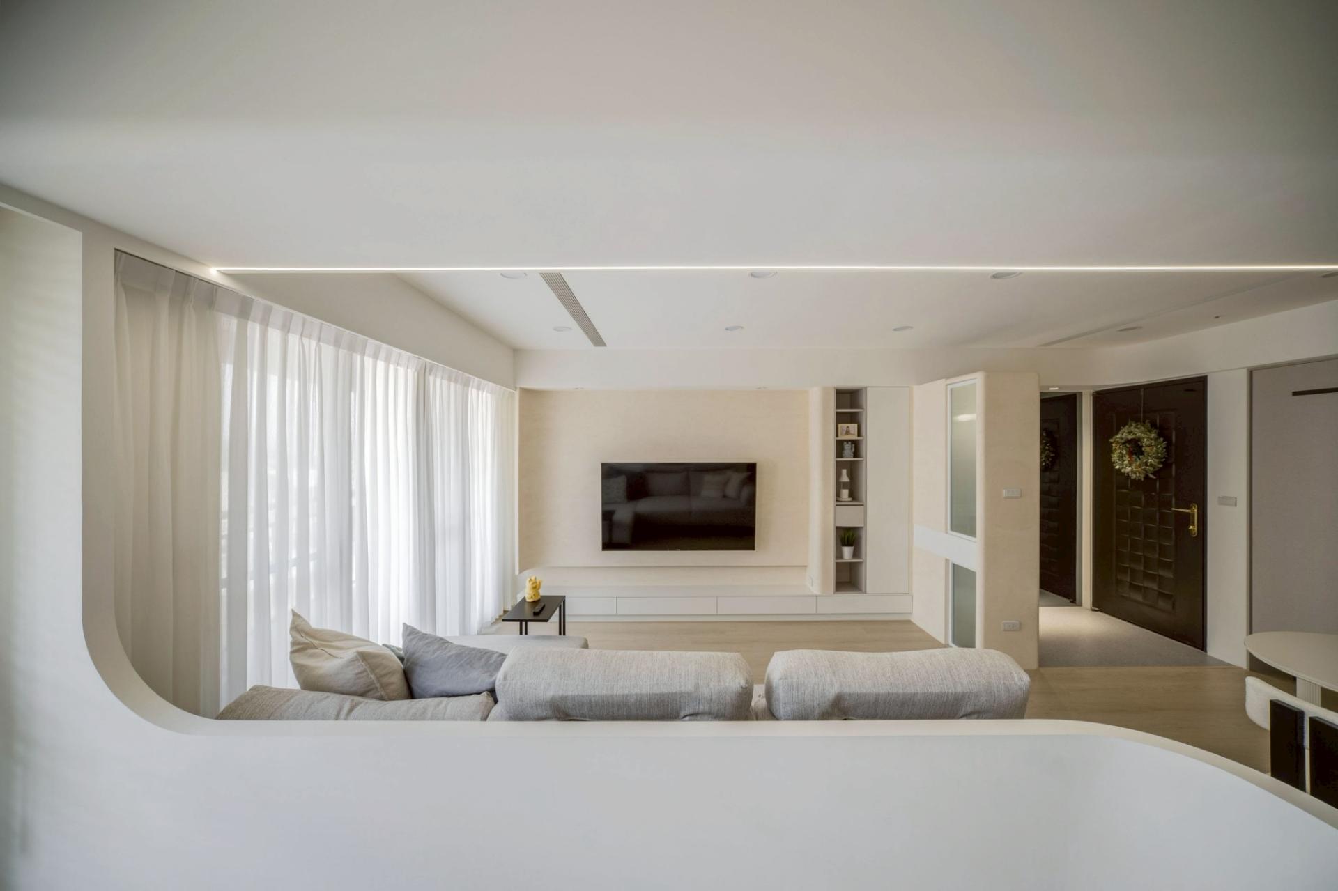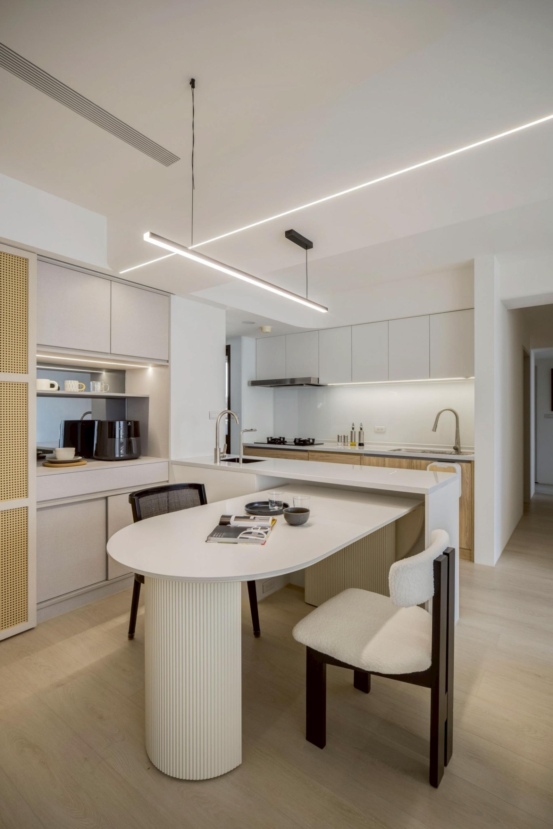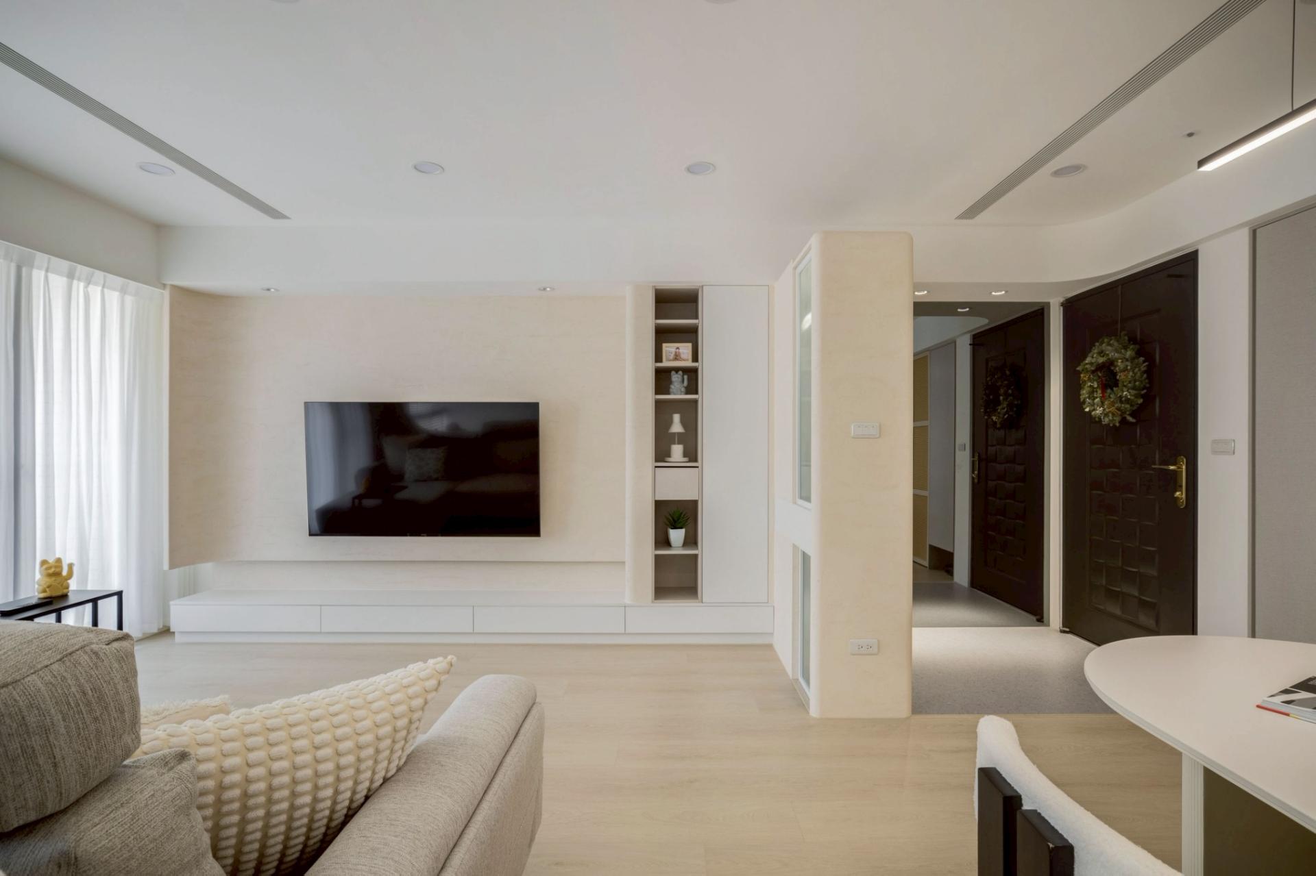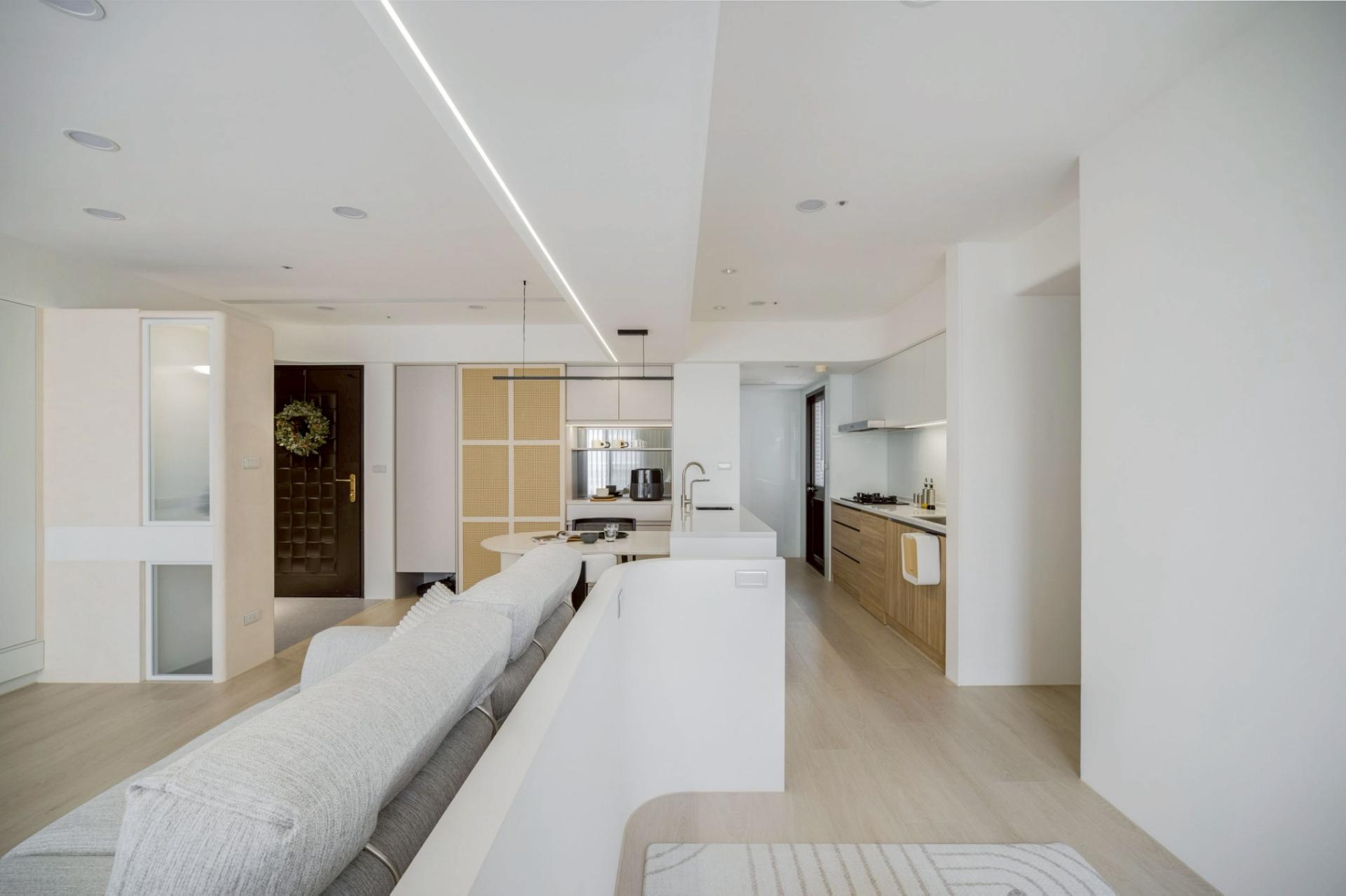 The project, located in Guishan District, Taoyuan City, marks the homeowner’s second collaboration with the designer. Unlike their previous residence, which emphasized a sharp and cool aesthetic, the arrival of a child shifted the tone toward a warm, creamy palette. The design, therefore, centers on safety and comfort, achieved through rounded corners, softened edges, and a play zone that allows the child to move freely within the social area. An open layout ensures family members remain visually connected, enriching the meaning of home.