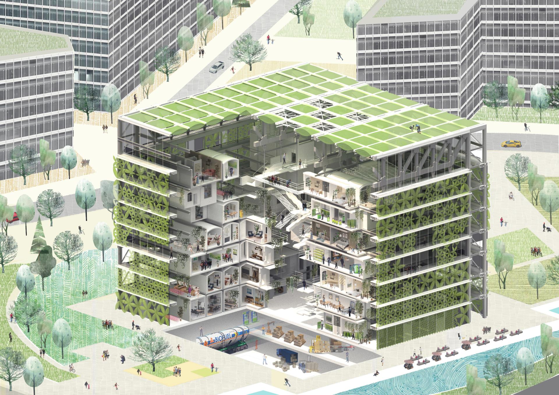 The architectural system combines modular structural components with ecological performance. Its metabolic skin recycles water, provides shading, and integrates vegetation to nurture biodiversity. The building adapts over time, expanding or repairing itself through plug-in units that respond to shifting social and environmental needs.