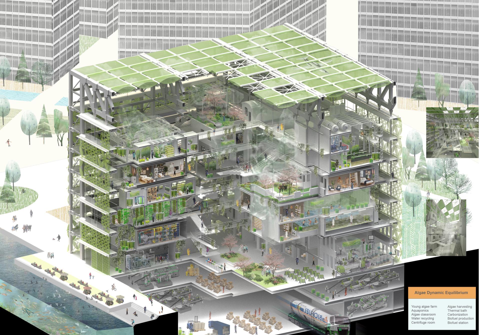 At the heart of the design is an algae-based system that captures carbon dioxide, produces biomass, and generates renewable fuel. These bioreactors transform facades, roofs, and circulation cores into productive surfaces, absorbing pollutants while creating clean energy. The bio-fuel and by-products are cycled into the wider urban network, supporting Zhengzhou’s Aerotropolis and reducing reliance on fossil fuels.