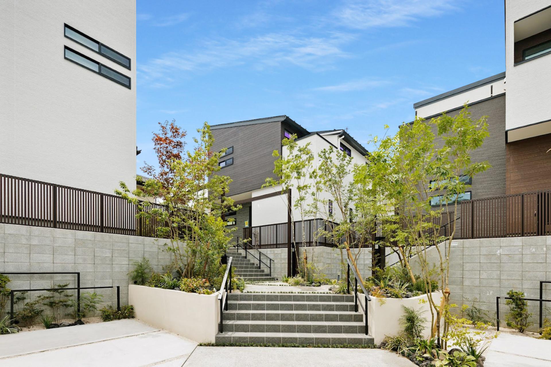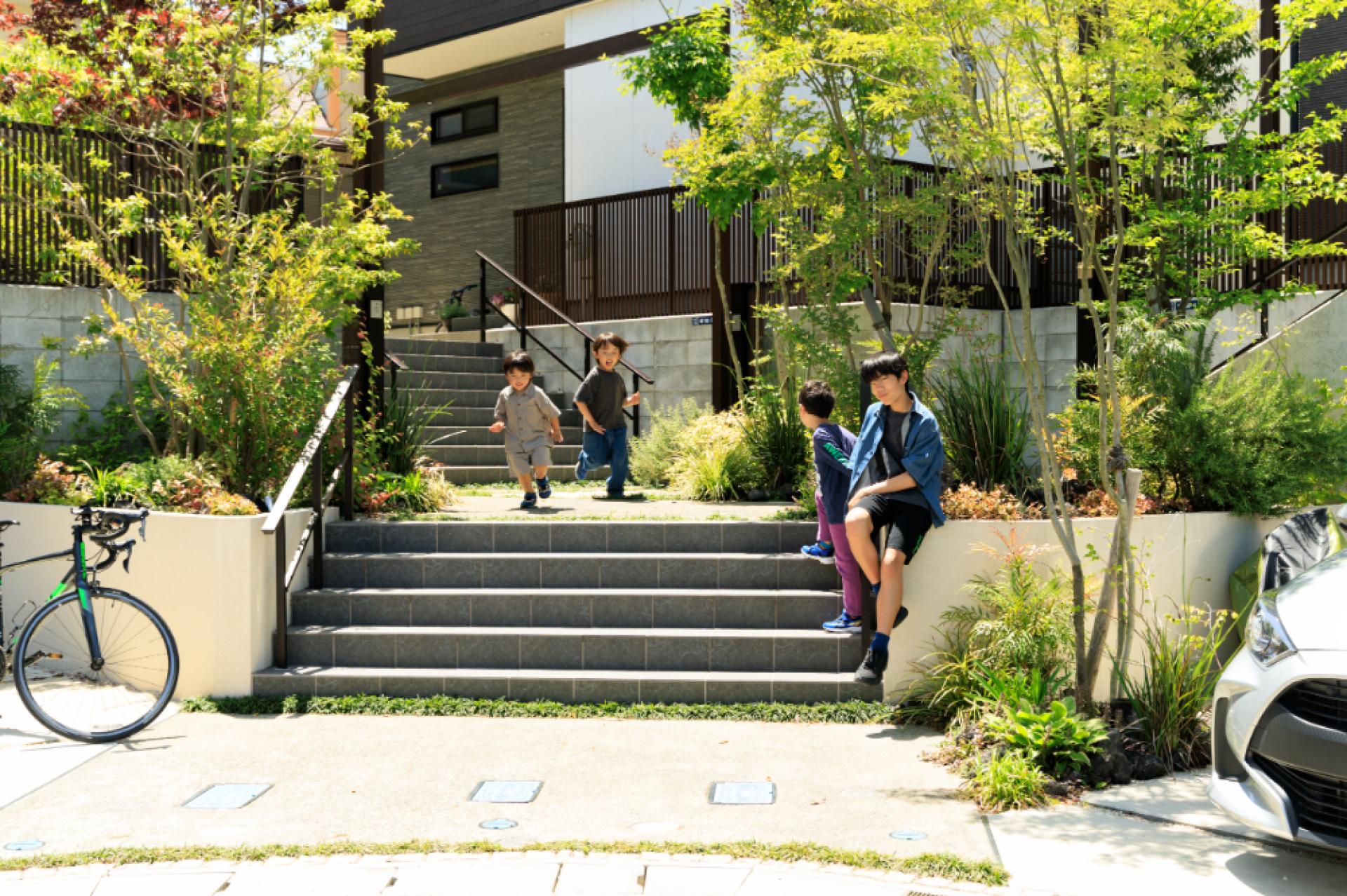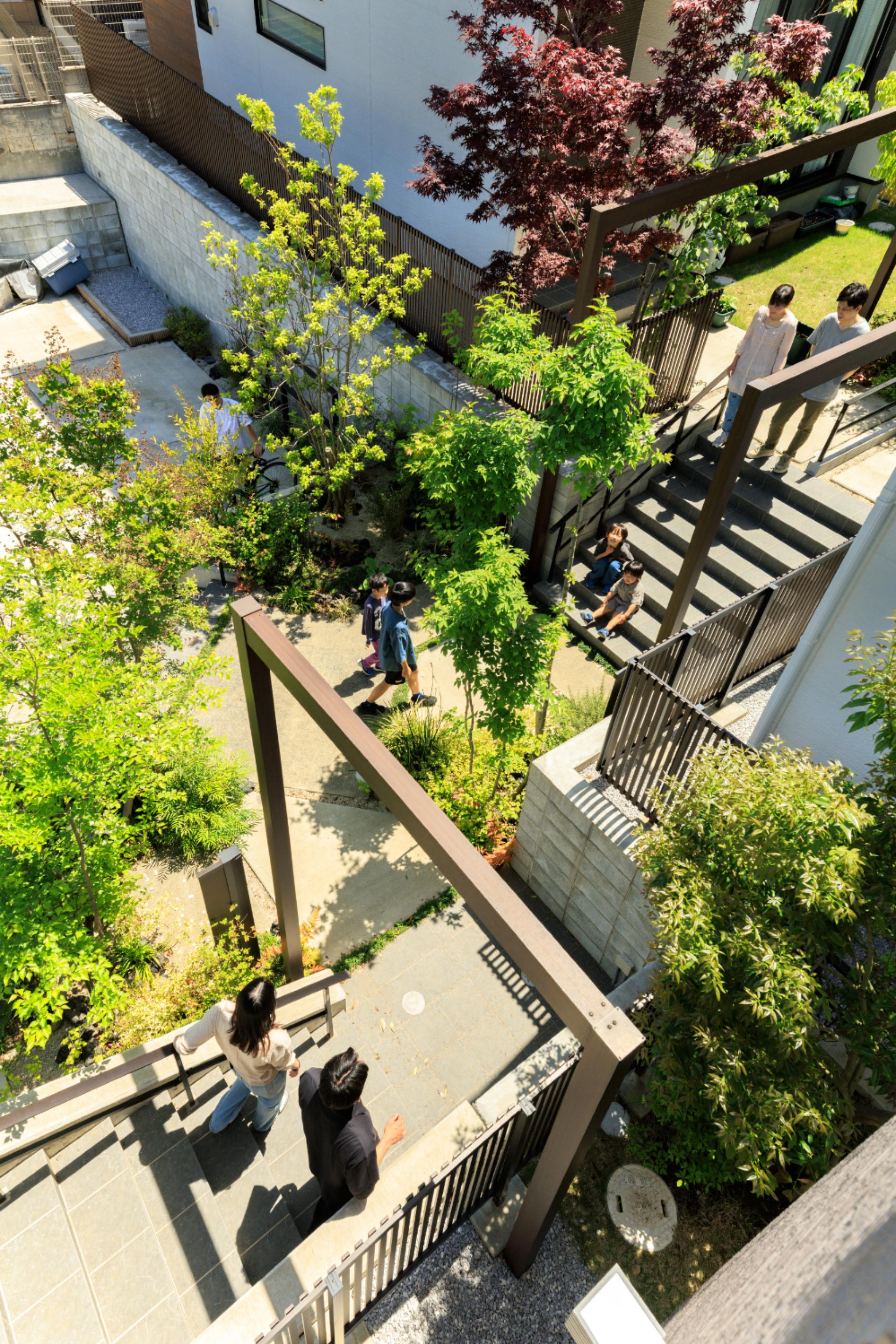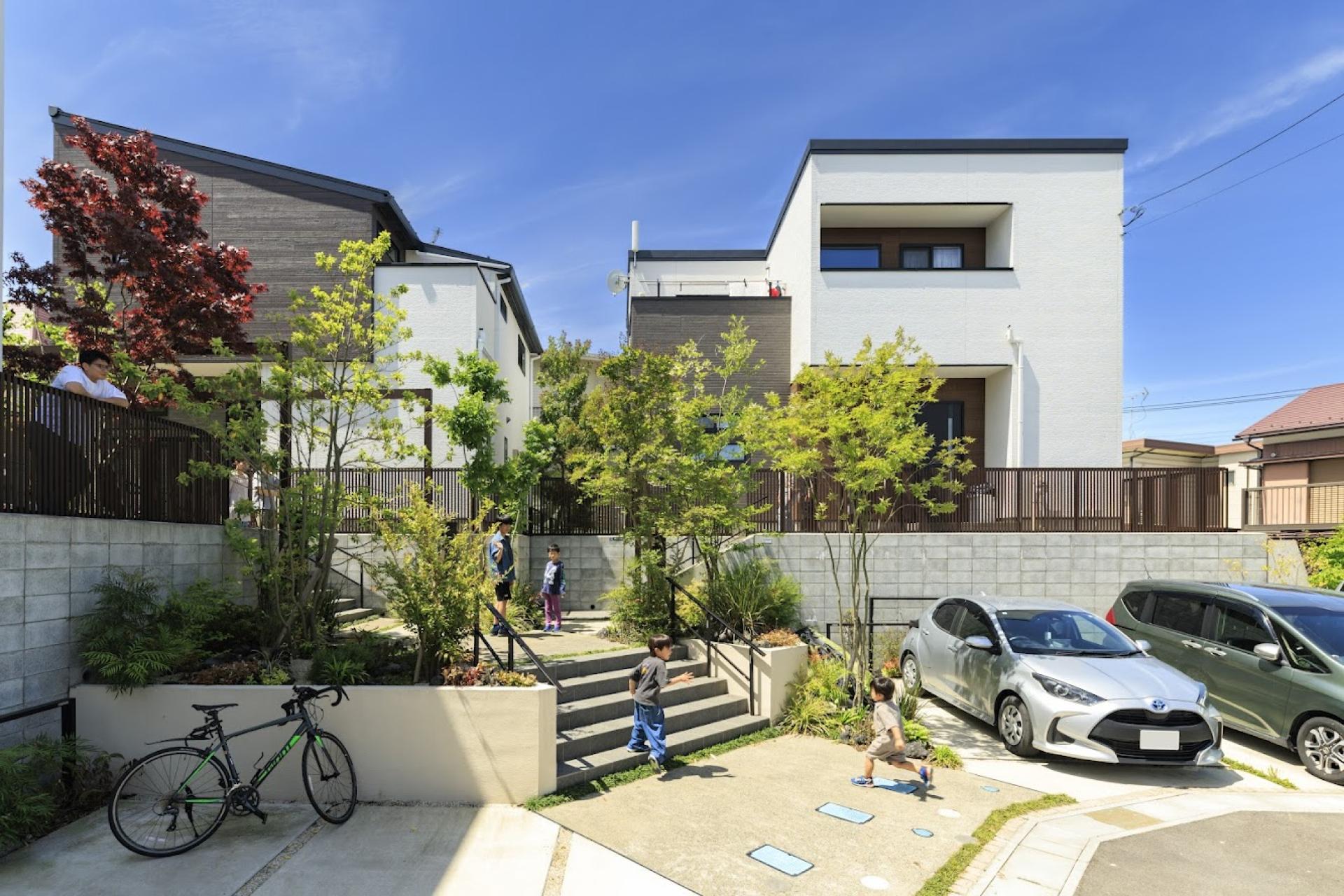 Three houses stand on a site with over 2m elevation difference, facing a cul-de-sac. Entrances are grouped to form an "interaction landing" that fosters natural communication. Retaining walls, buildings, and landscaping are designed as one. Each lot clearly separates approach and car space. Pedestrian and vehicle paths are divided, encouraging both resident interaction and neighborhood connection.