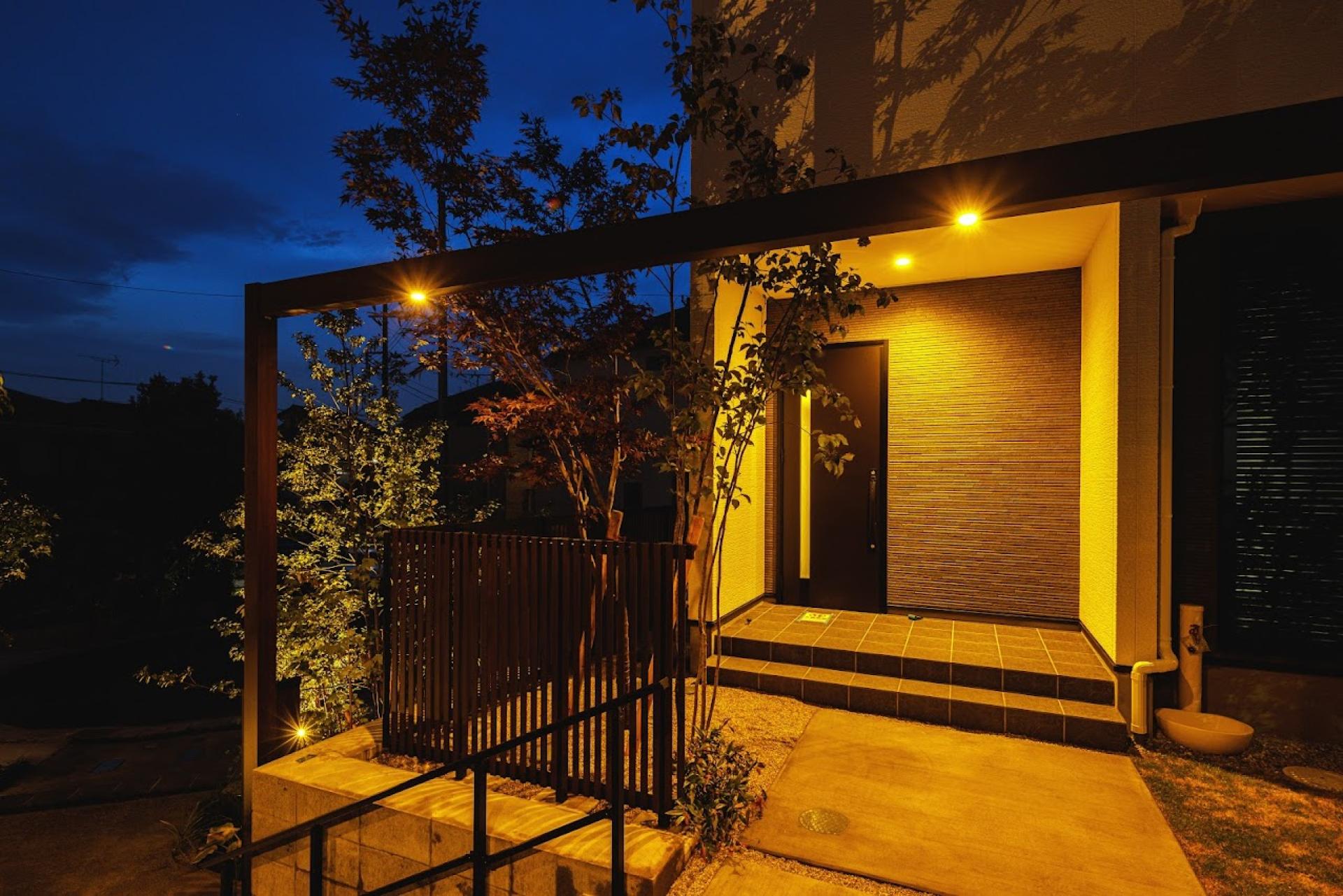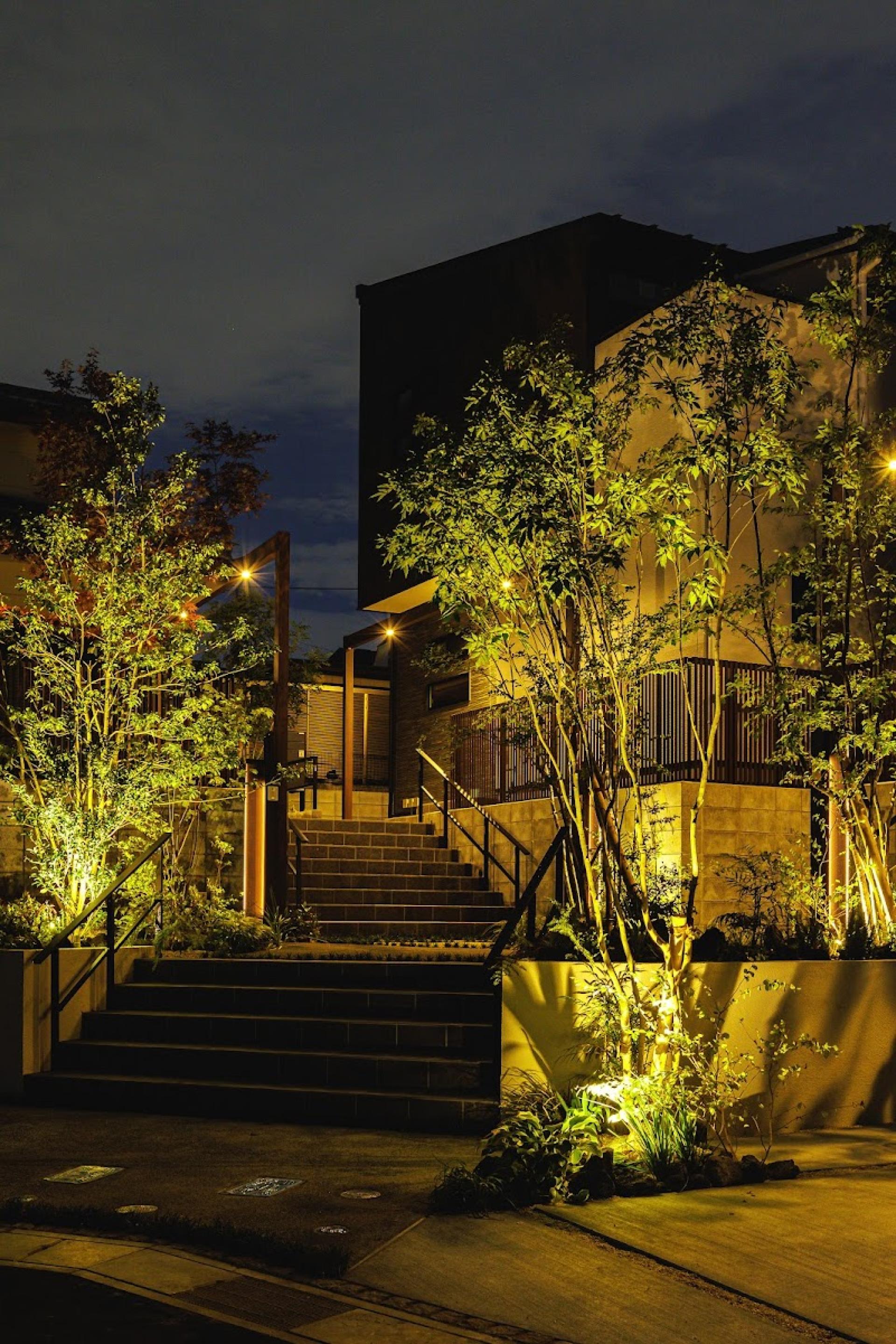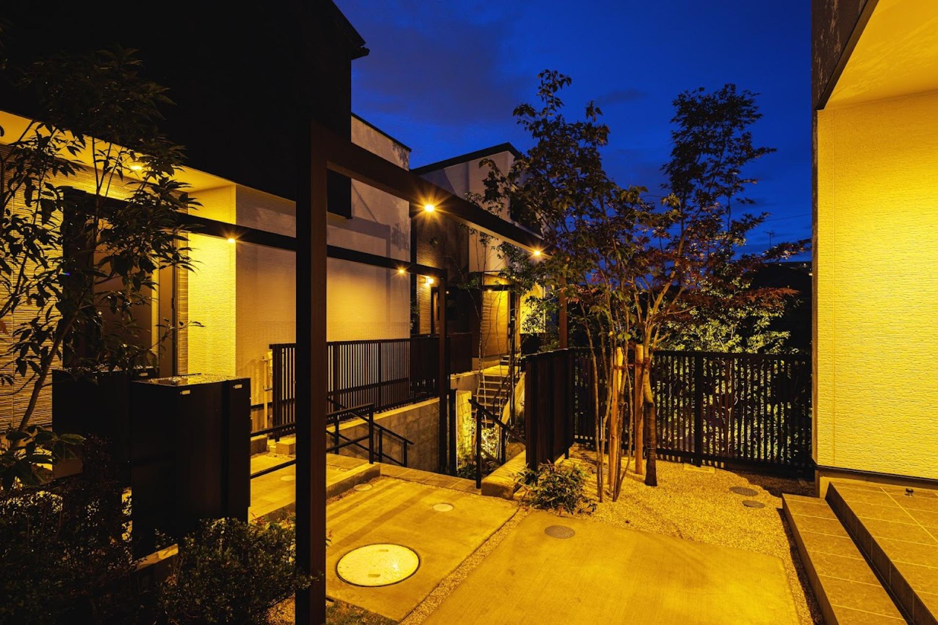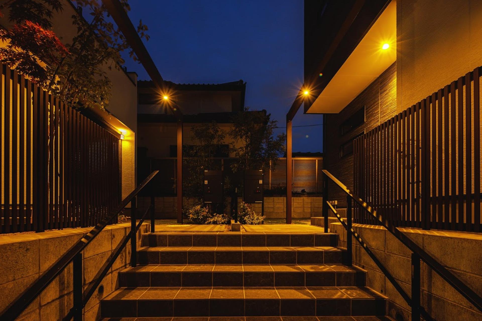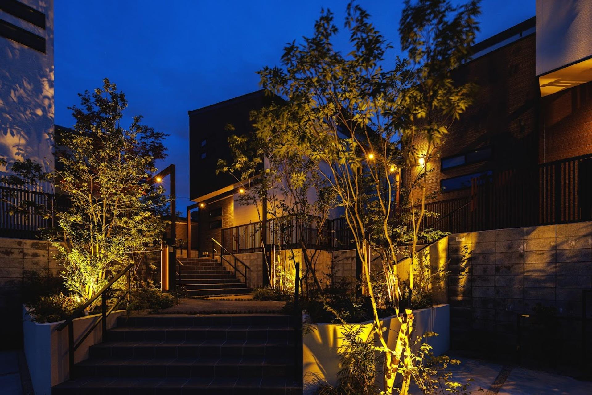 Three houses stand on a site with over 2m elevation difference, facing a cul-de-sac. Entrances are grouped to form an "interaction landing" that fosters natural communication. Retaining walls, buildings, and landscaping are designed as one. Each lot clearly separates approach and car space. Pedestrian and vehicle paths are divided, encouraging both resident interaction and neighborhood connection.