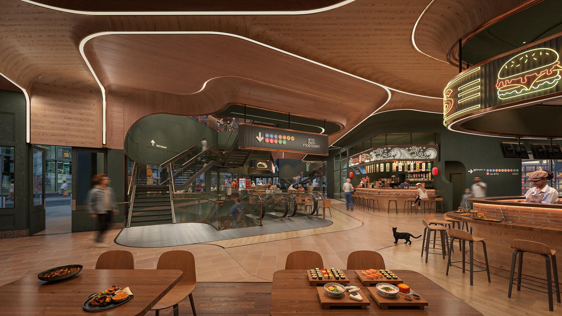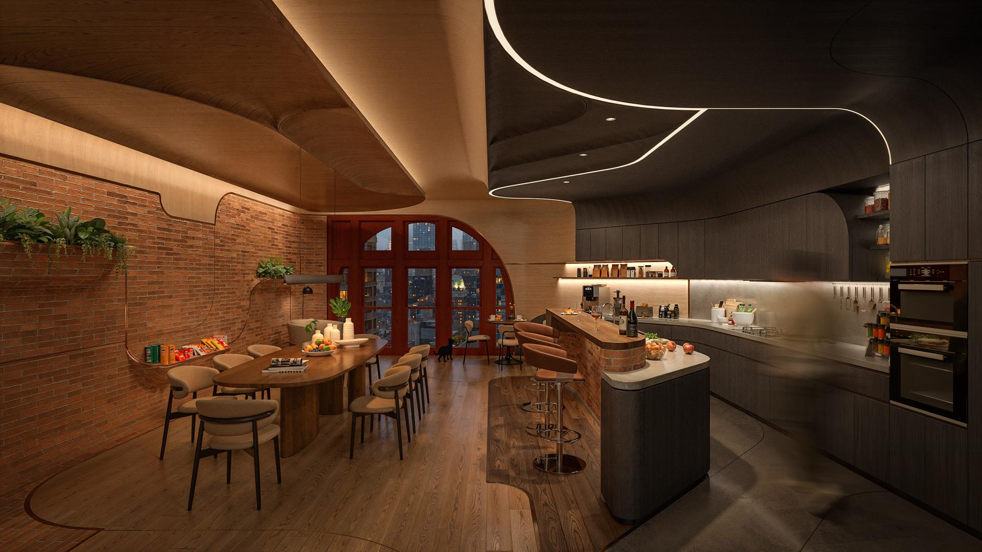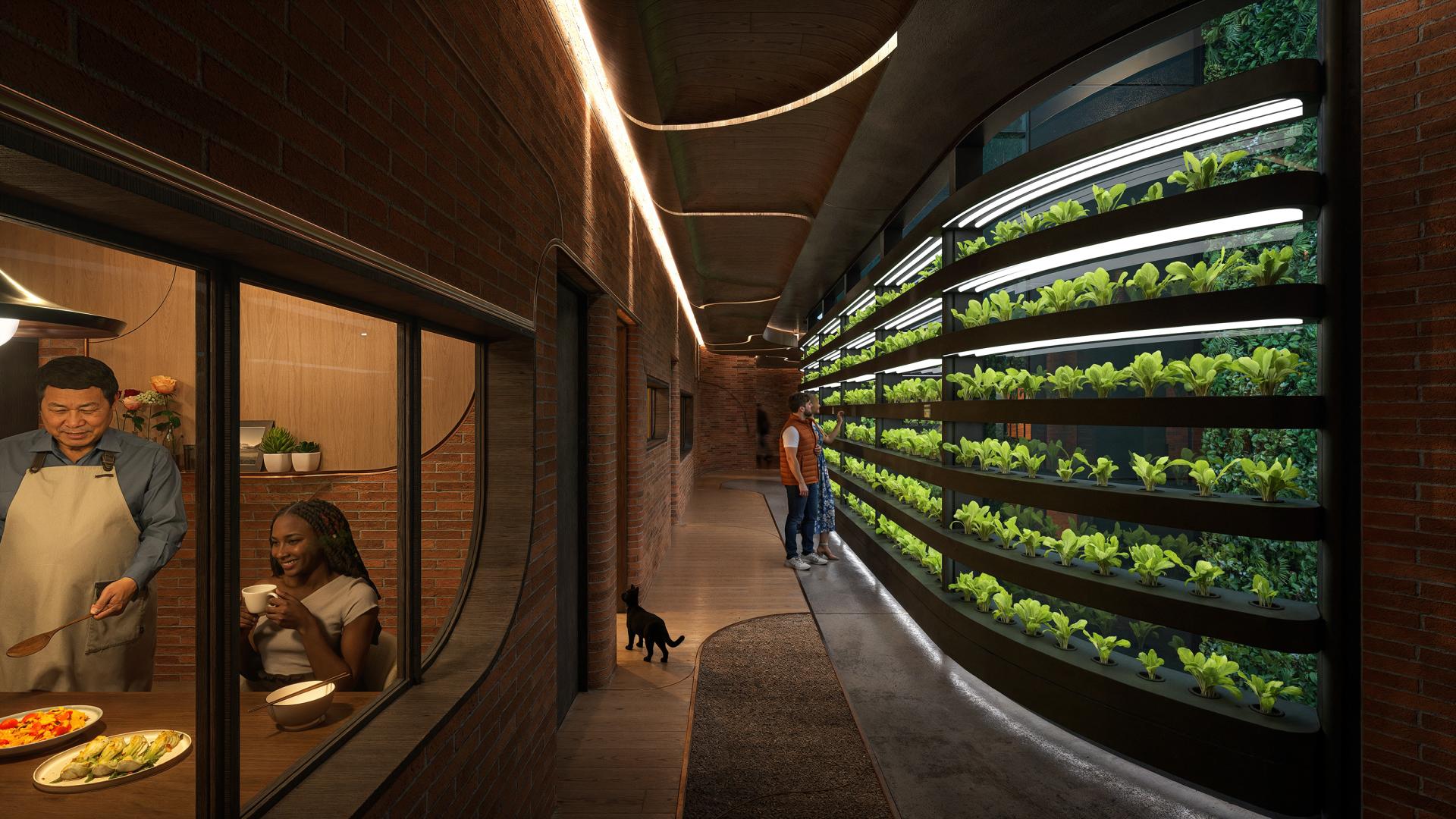 Food anchors the program as both theme and spatial connector. At ground level, semi-outdoor stalls and a food court spill into the Fulton Center concourse, activating the street and transit flows. The Fulton Center rooftop, once underutilized, is transformed into a public garden and bar with panoramic views. Residential levels minimize private kitchens in favor of shared kitchens and community dining areas, making cooking and eating collective rituals that strengthen social bonds.