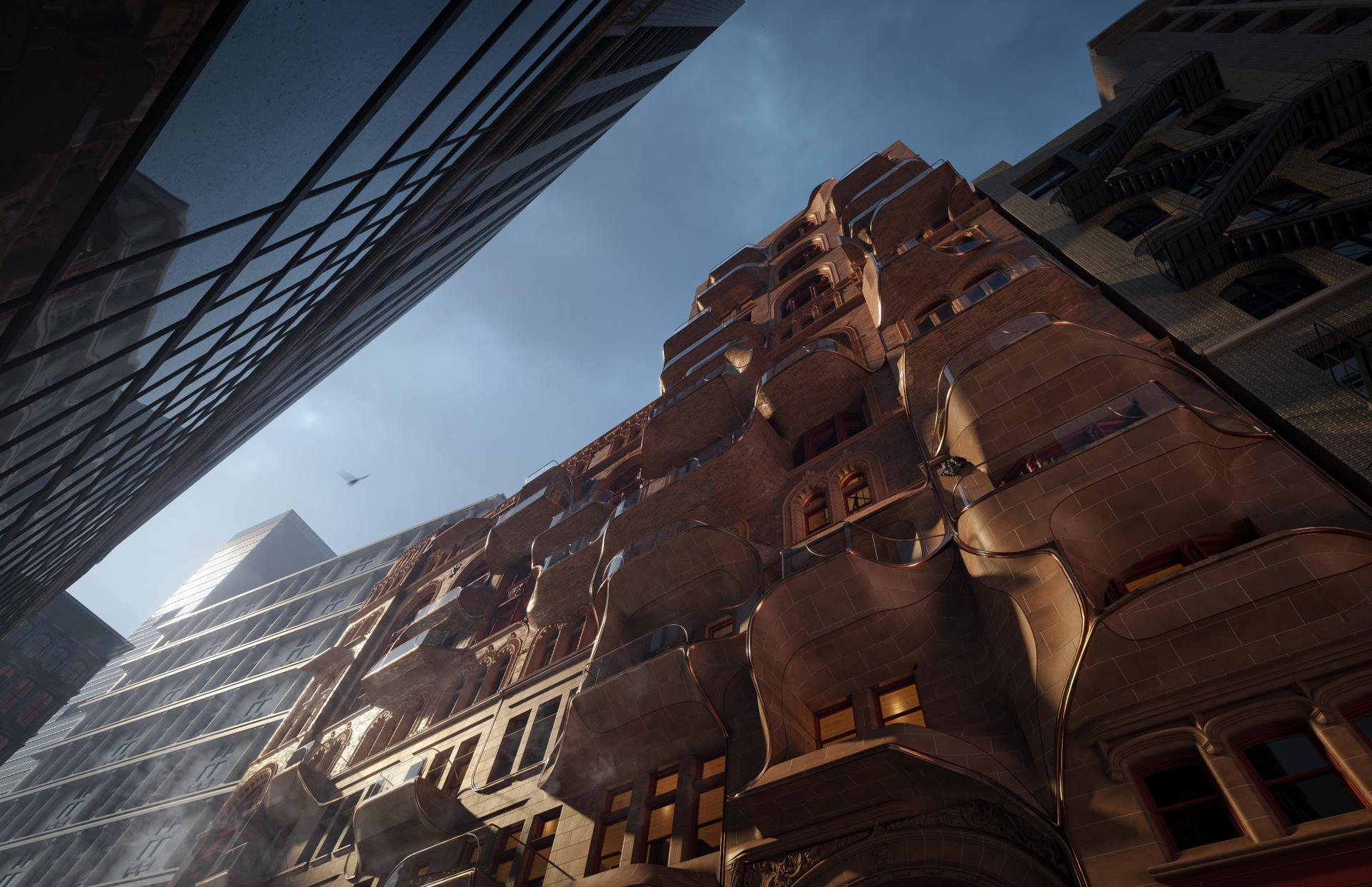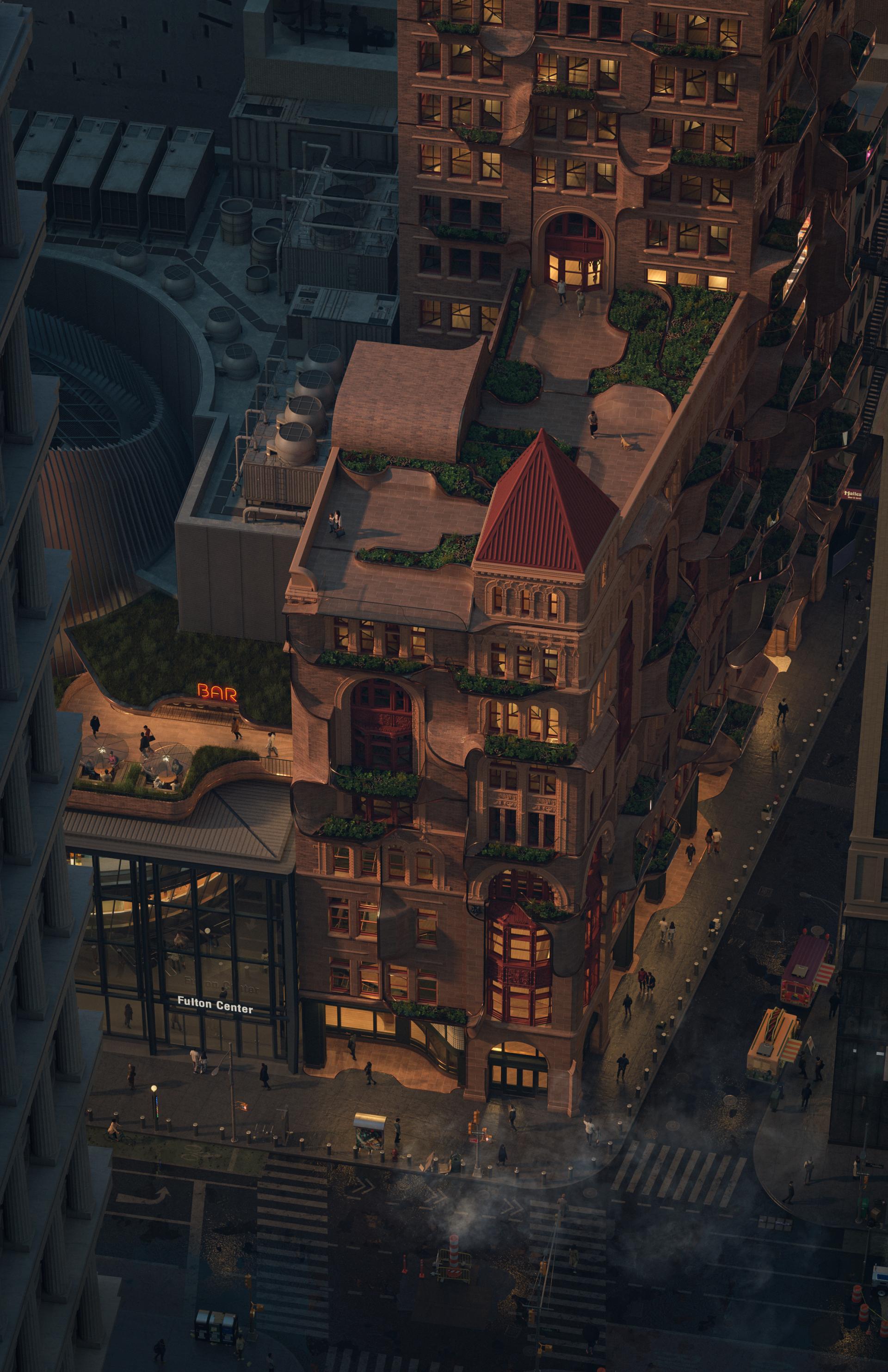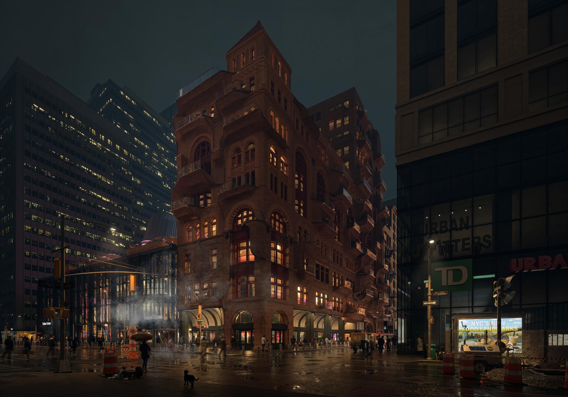 The Dissolving Corbin Building reimagines one of Lower Manhattan’s historic landmarks as a vertical mixed-use hub where heritage, public life, and contemporary urban culture converge. Built in 1889 by Francis H. Kimball for banker Austin Corbin, the original structure is celebrated for its richly ornamented Romanesque Revival façade and pioneering terracotta detailing. Today, positioned at Broadway and John Street and structurally integrated with the Fulton Center transit hub, it stands at one of New York’s busiest pedestrian nodes, embodying both the challenges and opportunities of adaptive reuse.