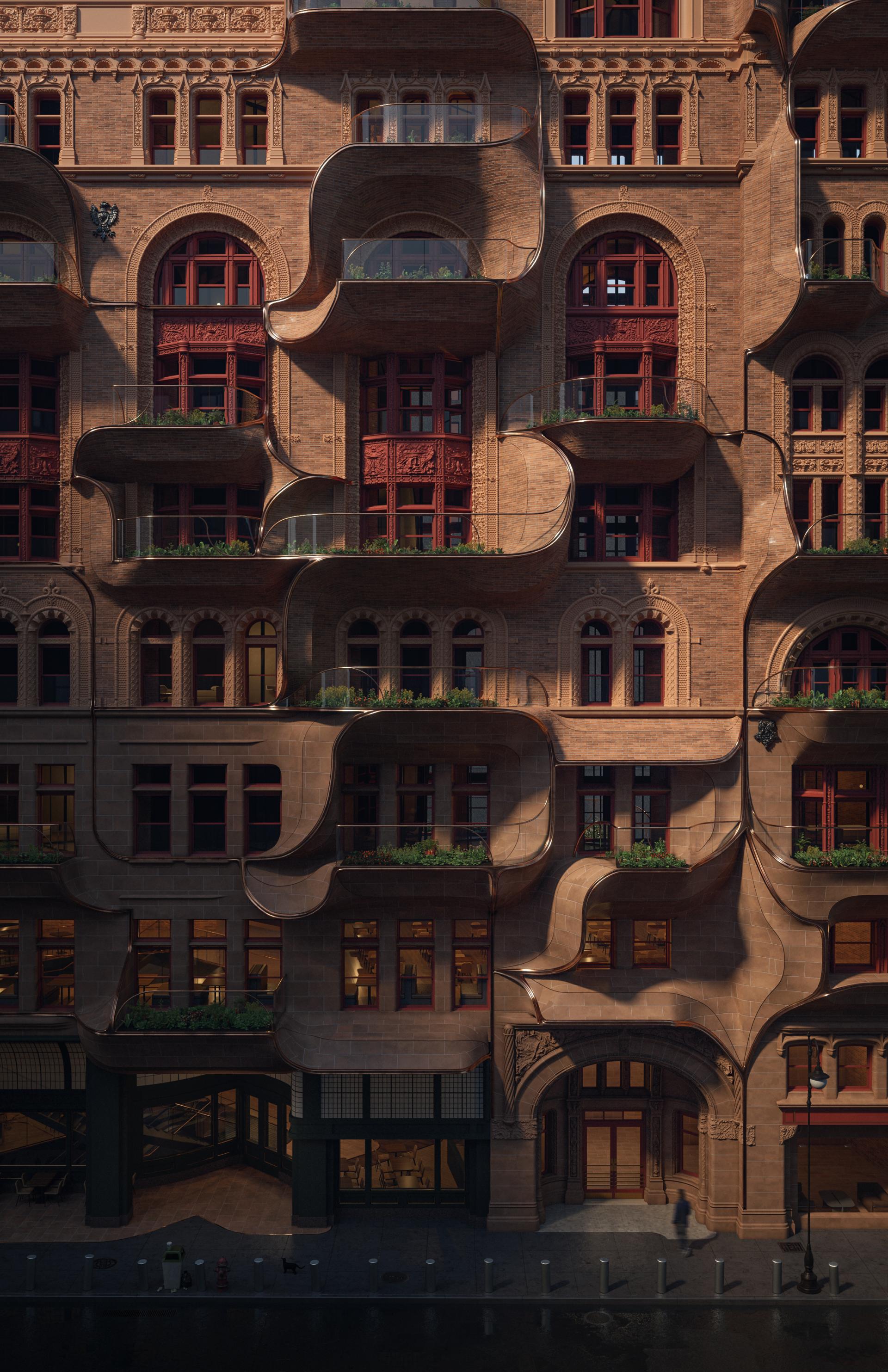 The design develops a strategy of “dissolving,” inspired by natural morphologies in which layered growth patterns express continuity and transformation. The historic façade is not erased by a uniform glass skin but bifurcates into a stratified envelope: brick-and-terracotta bays extend outward as planter modules, while recessed balcony zones are glazed. These three-dimensional interfaces form Y-shaped balconies that foster urban gardening, create depth for public interaction, and blur the boundaries between past and present.