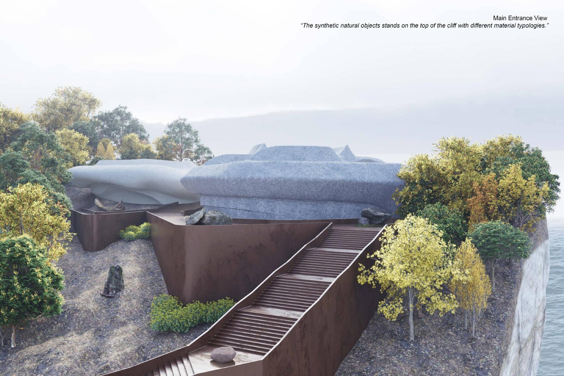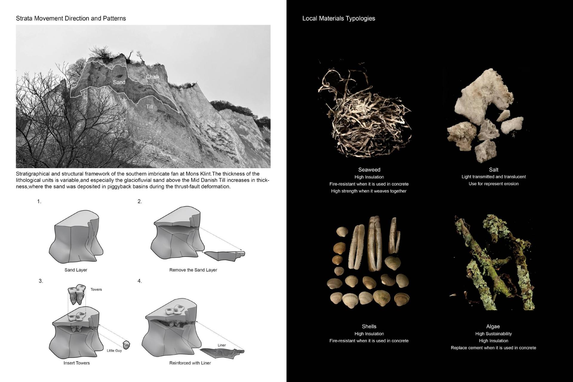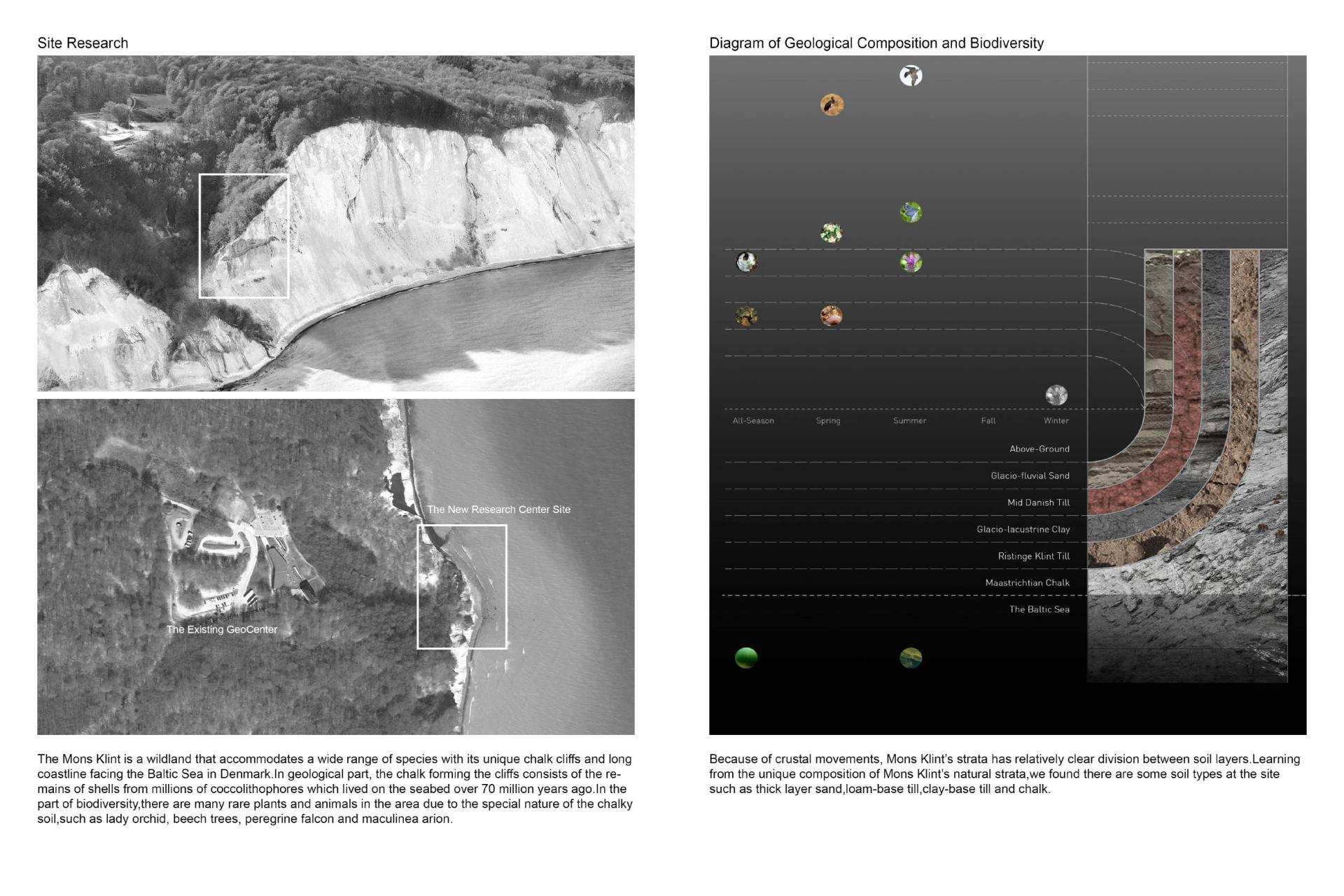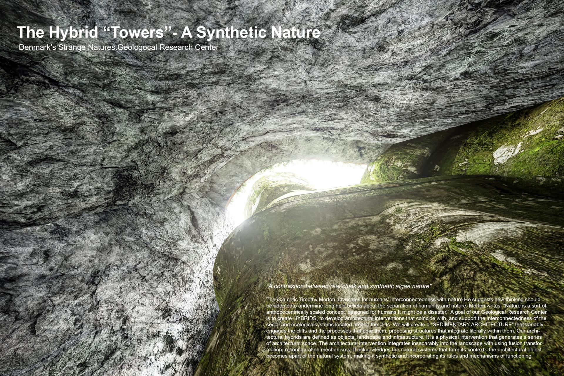 The eco-critic Timothy Morton advocates for humans' interconnectedness with nature. He suggests new thinking should be adopted to undermine long held beliefs about the separation of humanity and nature. He writes:Nature is a sort of anthropocentrically scaled concept.It might be a disaster.A goal of the Geological Research Center is to create HYBRIDS,to develop architectural interventions that coincide with,and support the interconnectedness of the social and ecological systems located among the cliffs. We will create a SEDIMENTARY ARCHITECTURE that variably engages the cliffs and the processes that bore them, proposing structures that integrate literally within them. The architectural hybrids are defined as objects, landscapes, and infrastructure. It is a physical intervention that generates a series of architectural space.The architectural intervention integrates inseparably into the landscape with using fusion, transformation,reconfiguration mechanisms. It acknowledges the natural systems that form its context—the architectural object becomes apart of the natural system,making it synthetic and incorporating its rules and mechanisms of functioning.This is a Nature-Inspired Design.We create "A Synthetic Nature". The site (MØNS KLINT)is one of the oldest fossil-rich cliffs in Denmark. The “site” contains the remains of