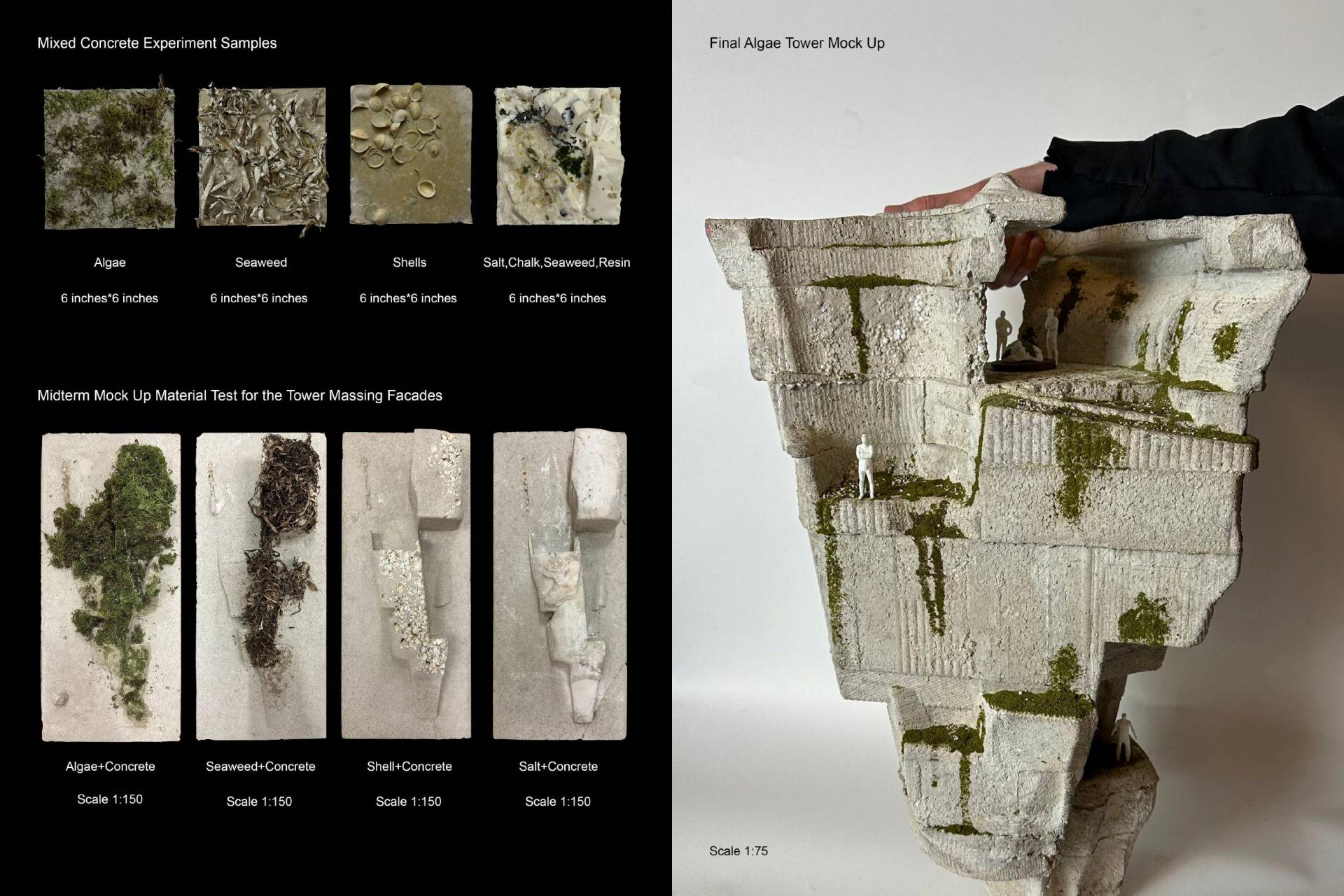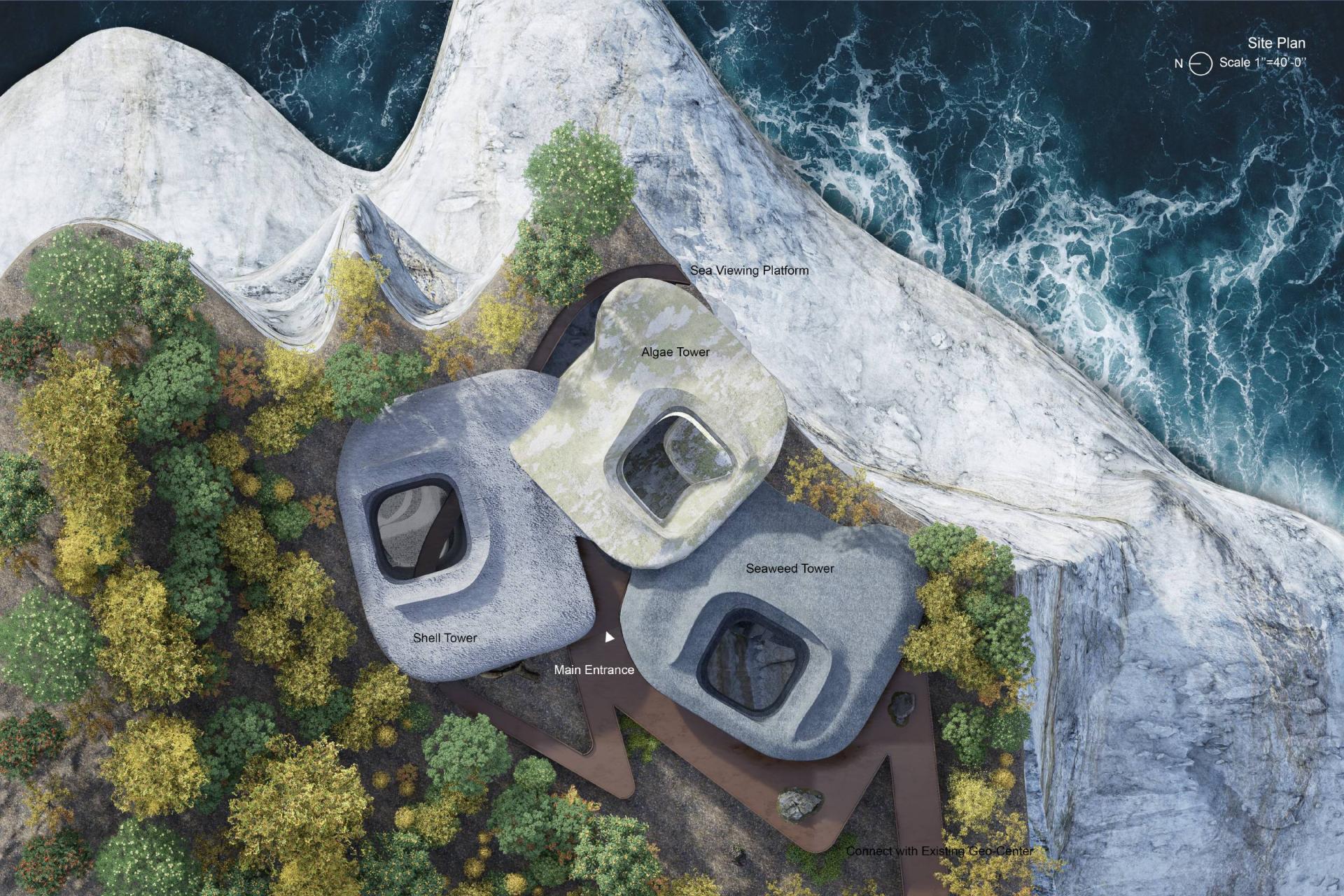 shells from millions of microscopic creatures known as coccolithophores, a type of algae. We used different local experimental materials, algae, shell, salt, and seaweed, to create 3 different topic towers with the experimental building technique-mix with concrete to make complex forms. The project is environmentally responsible and resource-efficient throughout the entire lifecycle, minimizing negative impacts while promoting human well-being.It uses sustainable,eco-friendly, recycled, and ethically sourced materials in construction.