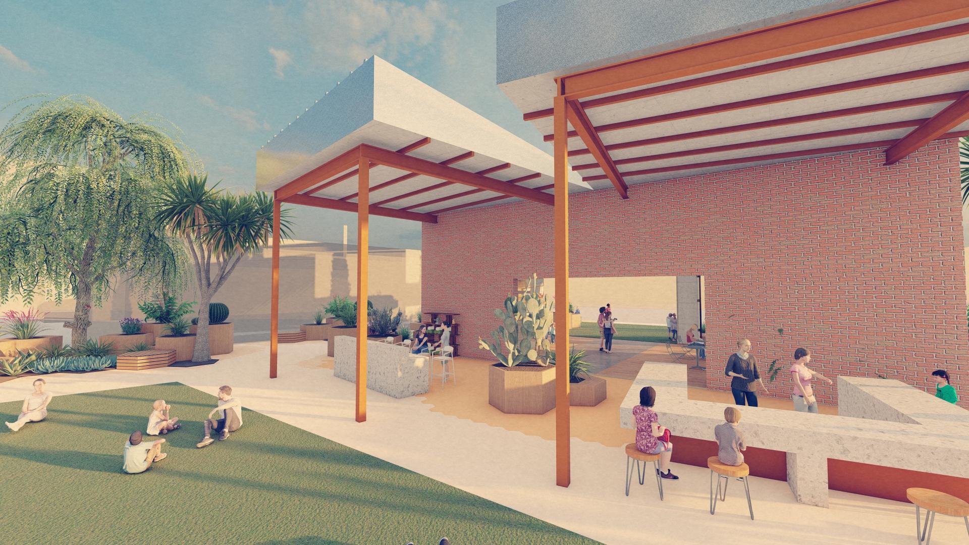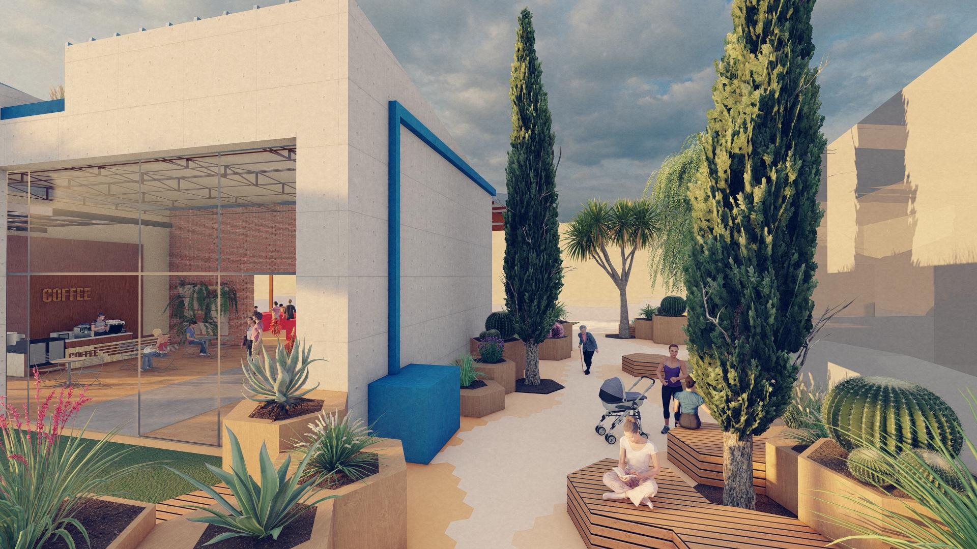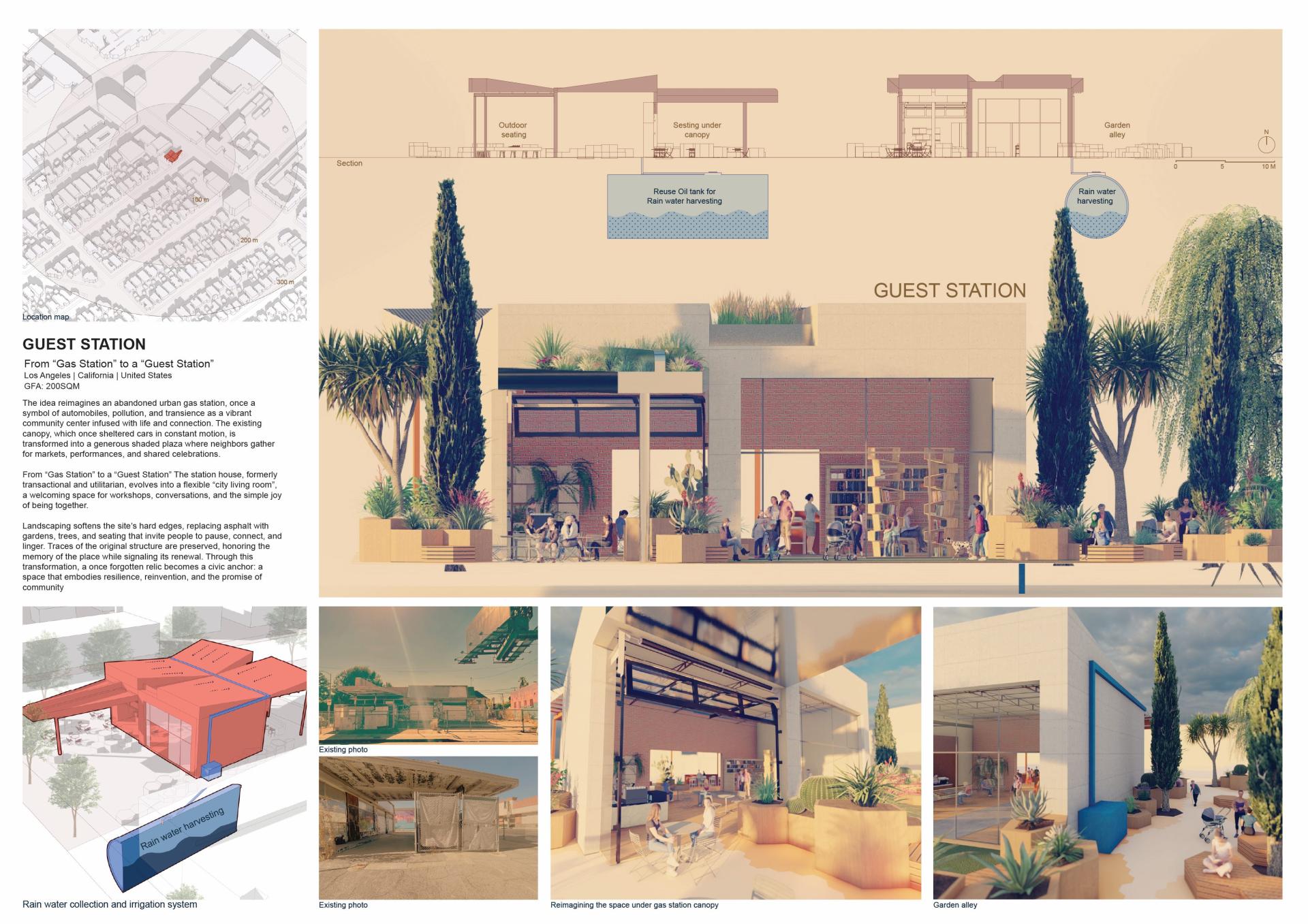 The idea reimagines an abandoned urban gas station, once a symbol of automobiles, pollution, and transience as a vibrant community center infused with life and connection. The existing canopy, which once sheltered cars in constant motion, is transformed into a generous shaded plaza where neighbors gather for markets, performances, and shared celebrations.