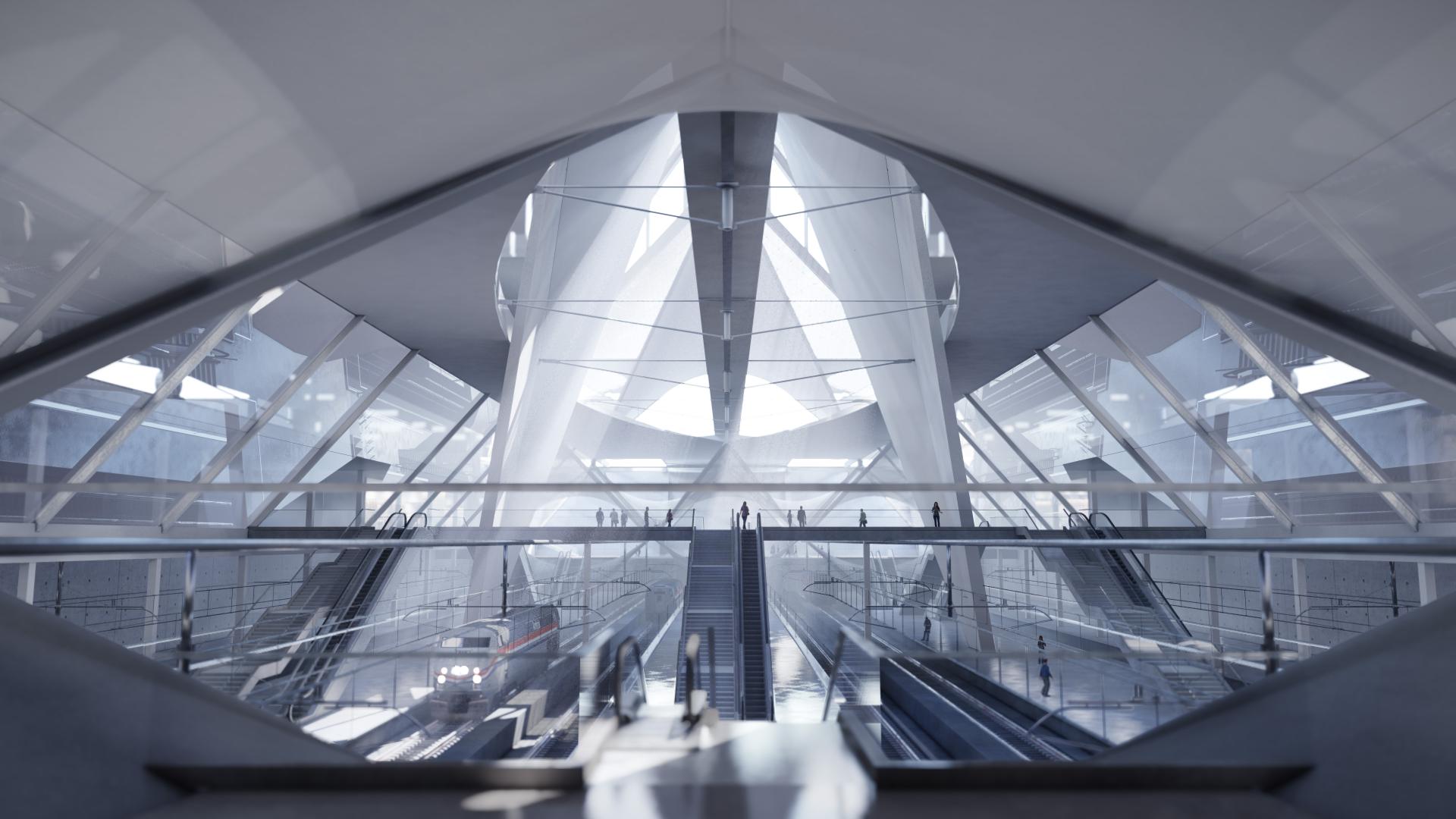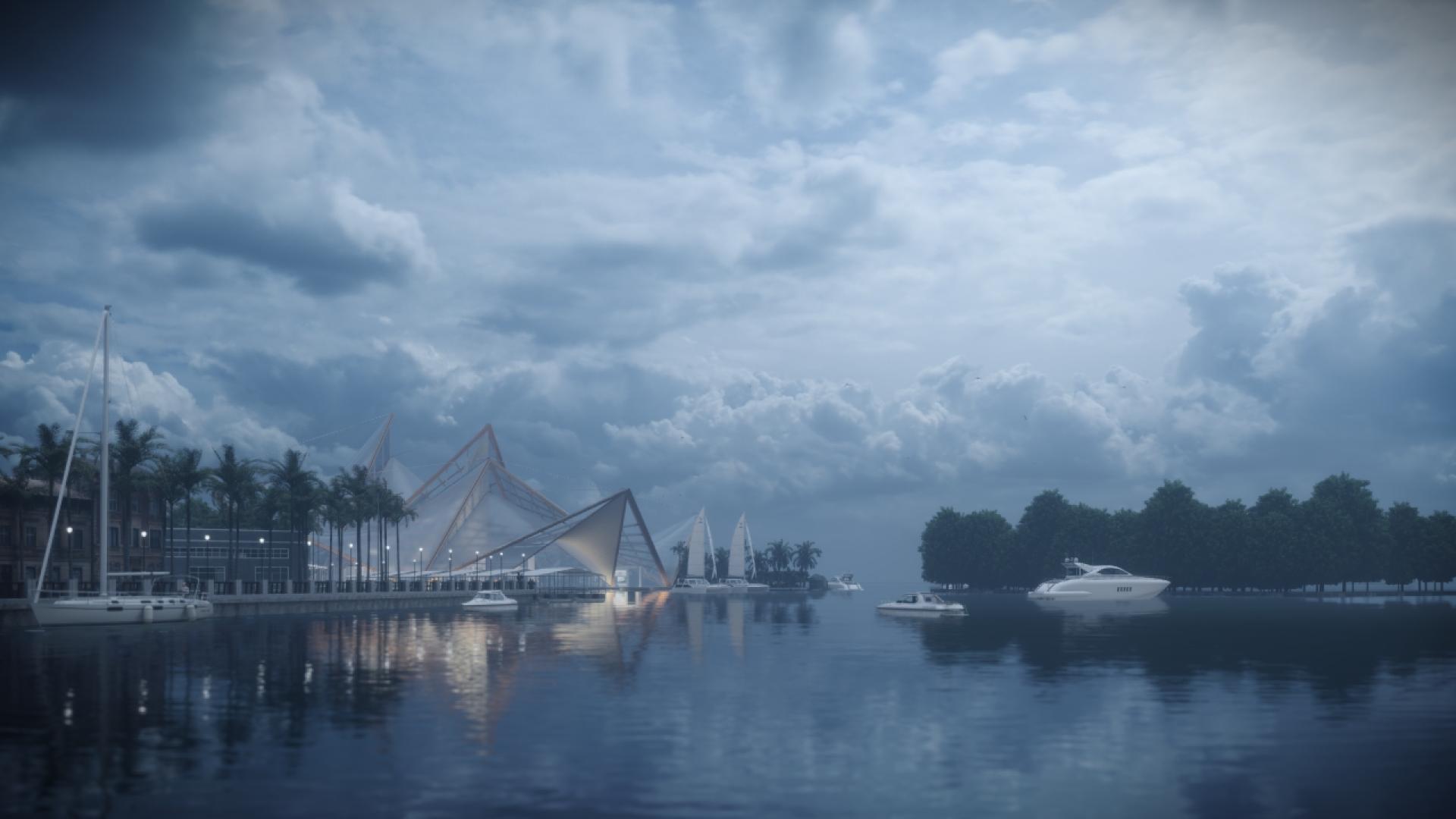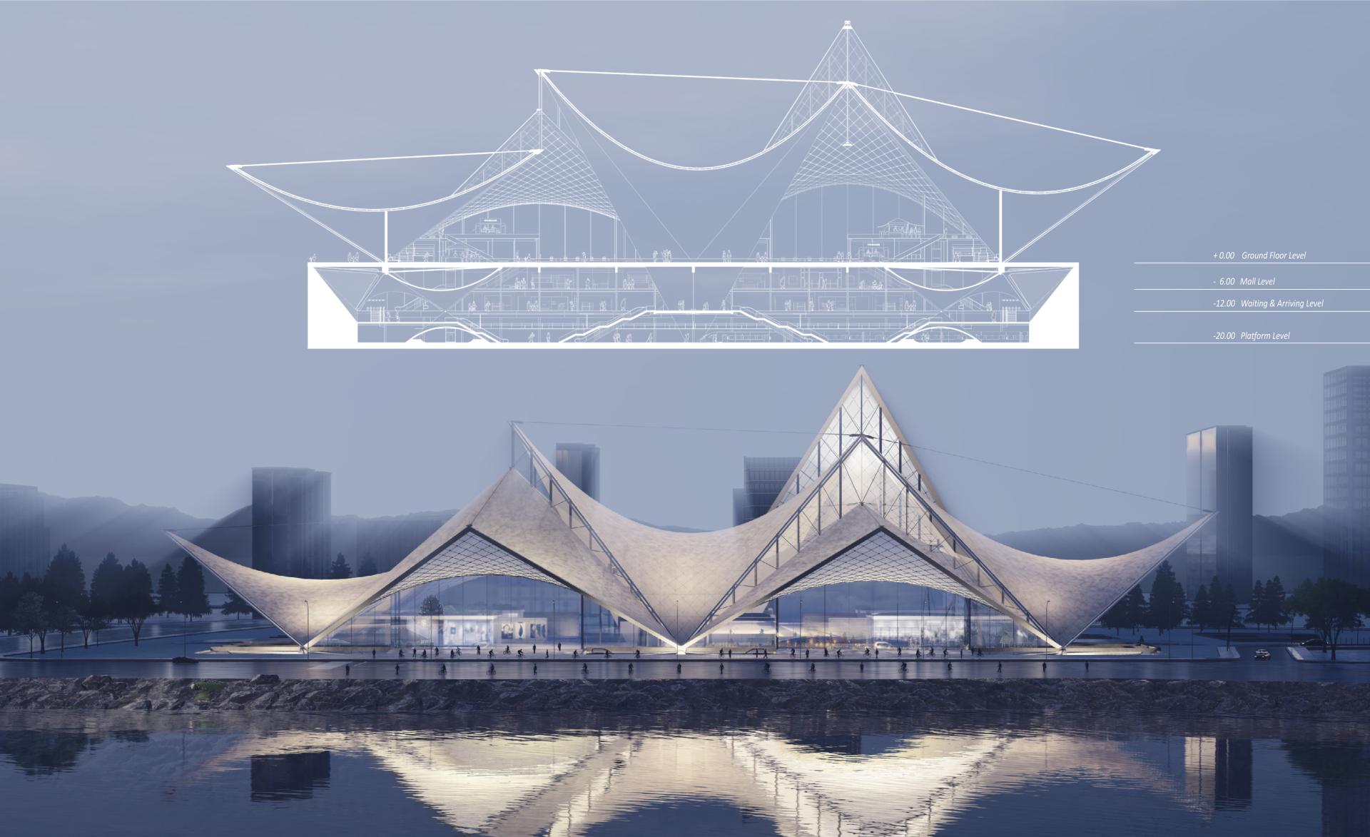 Located in Wuhan City, Hubei Province, this project is a transportation hub integrating subway, ferry, and commercial functions. It features a visually transparent large-span roof achieved through a tensile membrane structure. Combined with the glass curtain walls on the ground level, the design ensures an unobstructed view of the riverside landscape. The main functions are concentrated underground, seamlessly integrating intercity railway drop-off/pick-up and transfer flows with commercial and exhibition spaces. The design not only respects the historical and hydrological context of Wuhan’s Jianghan Guan area but also enhances its commercial value as a popular downtown district. The wing-like ruled-surface roof echoes the traditional legendary creature of Hubei, while the carved-out atrium pays homage to the Wuhan Railway Station. Through its historical context, modern commercial value, form, and spatial design, the project achieves an organic integration with the site itself.
