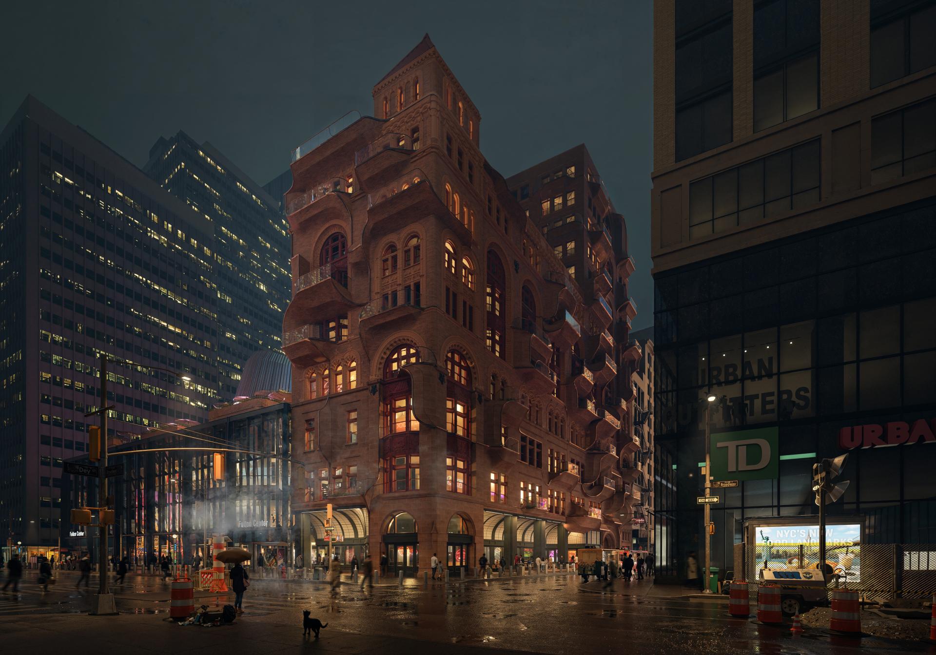 The Dissolving Corbin Building reimagines one of Lower Manhattan’s historic landmarks as a vertical mixed-use hub where heritage, public life, and contemporary urban culture converge. Built in 1889 by Francis H. Kimball for banker Austin Corbin, the original structure is celebrated for its richly ornamented Romanesque Revival façade and pioneering terracotta detailing. Today, positioned at Broadway and John Street and structurally integrated with the Fulton Center transit hub, it stands at one of New York’s busiest pedestrian nodes, embodying both the challenges and opportunities of adaptive reuse.