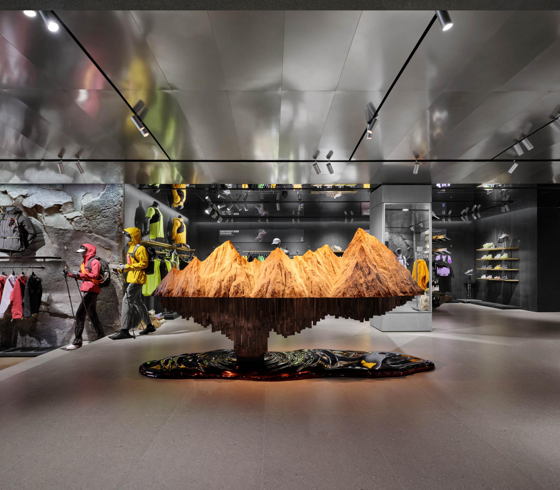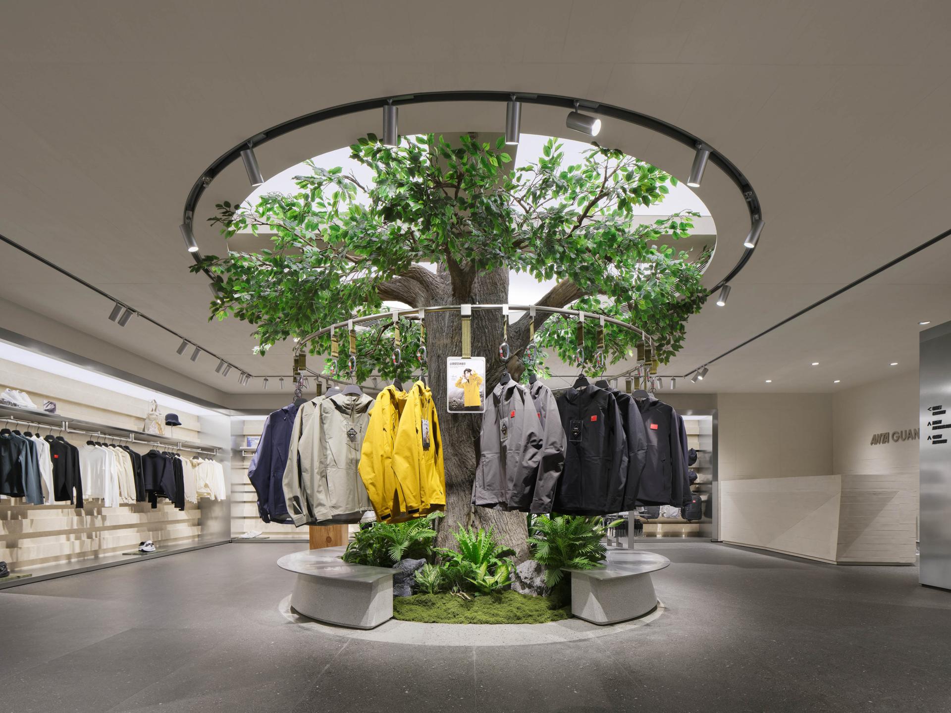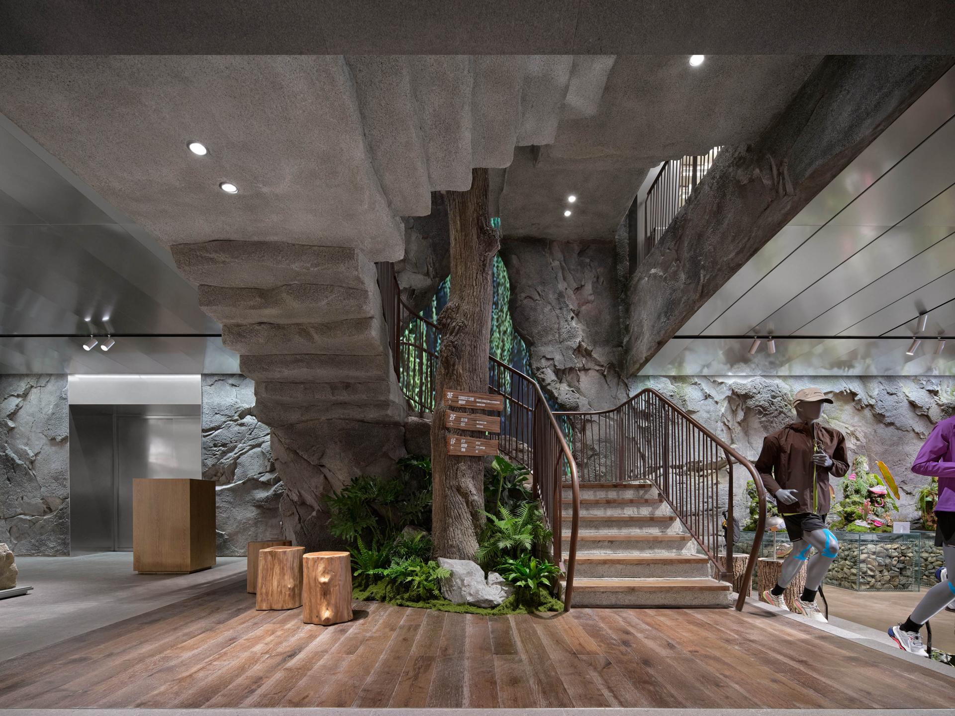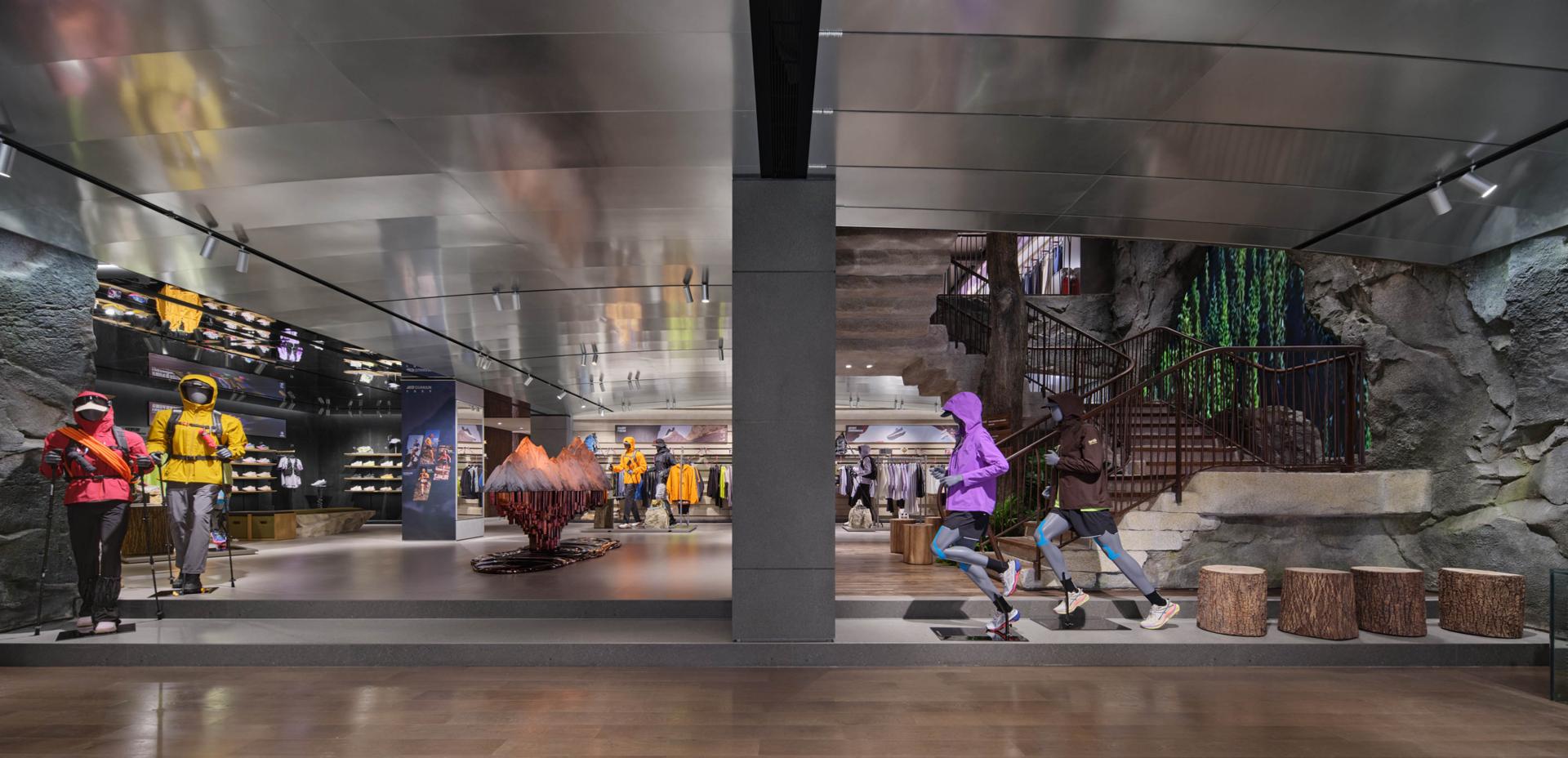Drawing inspiration from the scene of “Sunlit Golden Mountains,” the facade, along with the original corners of the building, perfectly mimics the textures and contours of Chinese mountains; under natural sunlight, it presents a distinctive style that blends majestic natural beauty with a vigorous brand image—leaving a lasting impression on consumers and conveying the spirit of outdoor exploration. Inside, the store features several floors, each with its own character. The first floor focuses on outdoor trail running, displaying shoe installations created in collaboration with artists and offering products across multiple categories (hiking, trail running, skiing, etc.); dark herbal bricks paired with accent lighting, the mirrored ceiling for a visually roomier effect, and natural elements like tree bark textures applied to fitting rooms, collectively create an immersive outdoor atmosphere. The second floor emphasizes all conditions gear and serves as the main shoe area; the “Jacket Bar under the Tree” bathed in natural light becomes a focal point, further reinforcing the unique urban-outdoor vibe. The third floor is tailored for exhibition and experience, while also incorporating a coffee bar, supporting community events, DIY activities, brand showcases, and product launches. As a core circulation hub connecting these floors, the staircase is a key element for the immersive ambience. Designed like a mountain trail, it employs trees and other green plants, uniquely shaped stones, as well as dynamic video projections. As customers ascend, they are transported into a mountain trek—deeply experiencing the trail-running culture and the spirit of exploration at the heart of the brand.