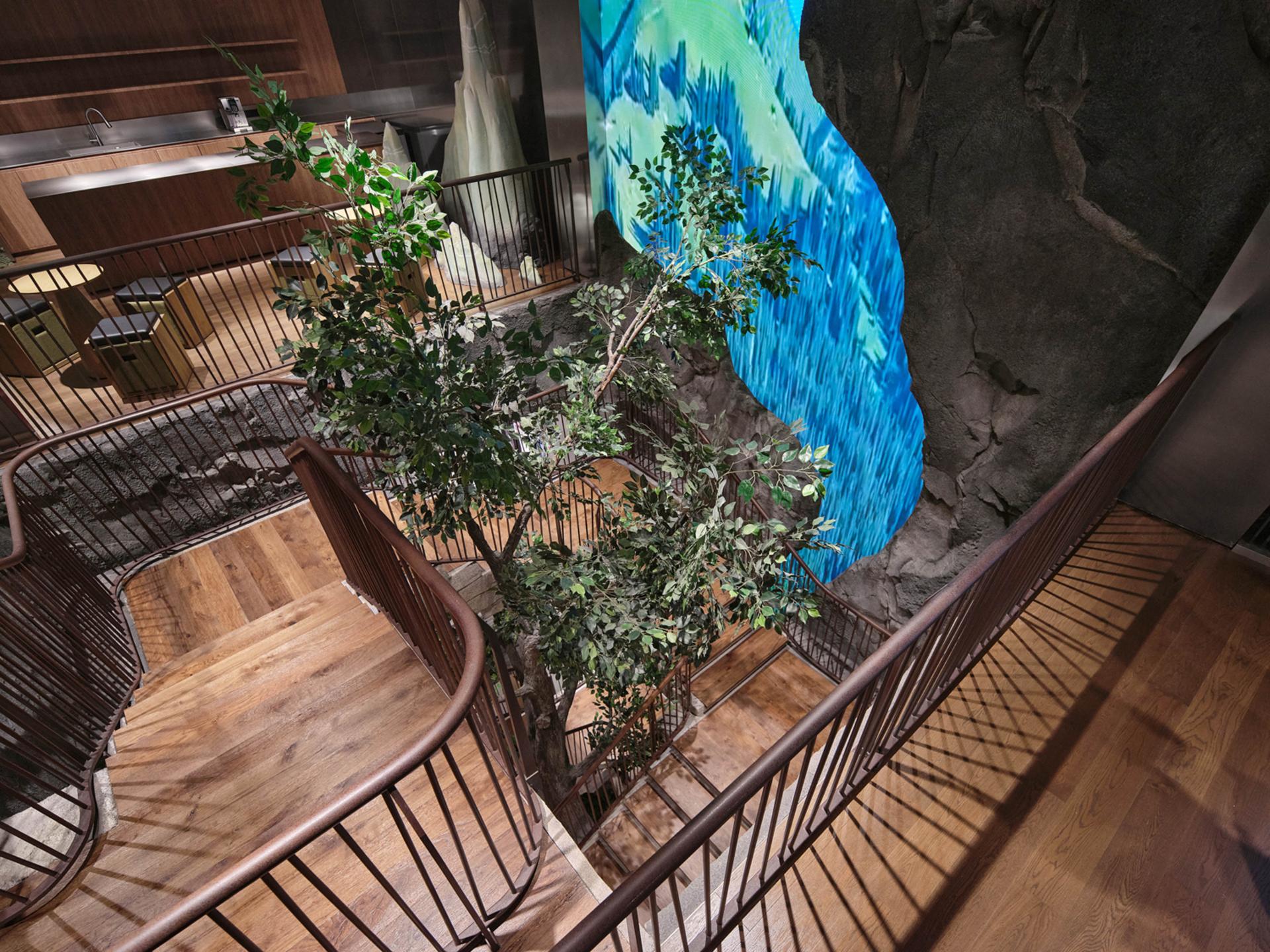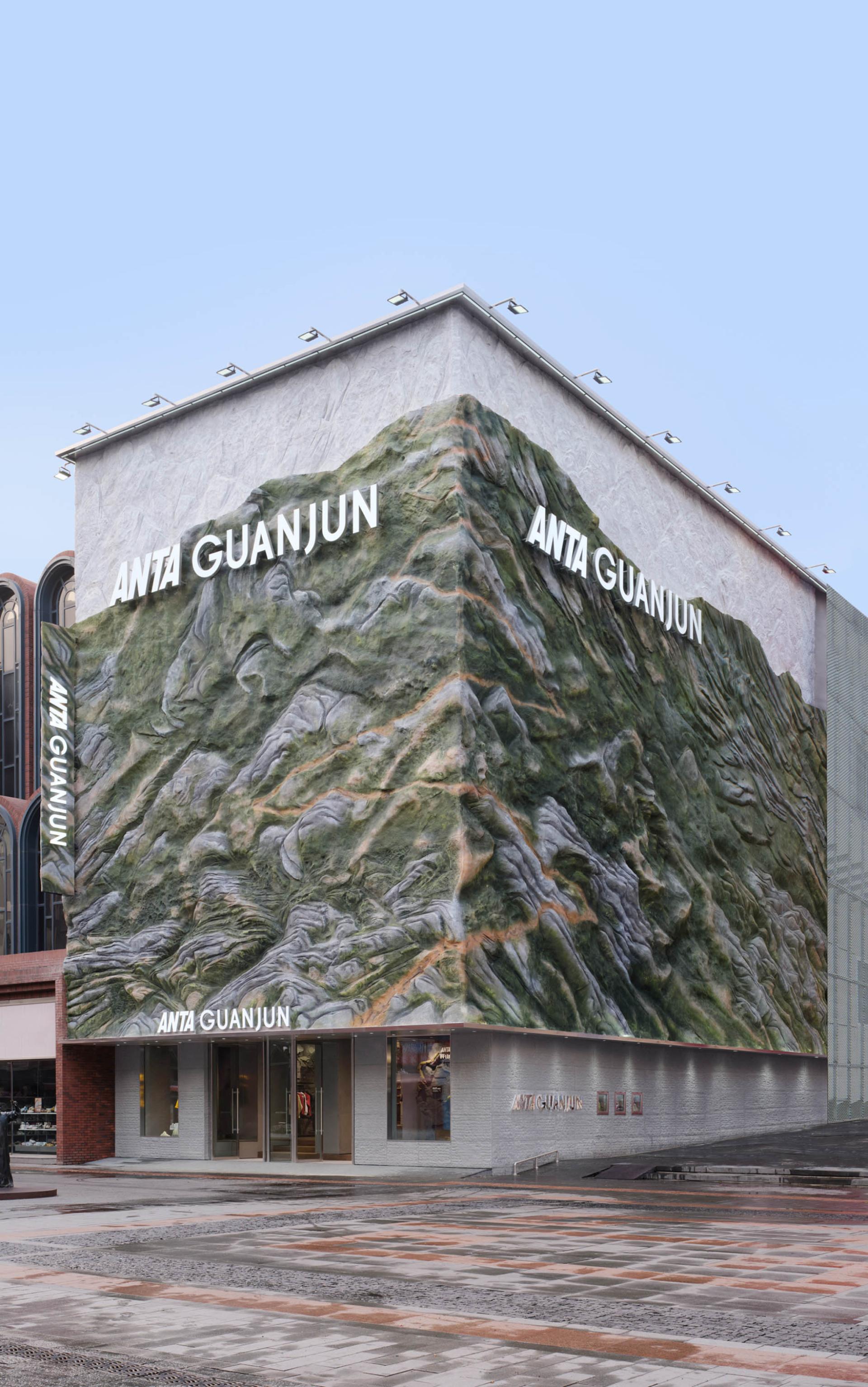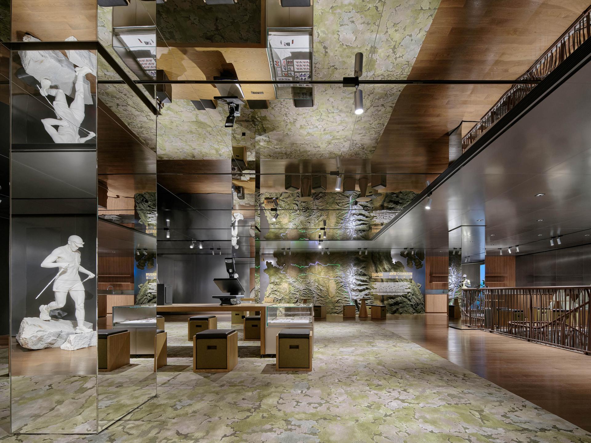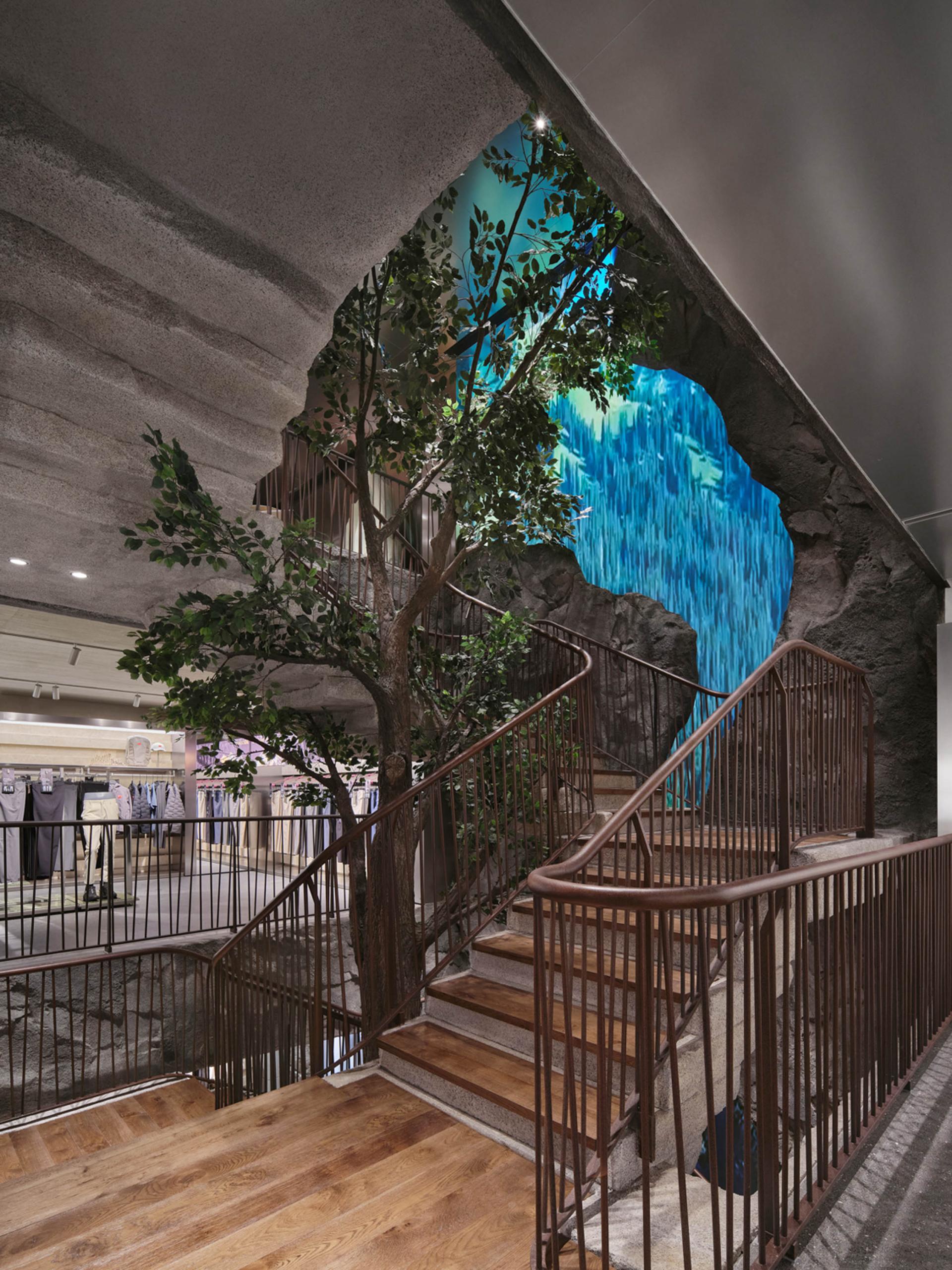 Drawing inspiration from the scene of “Sunlit Golden Mountains,” the facade, along with the original corners of the building, perfectly mimics the textures and contours of Chinese mountains; under natural sunlight, it presents a distinctive style that blends majestic natural beauty with a vigorous brand image—leaving a lasting impression on consumers and conveying the spirit of outdoor exploration. Inside, the store features several floors, each with its own character. The first floor focuses on outdoor trail running, displaying shoe installations created in collaboration with artists and offering products across multiple categories (hiking, trail running, skiing, etc.); dark herbal bricks paired with accent lighting, the mirrored ceiling for a visually roomier effect, and natural elements like tree bark textures applied to fitting rooms, collectively create an immersive outdoor atmosphere. The second floor emphasizes all conditions gear and serves as the main shoe area; the “Jacket Bar under the Tree” bathed in natural light becomes a focal point, further reinforcing the unique urban-outdoor vibe. The third floor is tailored for exhibition and experience, while also incorporating a coffee bar, supporting community events, DIY activities, brand showcases, and product launches. As a core circulation hub connecting these floors, the staircase is a key element for the immersive ambience. Designed like a mountain trail, it employs trees and other green plants, uniquely shaped stones, as well as dynamic video projections. As customers ascend, they are transported into a mountain trek—deeply experiencing the trail-running culture and the spirit of exploration at the heart of the brand.