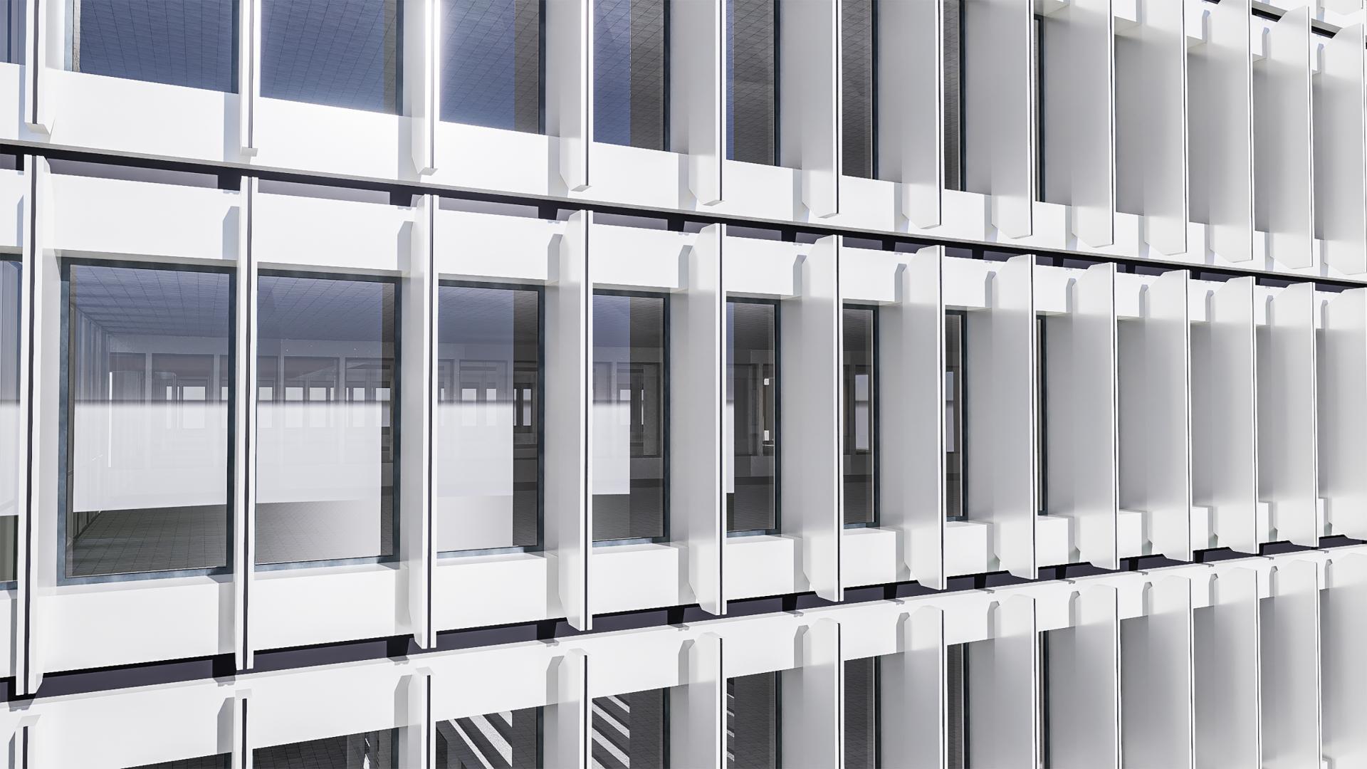 Through strategically arranged vertical perforated grilles and horizontal lines, this project interprets the philosophy of "bone as framework, tendon as network" on the facade. The double-layer-skin system, composed of outer grilles with perforated mesh and inner glass curtain walls, creates a pure and elegant visual effect. It also serves as the building's "functional skin", facilitating natural ventilation and thermal buffering, thereby promoting low-carbon operations.