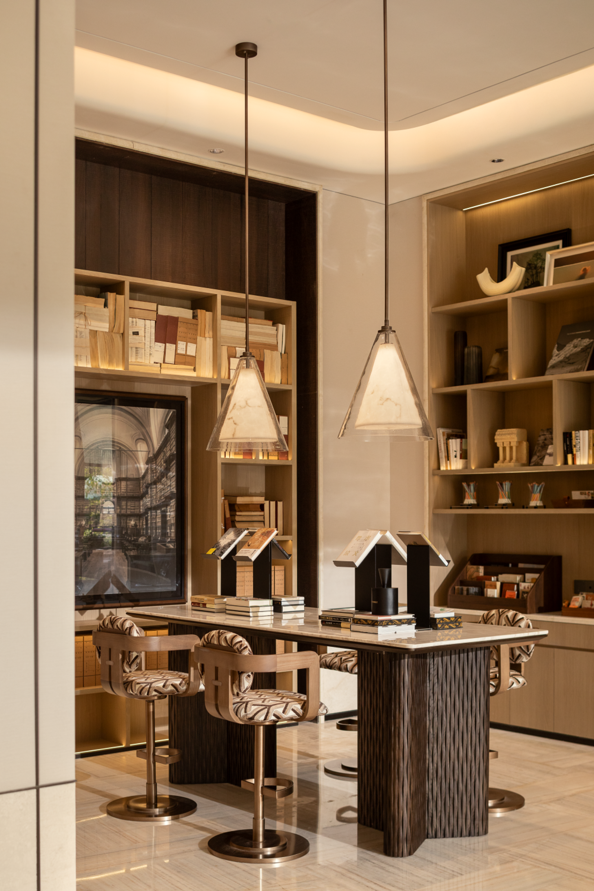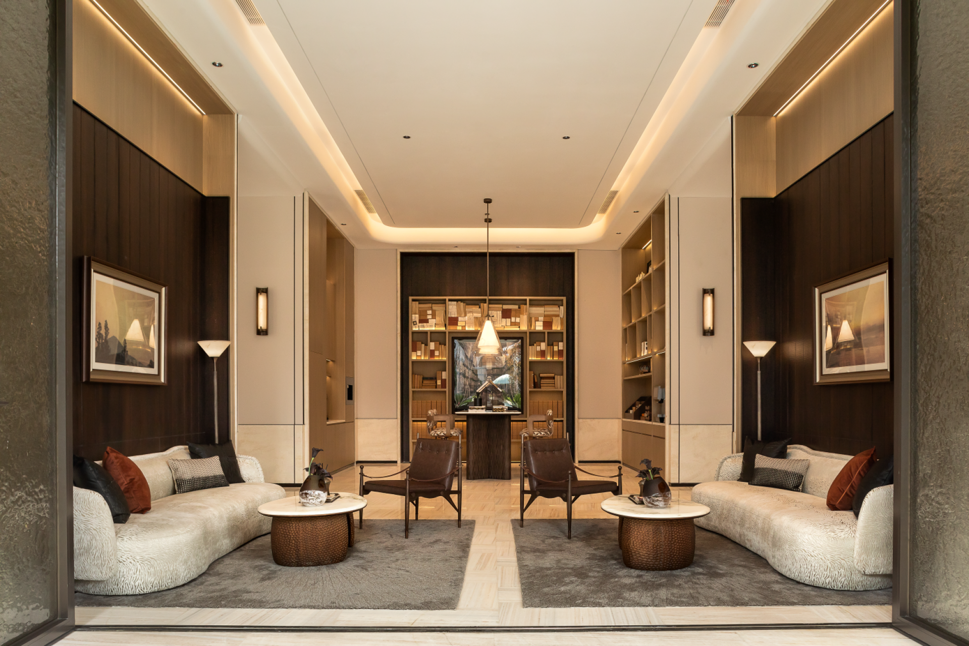 The architectural language is drawn outward into landscape. Outdoor lamps and planter bowls quote the building’s own lines, forging one continuous aesthetic. In the ground-floor lobby, underground drop-off and typical-floor lift lobbies, bold art light-boxes act as way-finding beacons, layering light and shadow to give the street-facing zones a distinct identity—and a sense of home.
