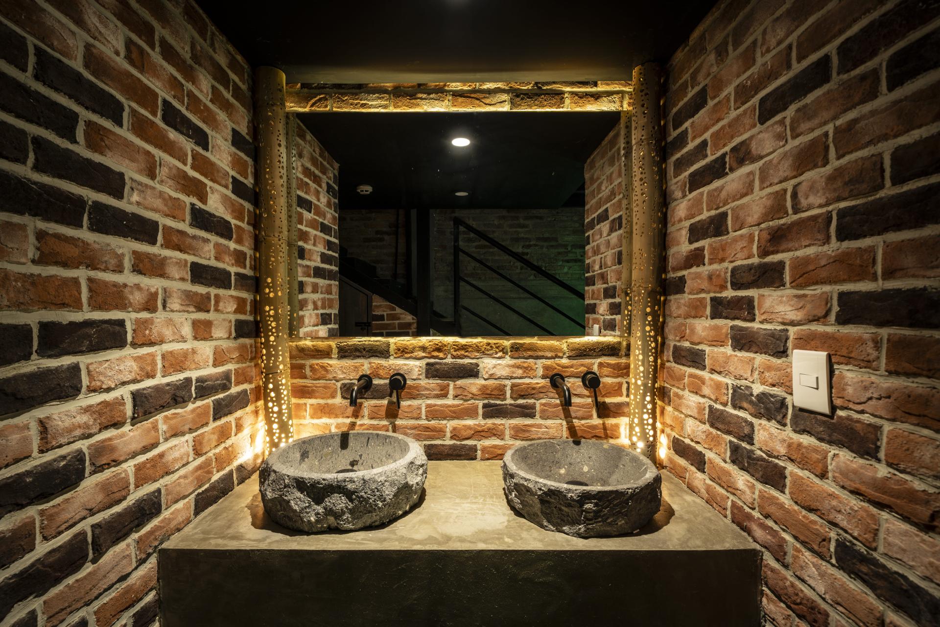 At the counter, lighting inspired by Studio Ghibli’s Laputa uses visible piping, evoking an imaginative mechanical world. A mezzanine structure maximizes the high ceiling: the lower floor hosts the main bar and open kitchen, while the loft provides an intimate perch for guests.