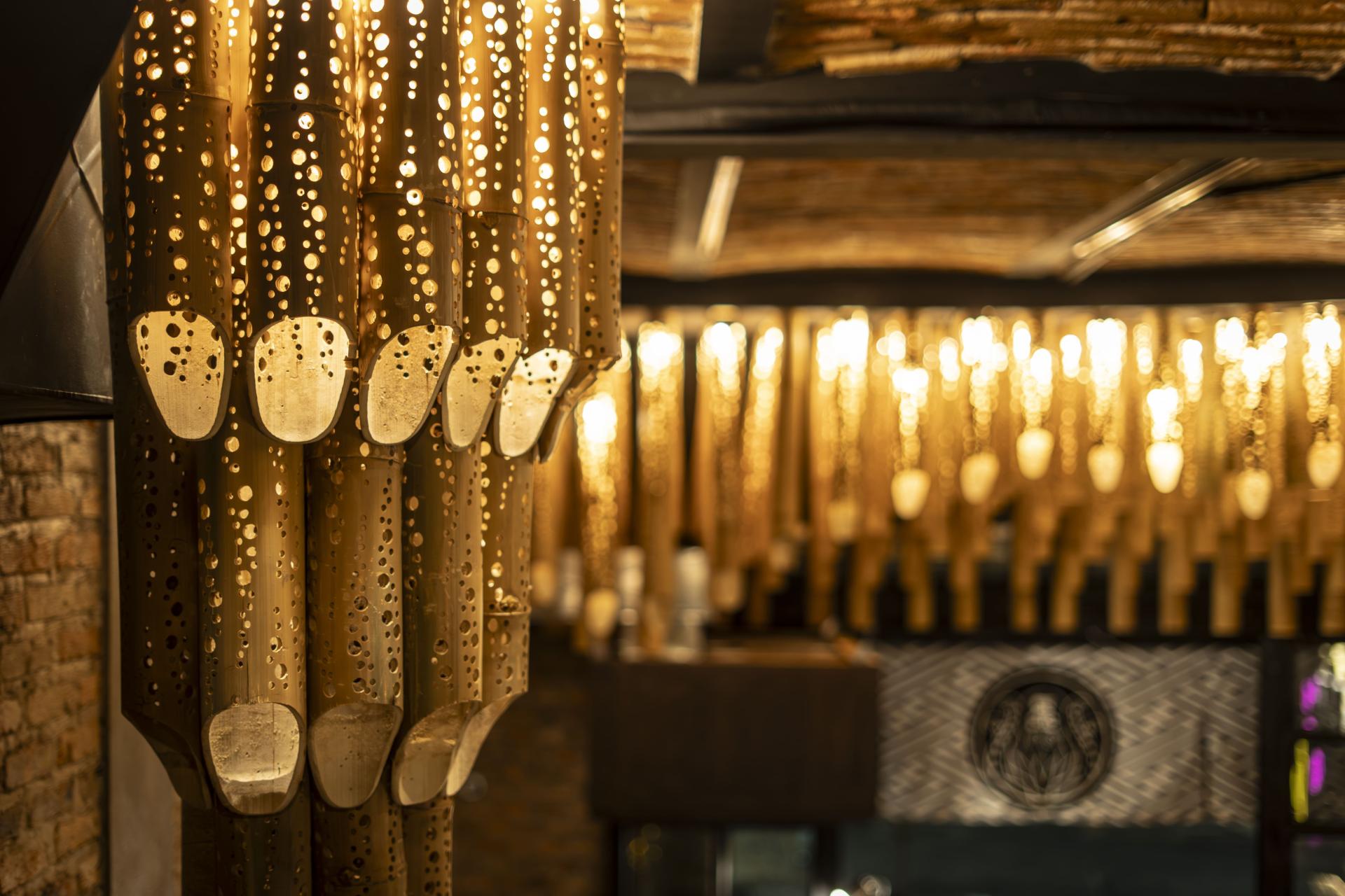Bamboo lanterns (Takeakari) softly illuminate the space with an organic rhythm, while a dramatic mural in sumi-e ink depicts an octopus—symbolizing both the dish’s core ingredient and the poetic fluidity of Japanese artistry. Traditional ranma latticework is integrated into furniture, allowing craftsmanship to converse with modern lines.