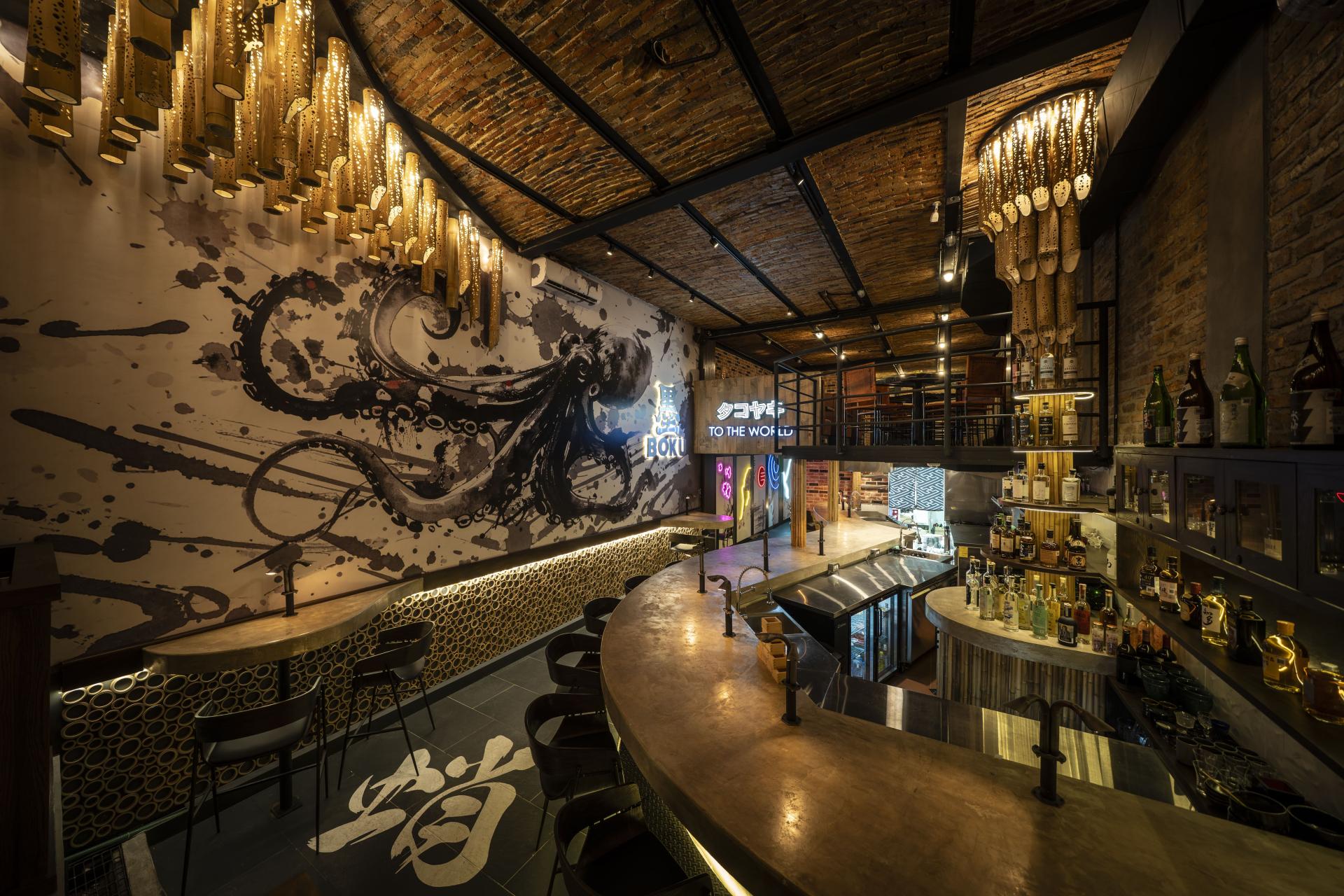 BOKU celebrates takoyaki, Japan’s iconic octopus-filled street food, as its main concept. The octopus—central to the cuisine—also becomes the spatial metaphor that shapes the design language. The curved bar counter, which encourages group conversation, subtly recalls the movement of octopus tentacles when seen from above, uniting food and form in a single narrative gesture.