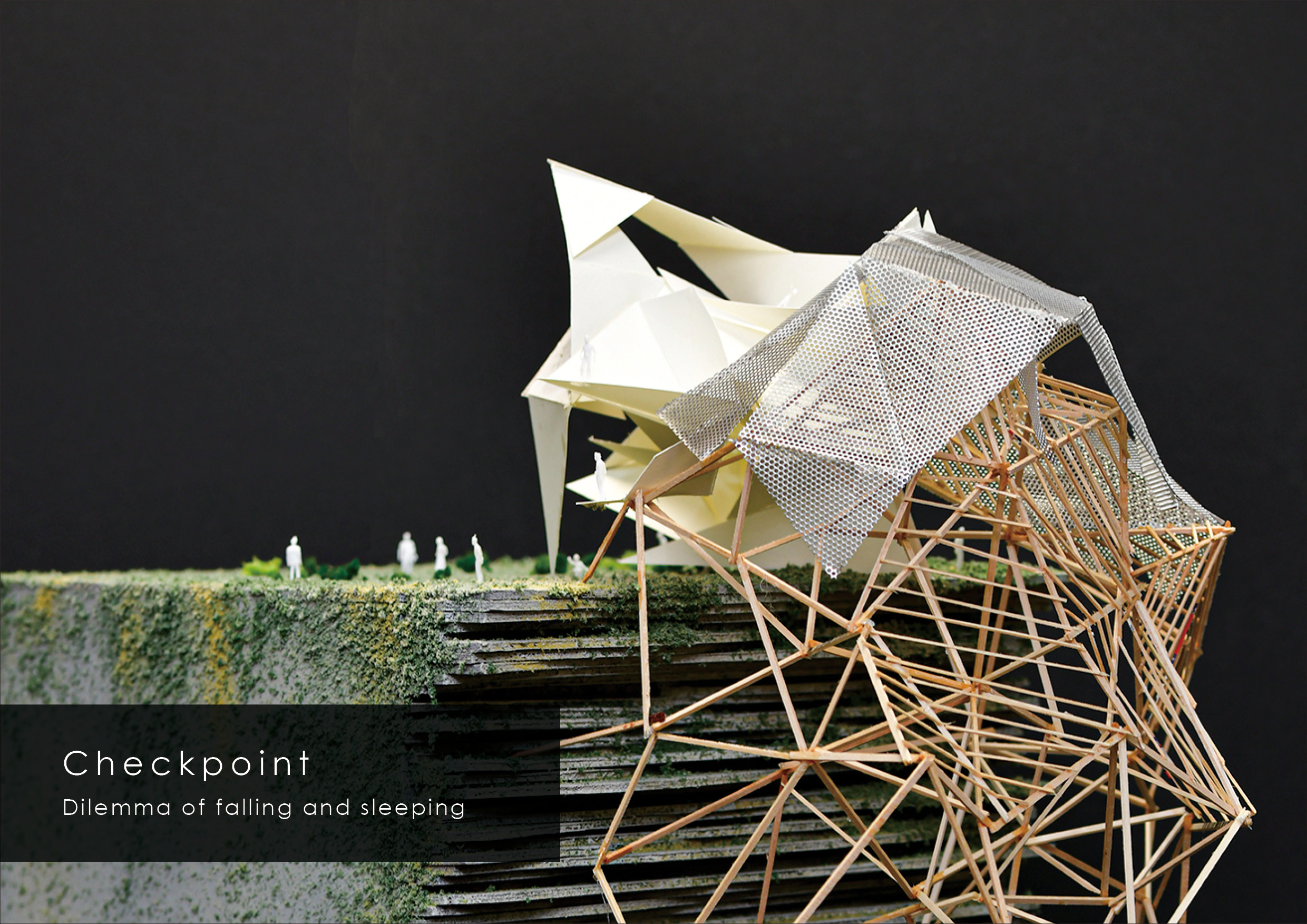 Checkpoint serves as a temporary refuge for rock climbers—a modular shelter functioning as a “checkpoint” along extended climbing routes. In long-range expeditions, climbers often rest overnight in hammocks or tents suspended from anchors on the rock face. However, these systems are highly susceptible to failure due to strong winds, unstable anchor points, or accidental movements during sleep.