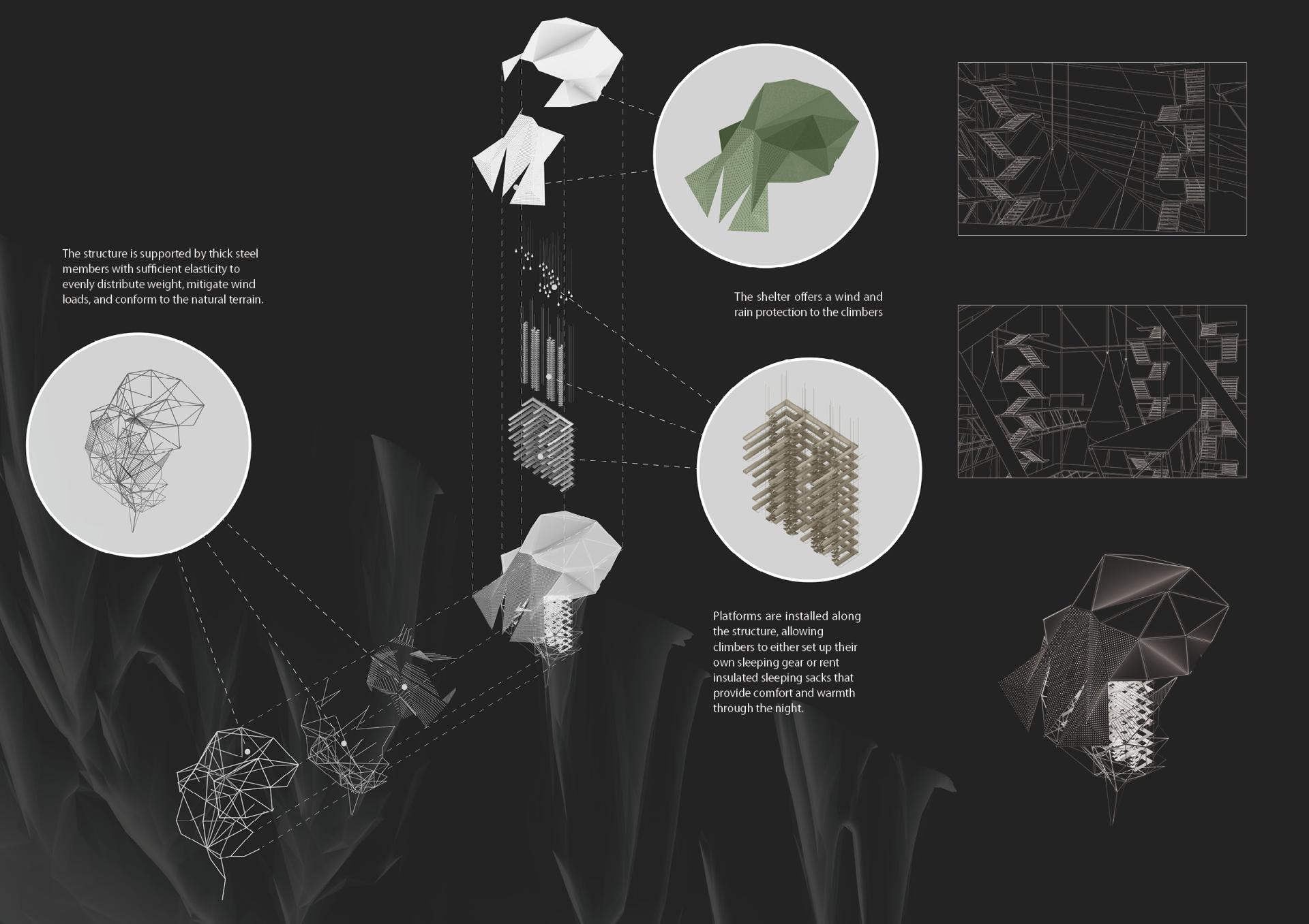 Addressing the unpredictability of such conditions, Checkpoint introduces a portable, secure shelter that provides climbers with a stable environment to pause, rest, and recover within otherwise hazardous vertical terrains.