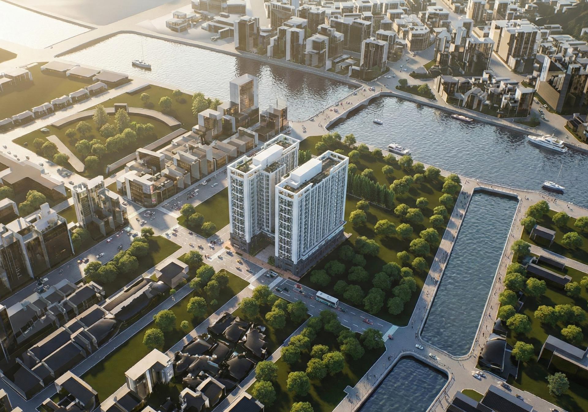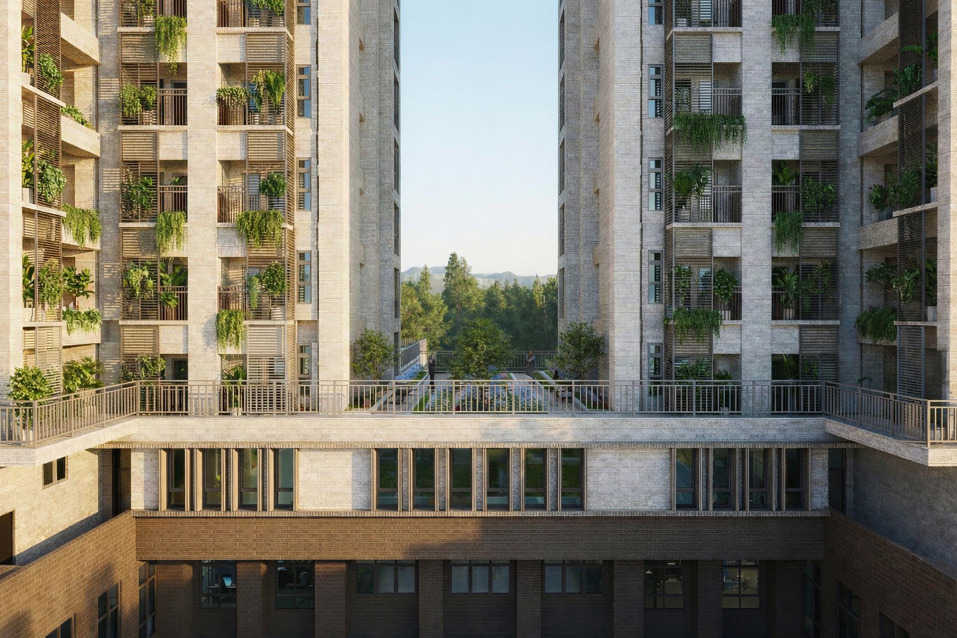 The architectural massing adopts a north-south orientation, featuring two towers. Prioritizing "Visual Justice," a strategic central void preserves view corridors for neighbors. At the ground plane, a porous lobby fosters seamless transitions between the anterior and posterior plazas, channeling cooling natural ventilation from the adjacent river into the urban fabric.