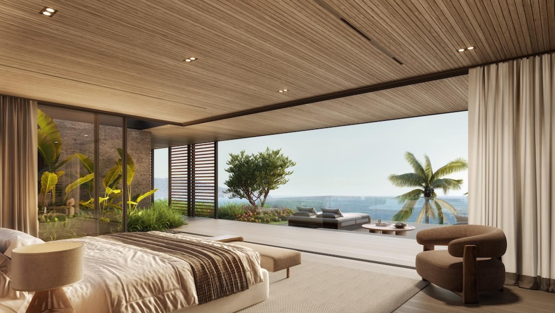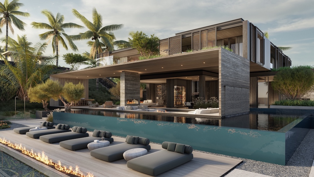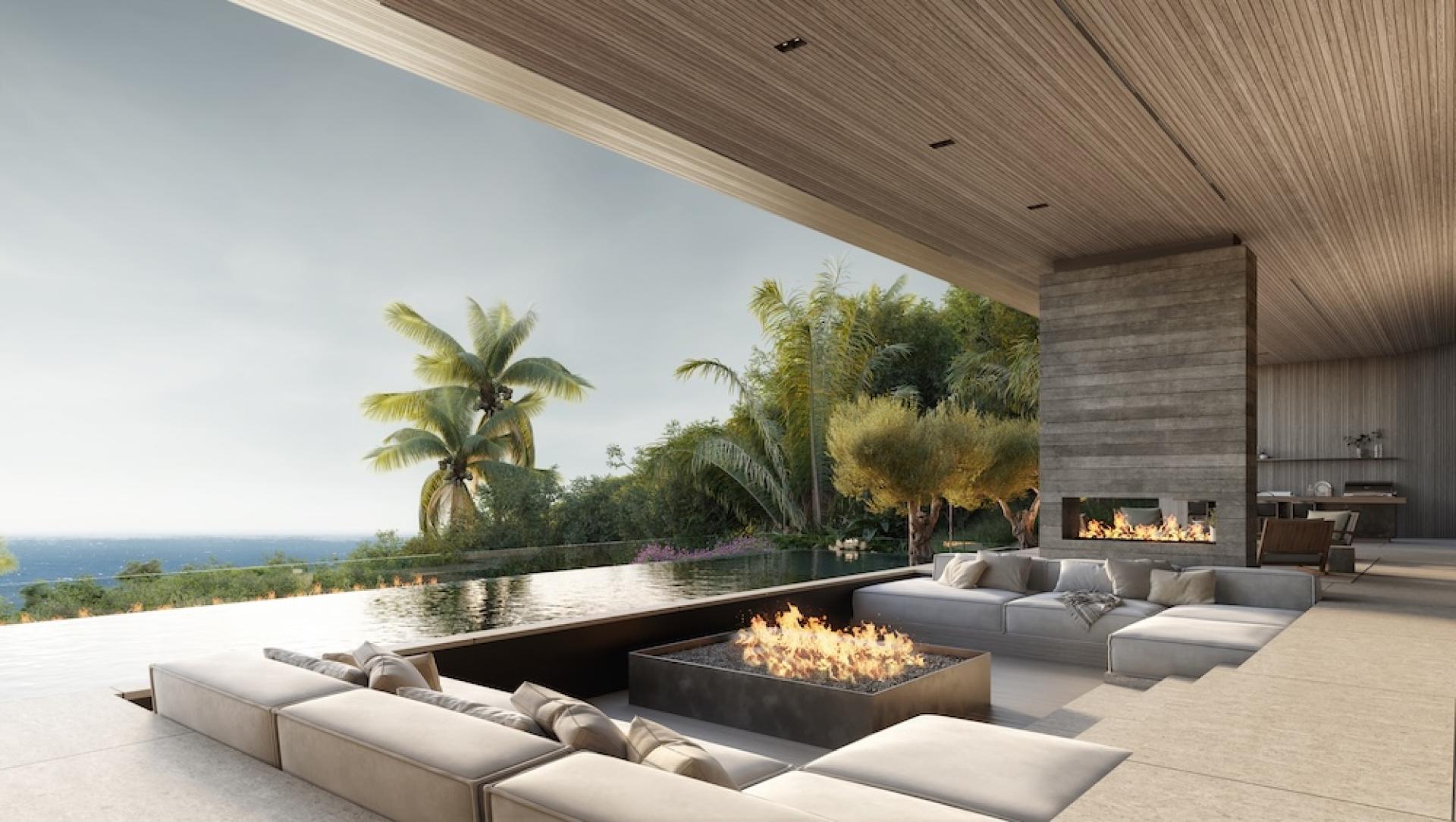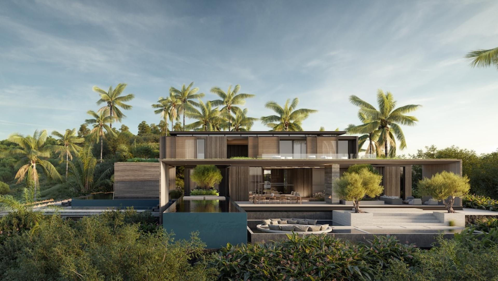 Arrival is orchestrated along a long gated driveway that gradually ascends the hillside, culminating in a cobblestone motor court that establishes the estate’s scale and character. The 14,000-square-foot main residence is conceived as a modern tropical compound organized around a series of indoor and outdoor living spaces. Expansive glazing, large sliding walls, and terraces allow the home to open fully to the surrounding ocean panorama while bringing natural light deep into the interior.