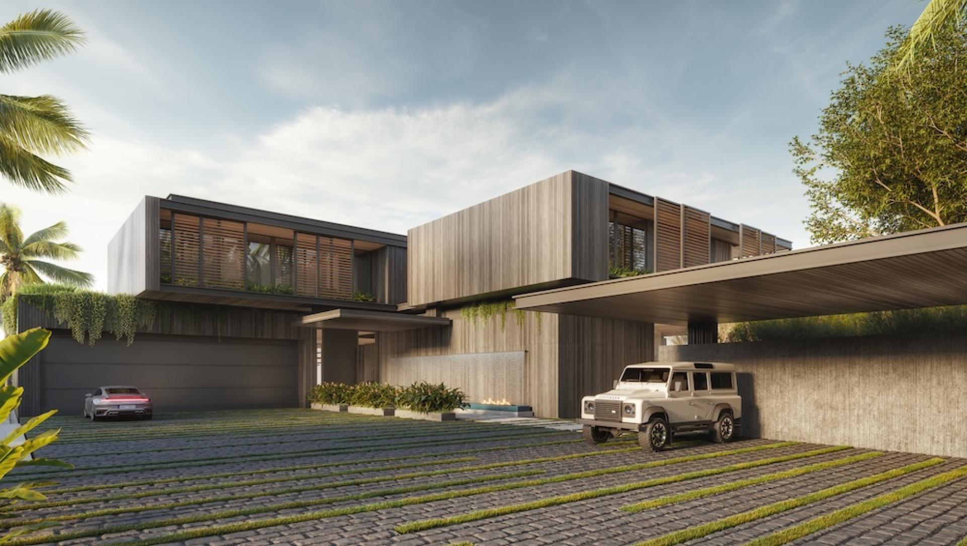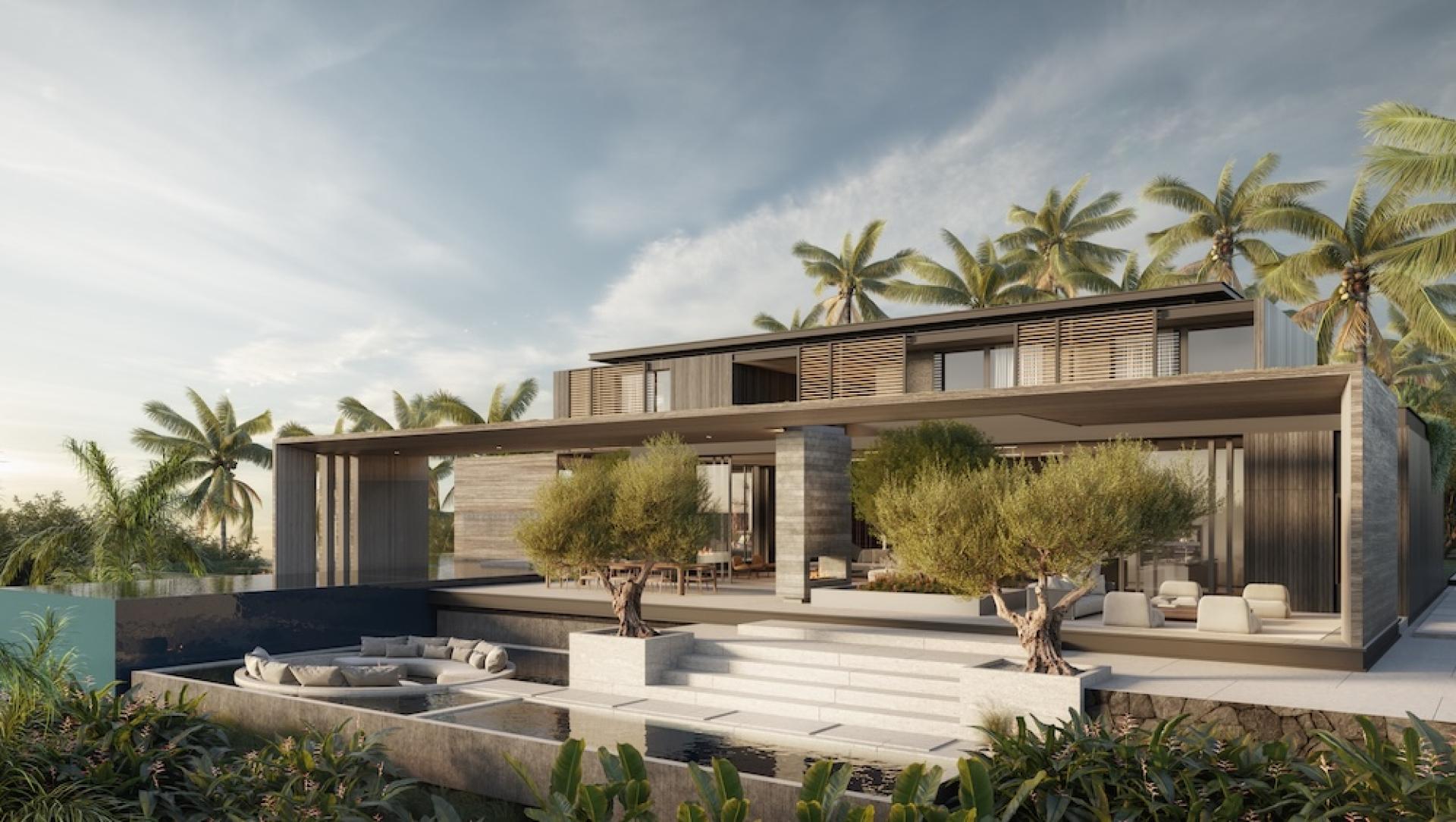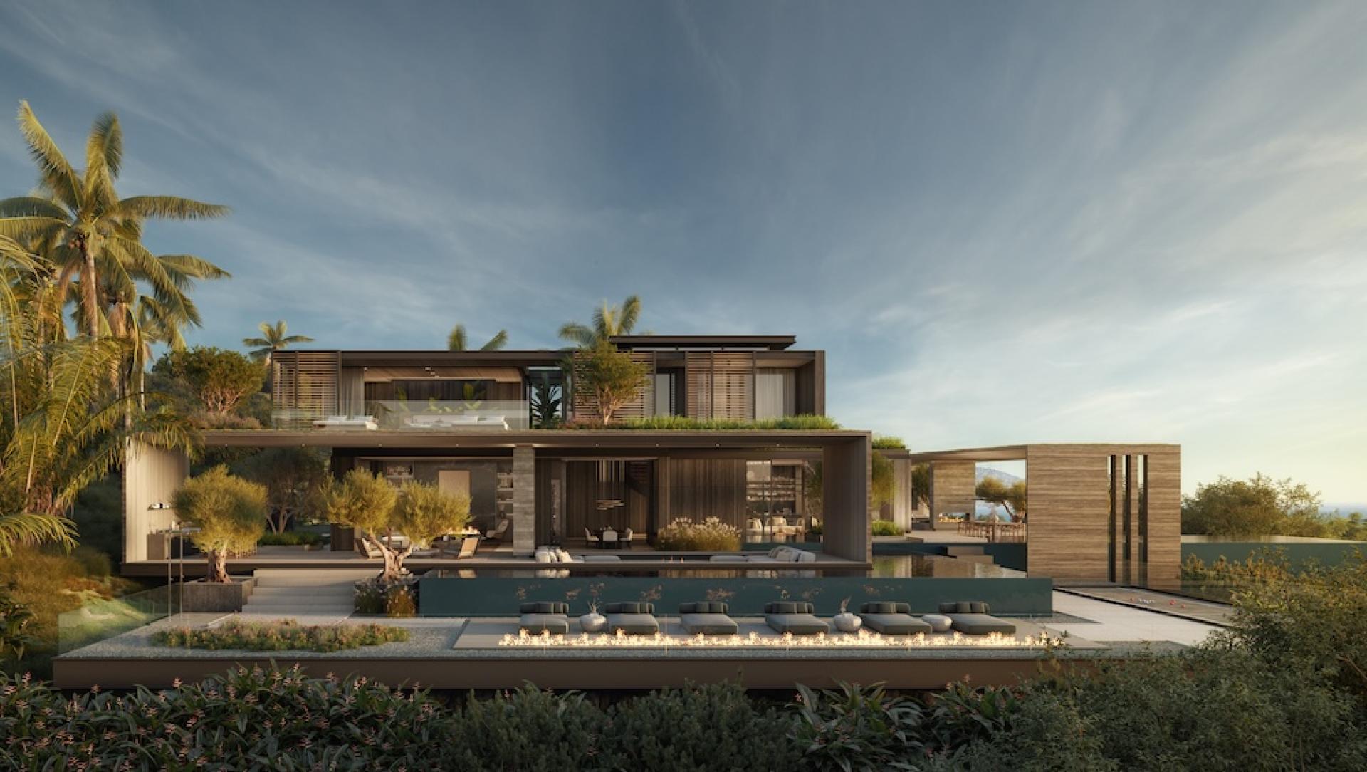 Arrival is orchestrated along a long gated driveway that gradually ascends the hillside, culminating in a cobblestone motor court that establishes the estate’s scale and character. The 14,000-square-foot main residence is conceived as a modern tropical compound organized around a series of indoor and outdoor living spaces. Expansive glazing, large sliding walls, and terraces allow the home to open fully to the surrounding ocean panorama while bringing natural light deep into the interior.