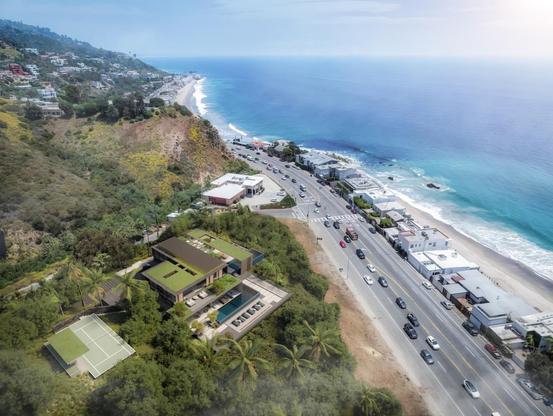 Perched high above the Pacific Coast Highway, Carbon Canyon Estate occupies a dramatic 3.25-acre coastal site in Malibu, offering sweeping 280-degree views of the Pacific Ocean. The estate is carefully oriented to capture both sunrise and sunset while maintaining complete privacy from the landscape below. Its design transforms a historic property—once home to a well-known celebrity compound lost in the Pacific Palisades and Malibu fires of January 2026—into a contemporary coastal retreat that blends modern architecture, wellness-oriented living, and a relaxed tropical sensibility.