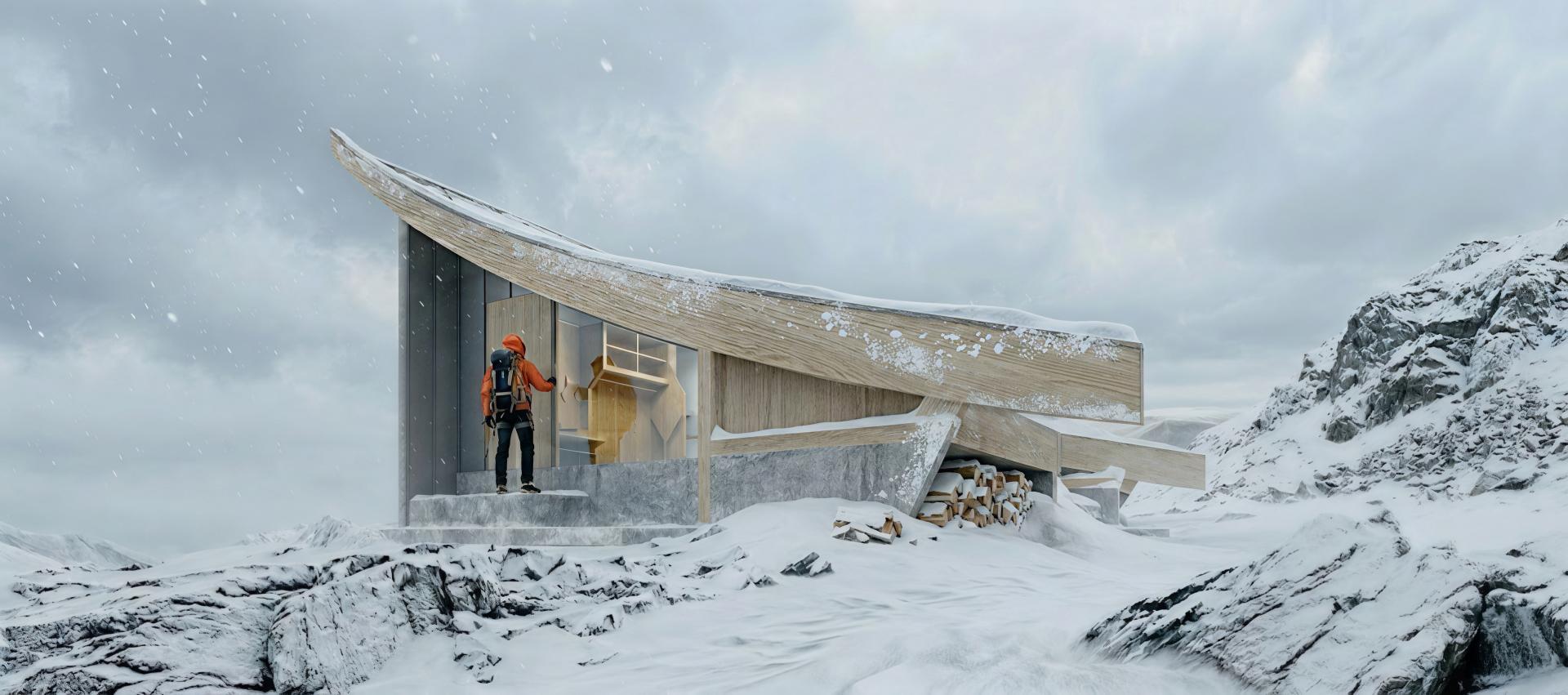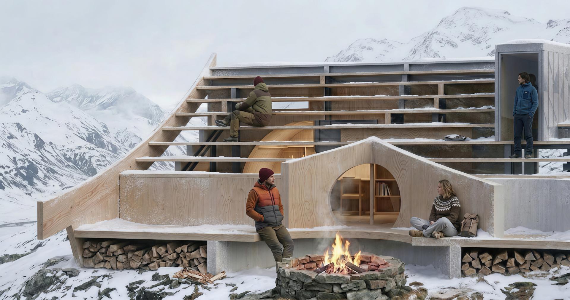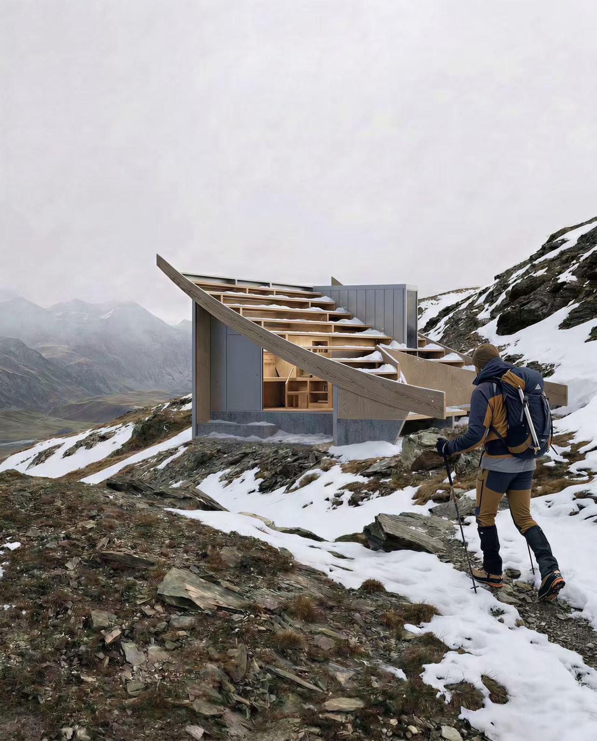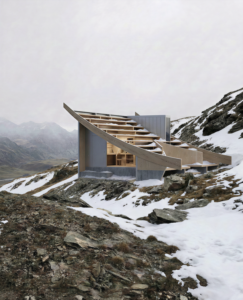 The architectural form is generated from a stepped roof that functions both as enclosure and viewing terrace, allowing climbers to rest, gather, and observe the surrounding mountains. Interior sleeping platforms are integrated into the structural system, reducing material use while maximizing spatial efficiency. The building is elevated without permanent foundations and designed to be relocated after several years, allowing the original site to recover naturally.